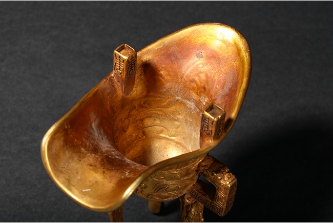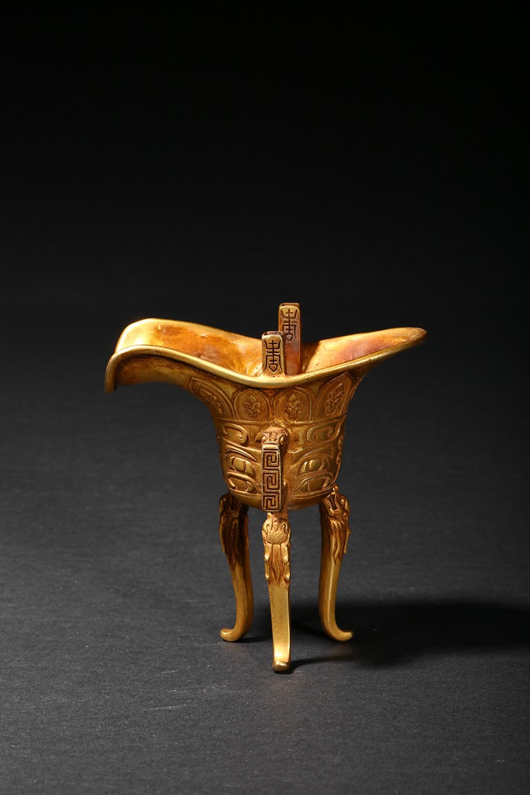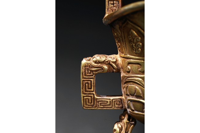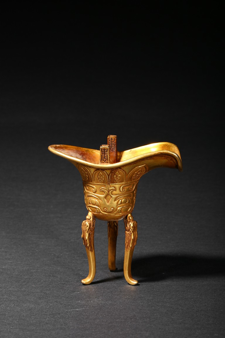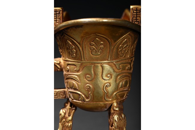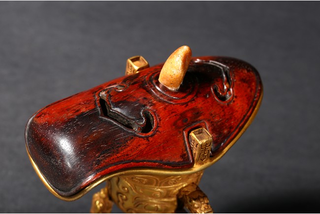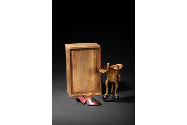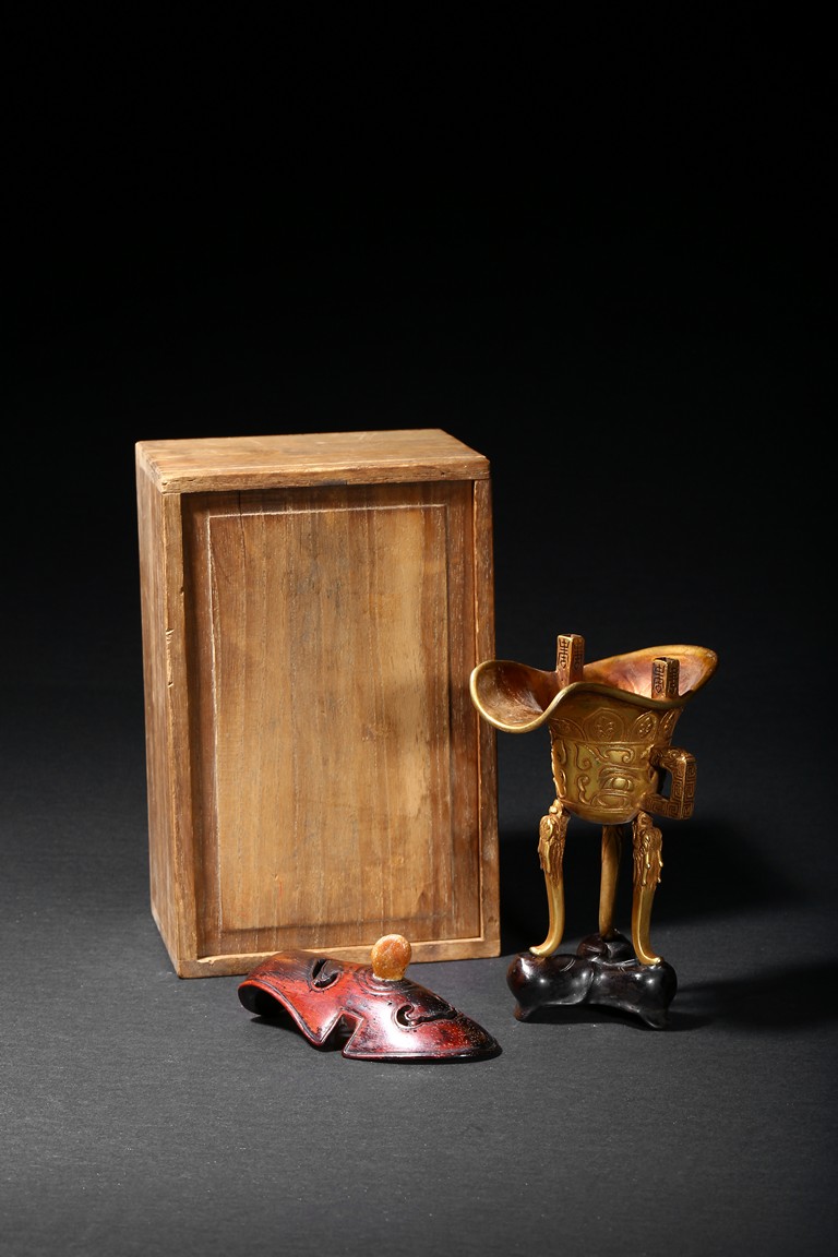 The globular body rising from three dragon mask cabriole legs, supporting the central body with flared rim and extended open spout. One handle incised mythical beast mask. rosewood cover surmounted by jade finial. Supported on rosewood stand. Qing Dynasty period.
