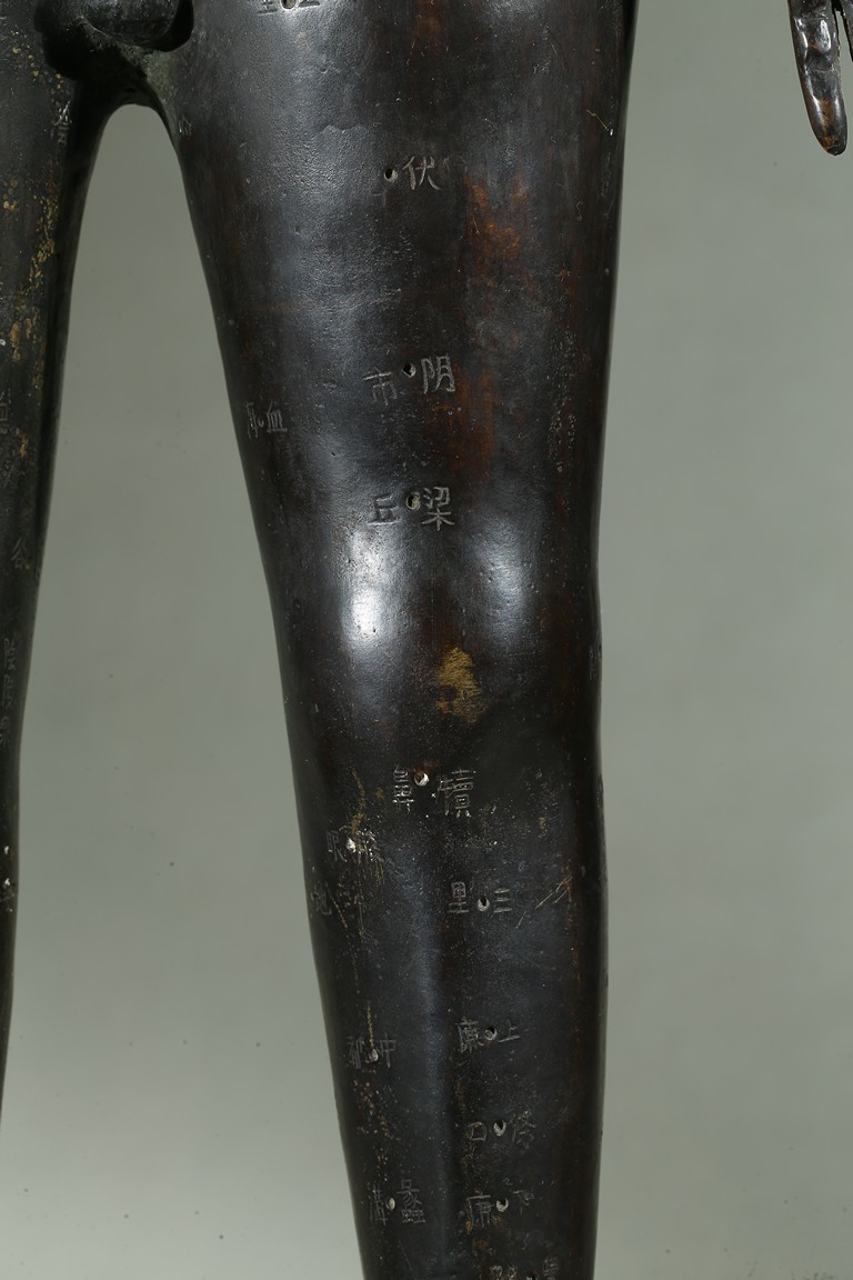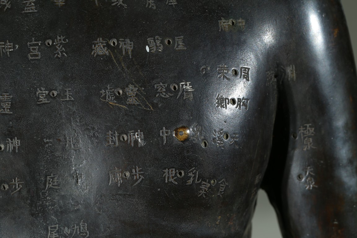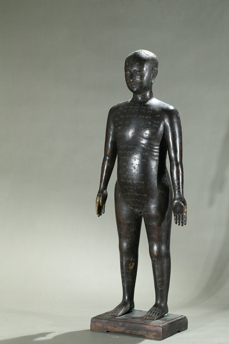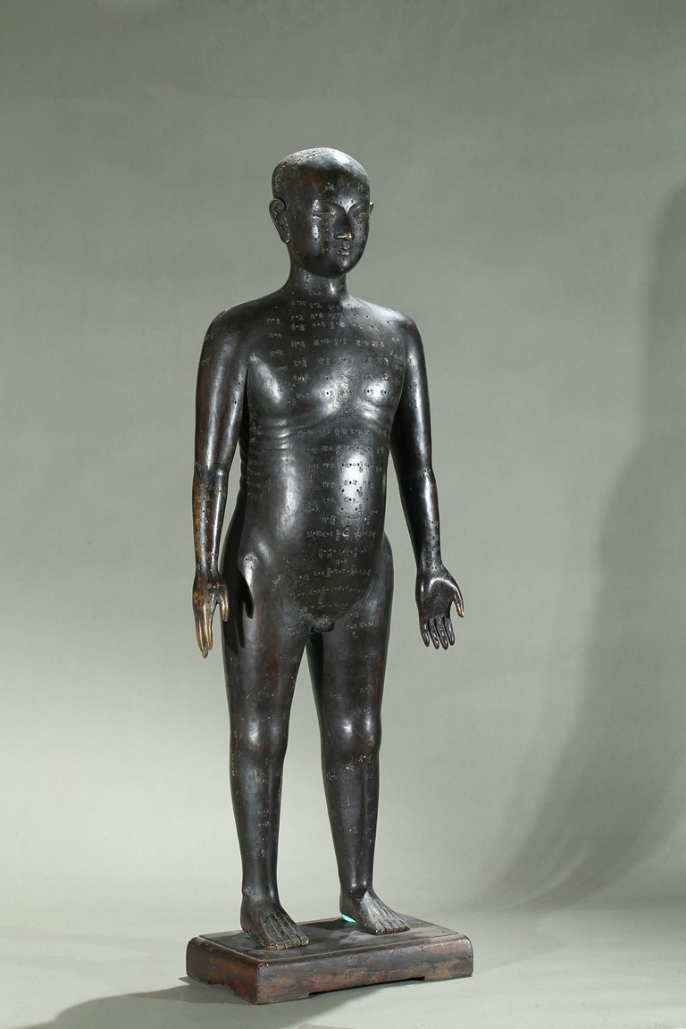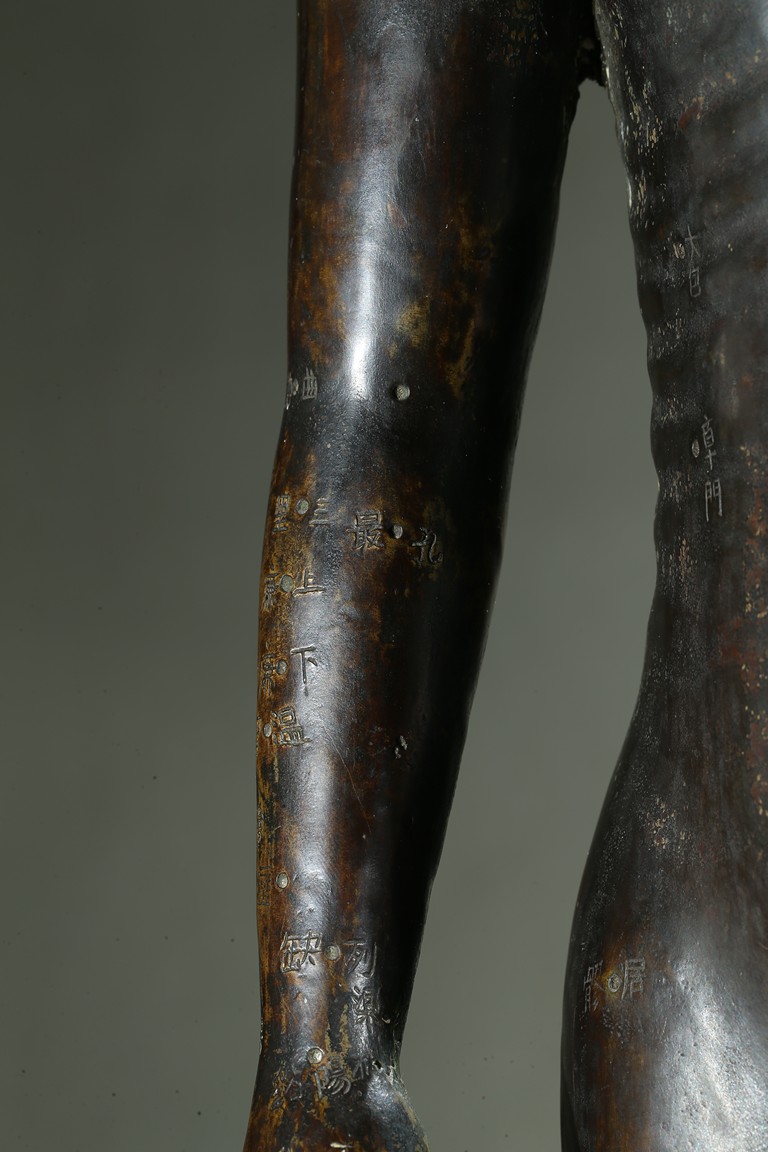 The figure is cast standing upright, his body and head overall pierced with spots for positions and name of acupuncture needle points, all supported on a wood stand. Ming Dynasty period.
