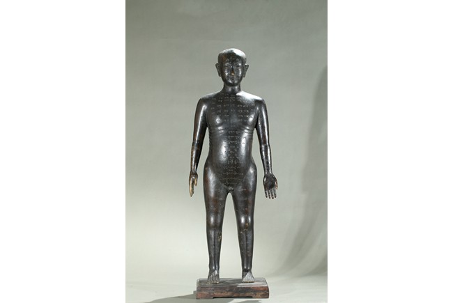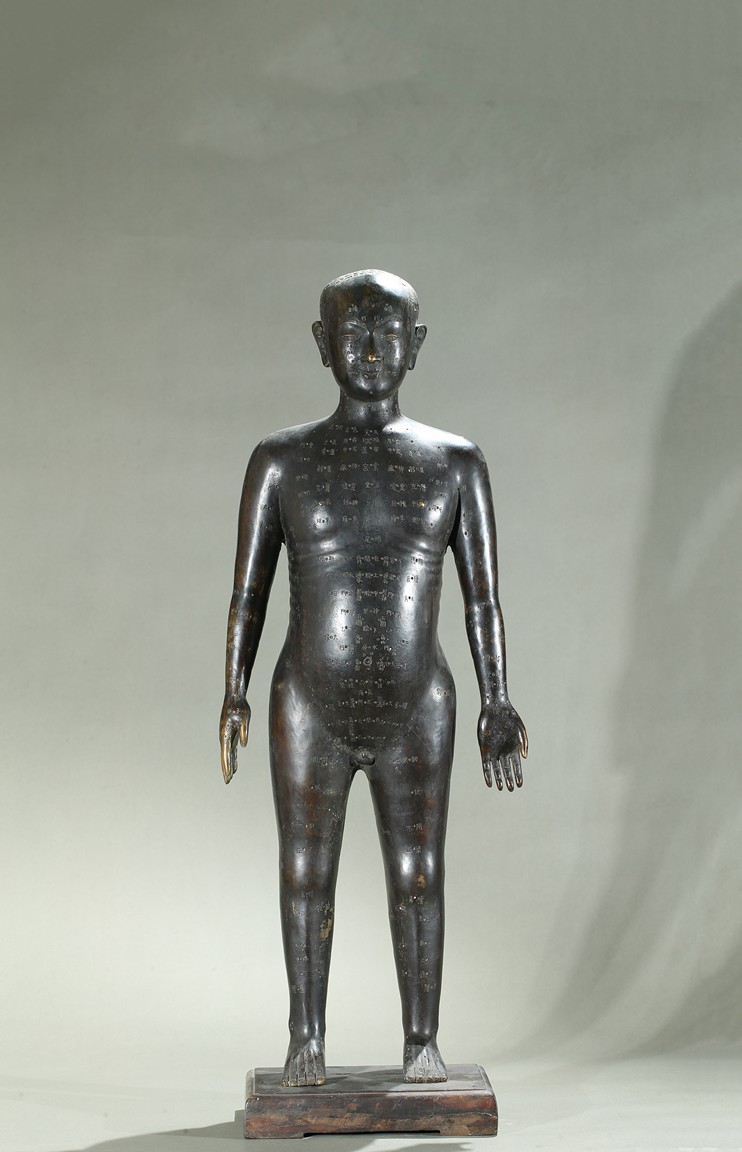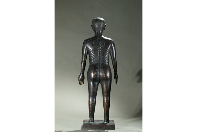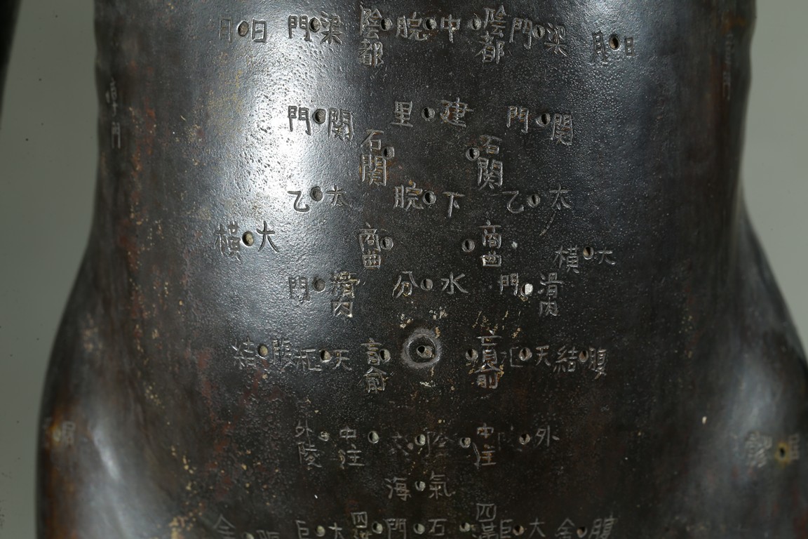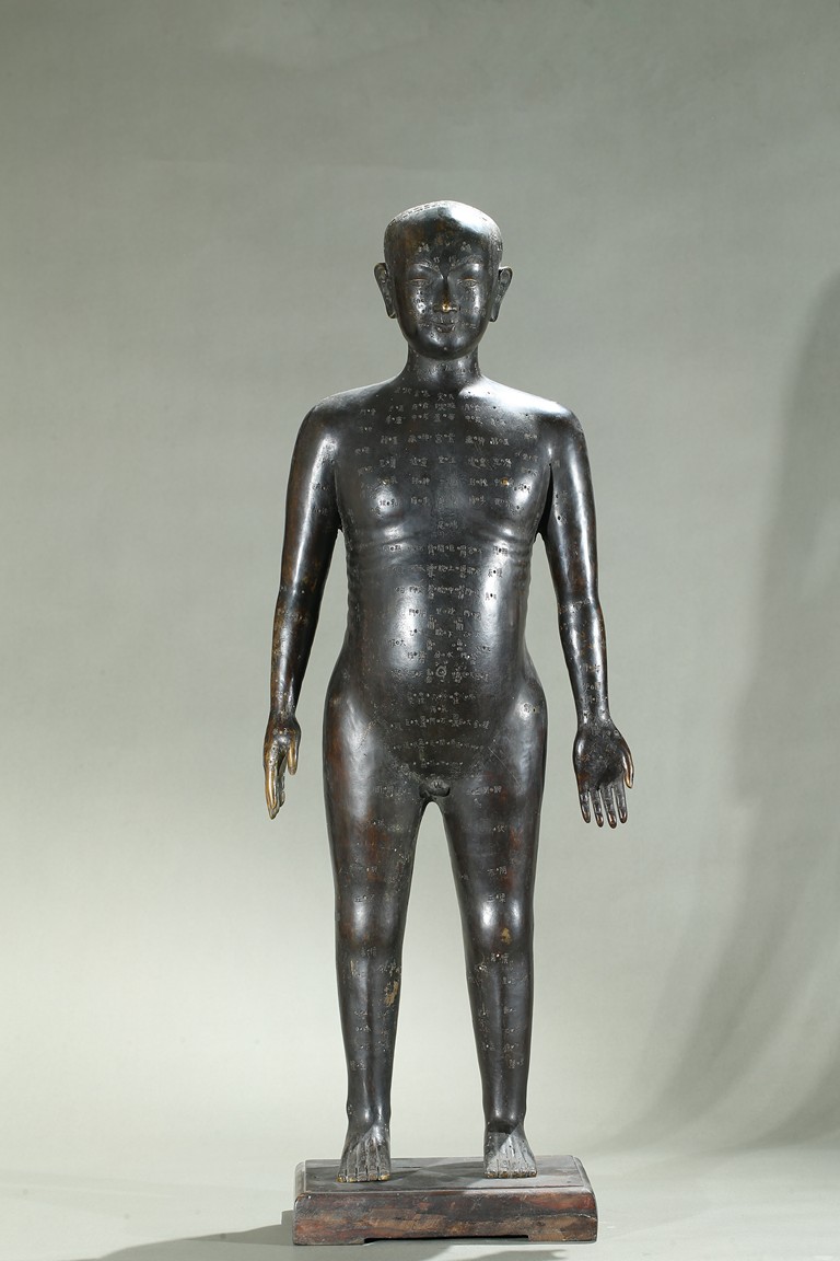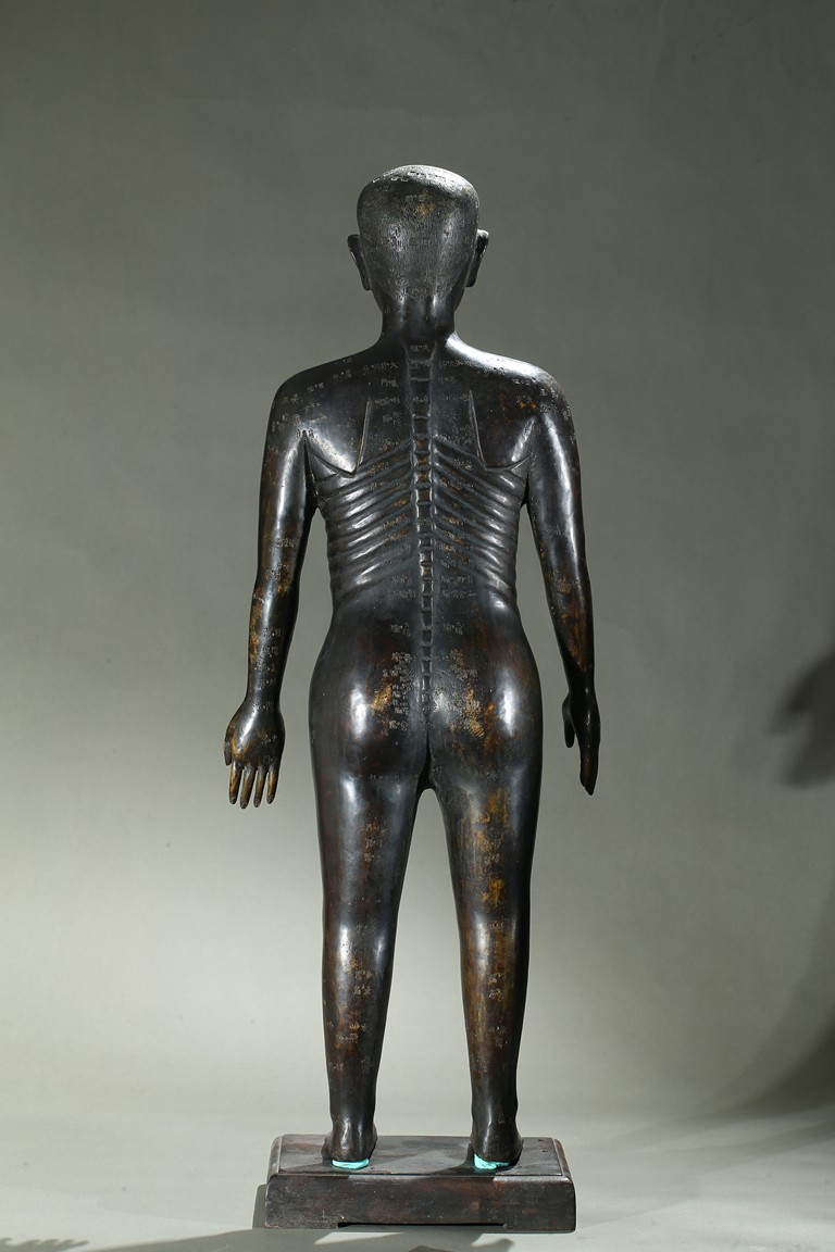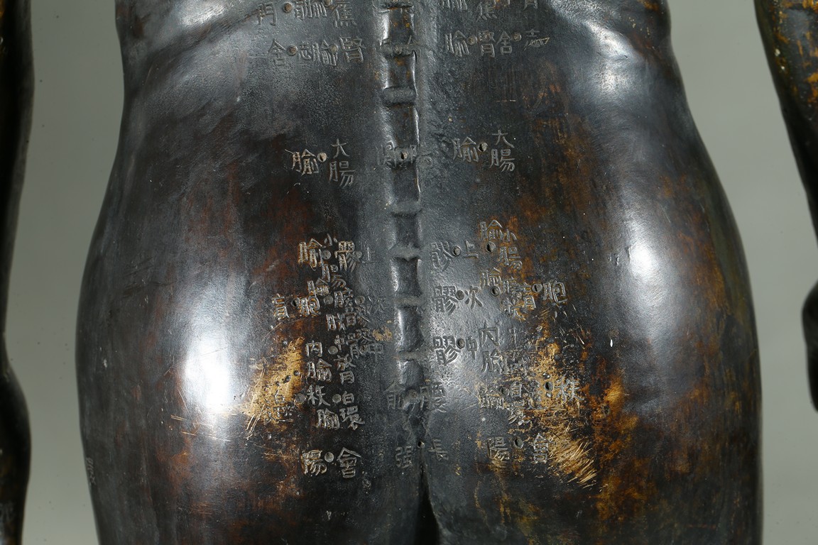 The figure is cast standing upright, his body and head overall pierced with spots for positions and name of acupuncture needle points, all supported on a wood stand. Ming Dynasty period.
