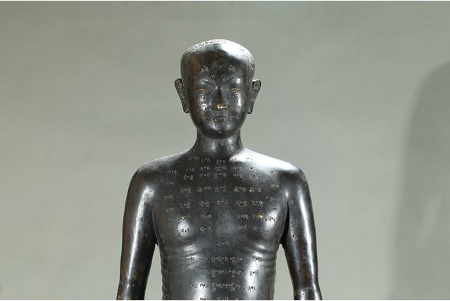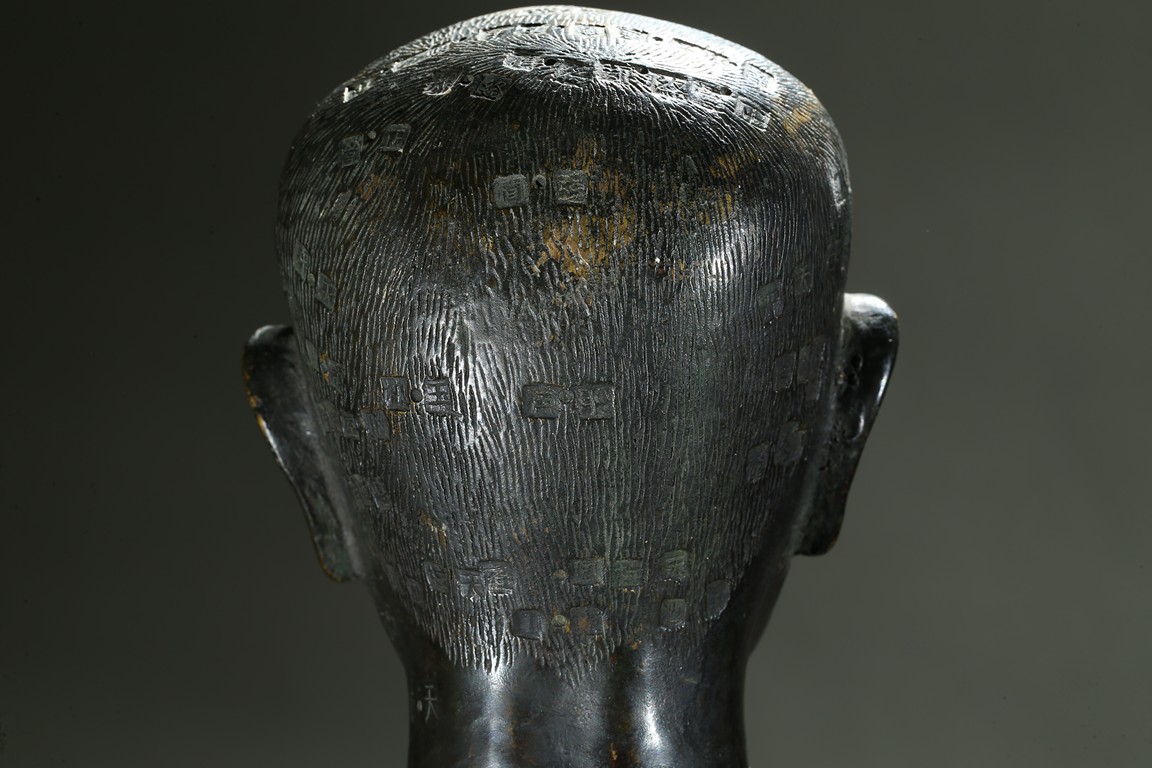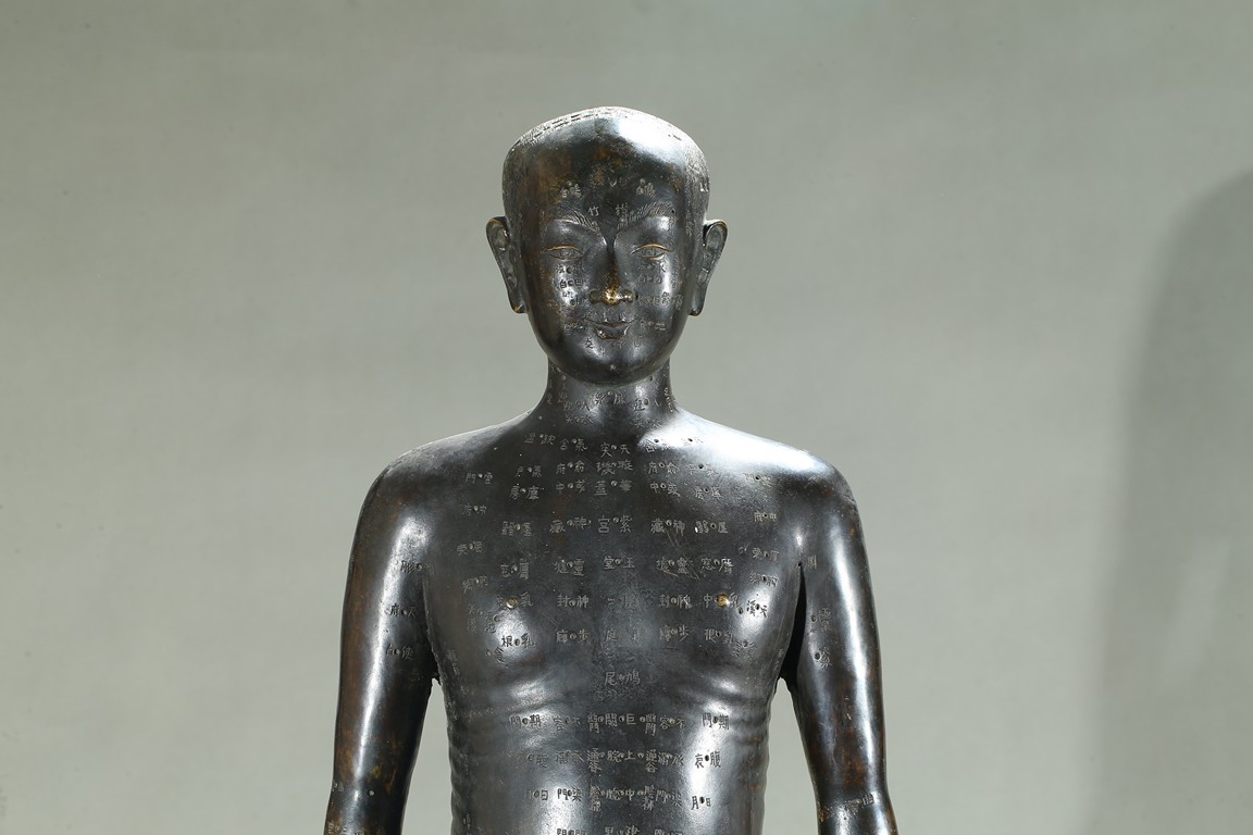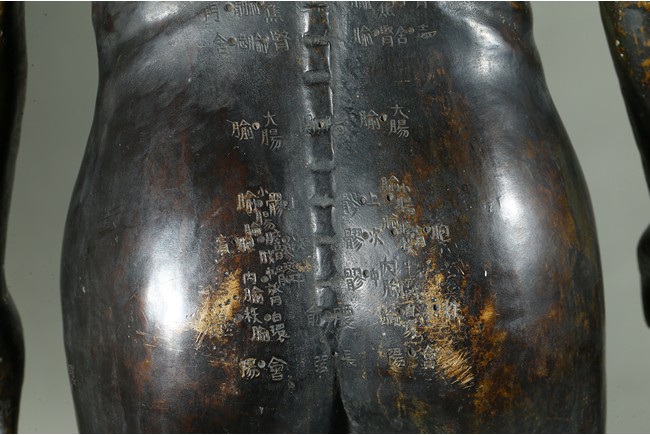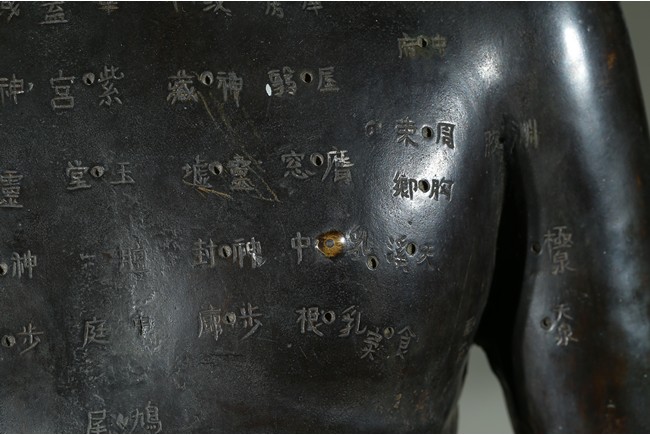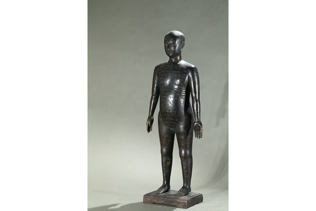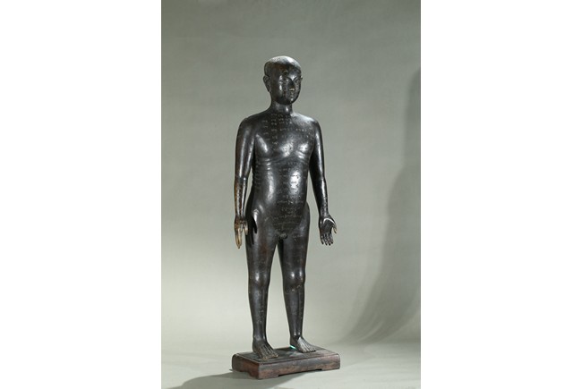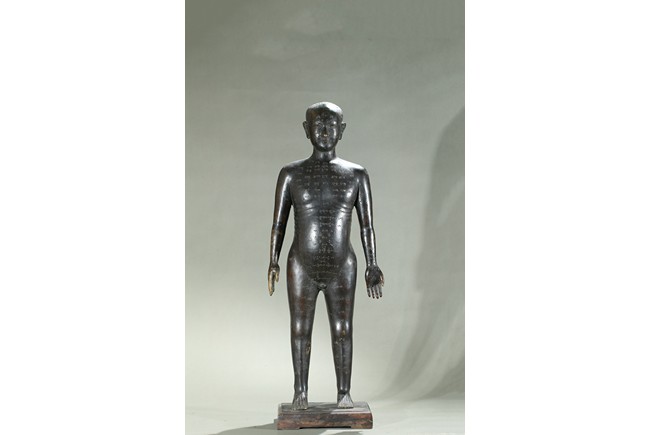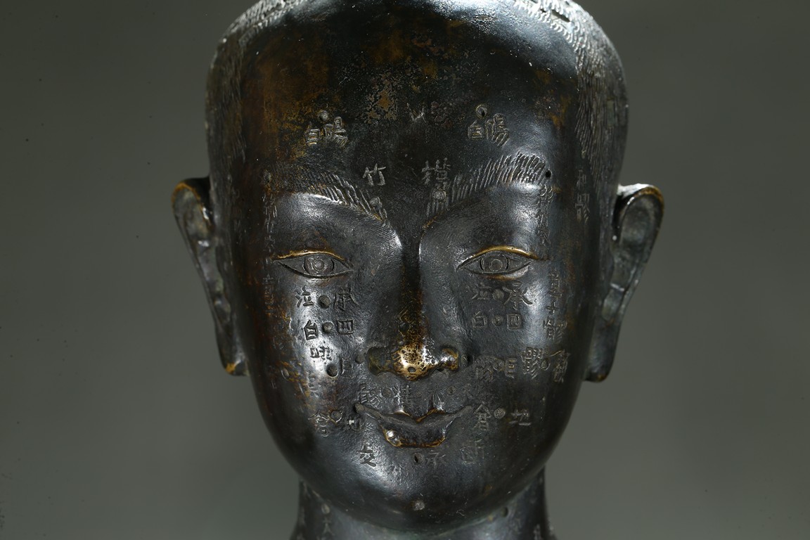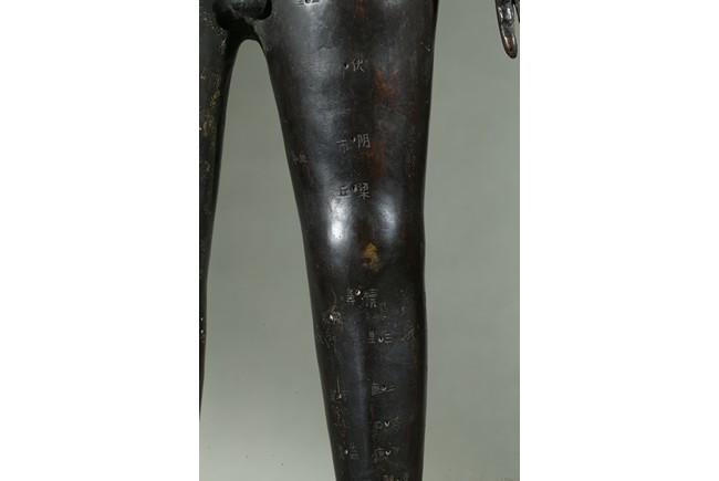 The figure is cast standing upright, his body and head overall pierced with spots for positions and name of acupuncture needle points, all supported on a wood stand. Ming Dynasty period.