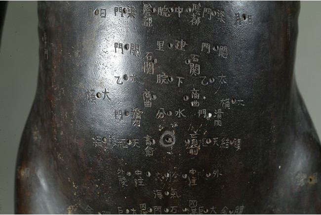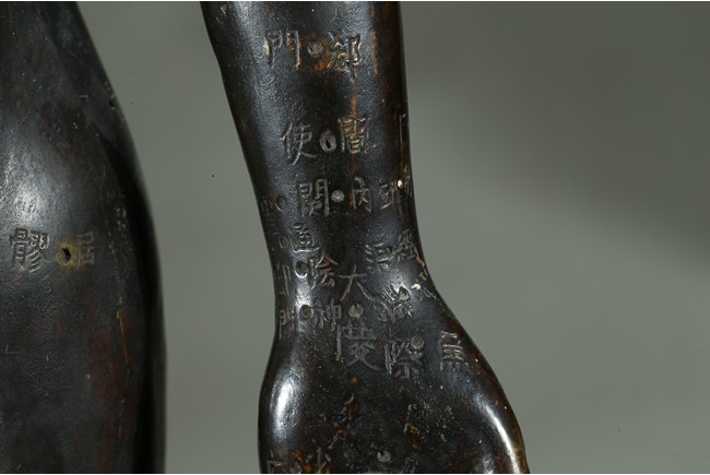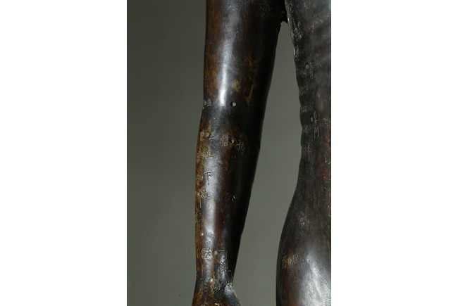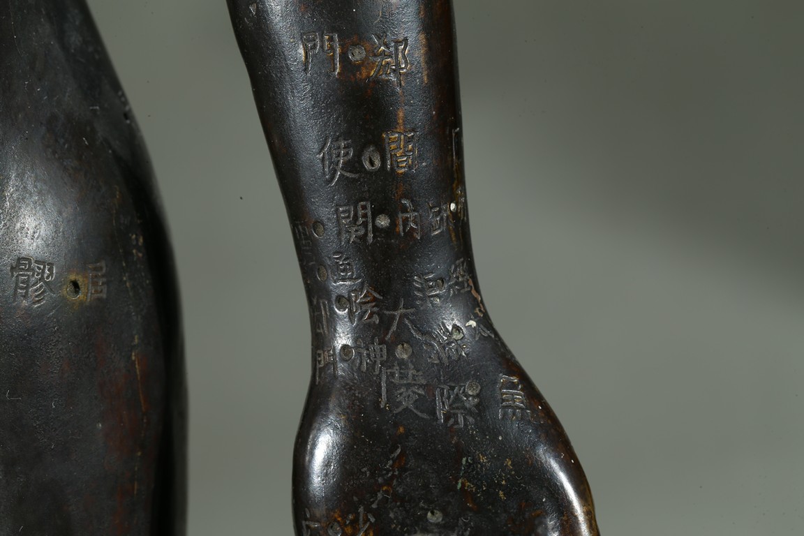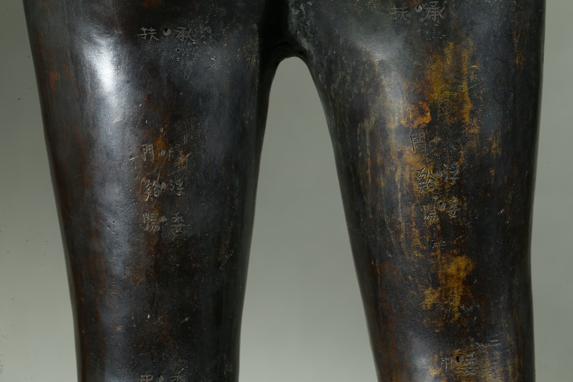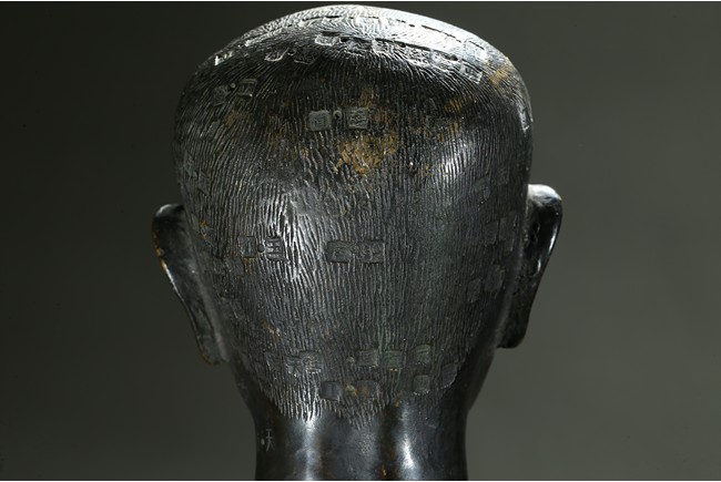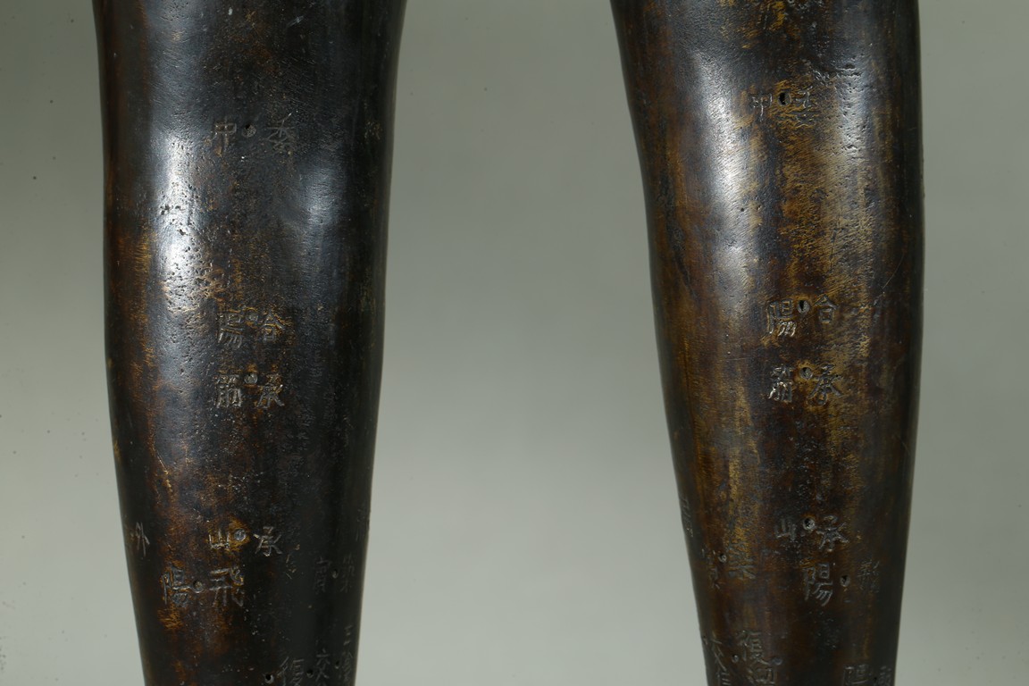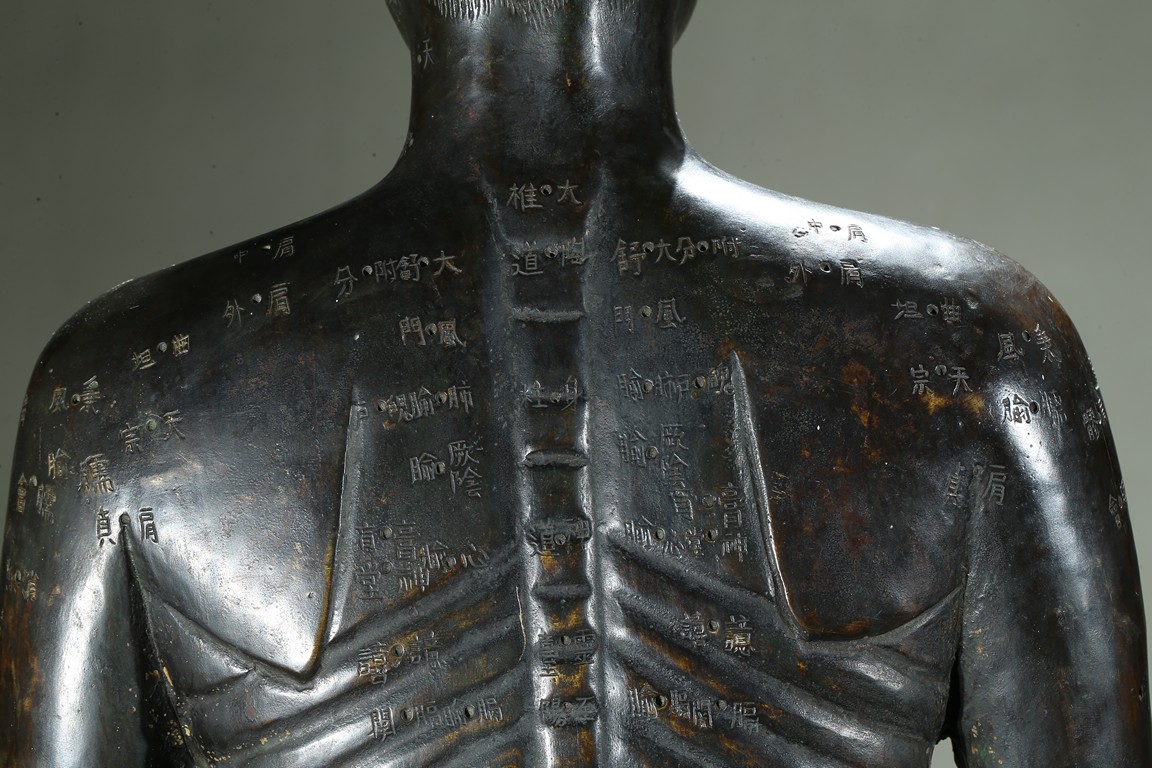 The figure is cast standing upright, his body and head overall pierced with spots for positions and name of acupuncture needle points, all supported on a wood stand. Ming Dynasty period.