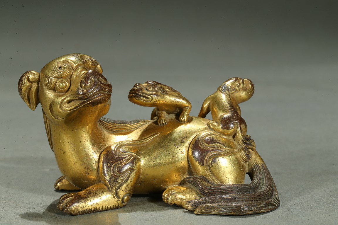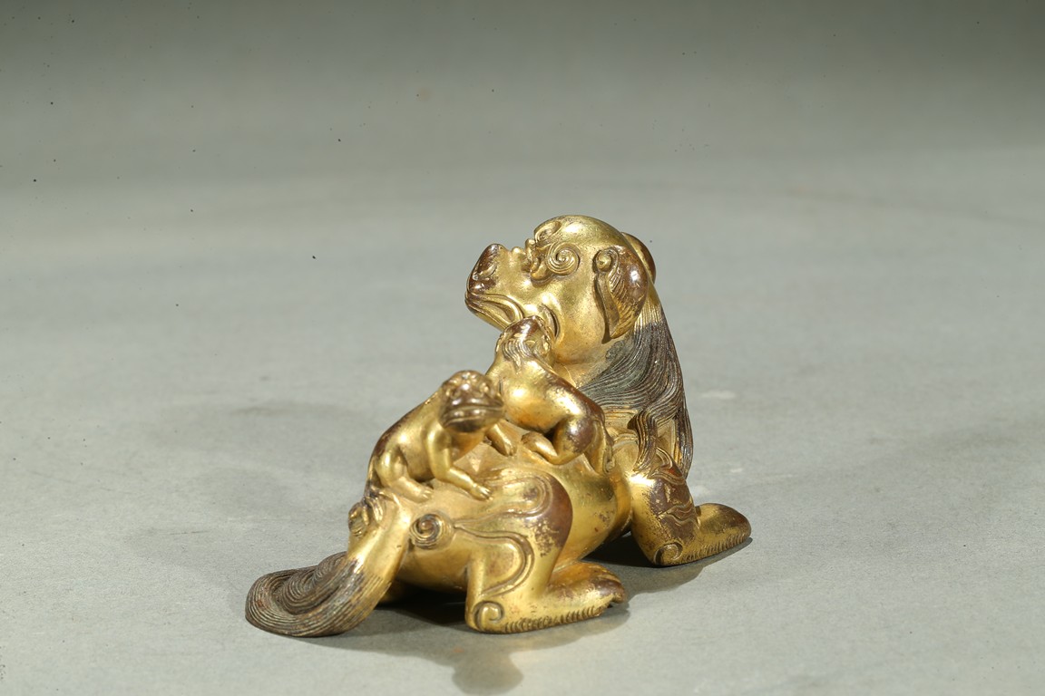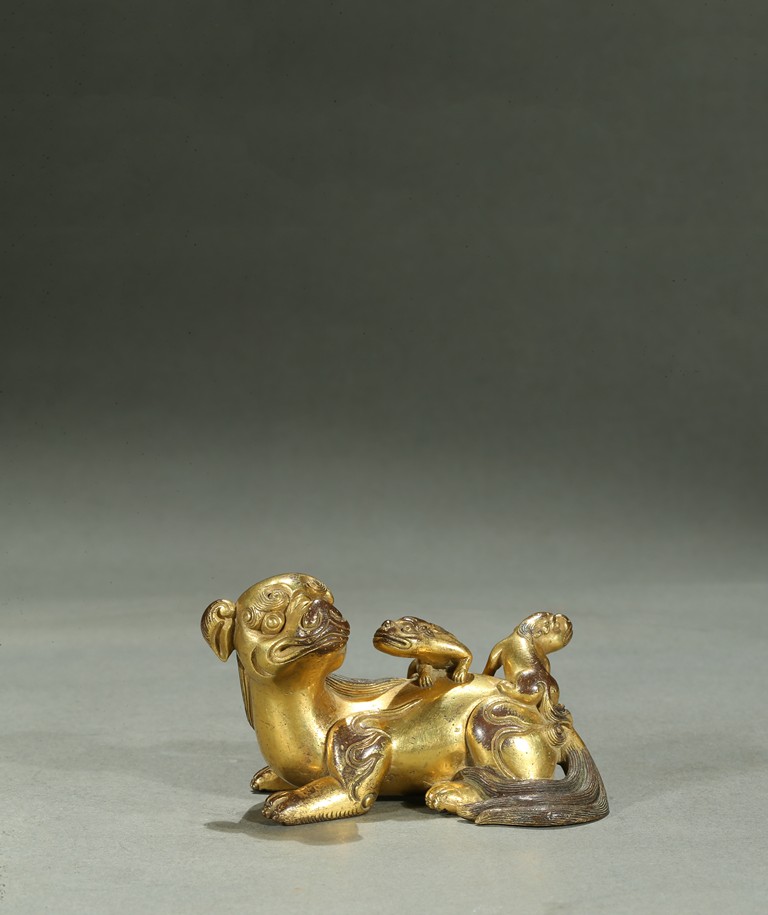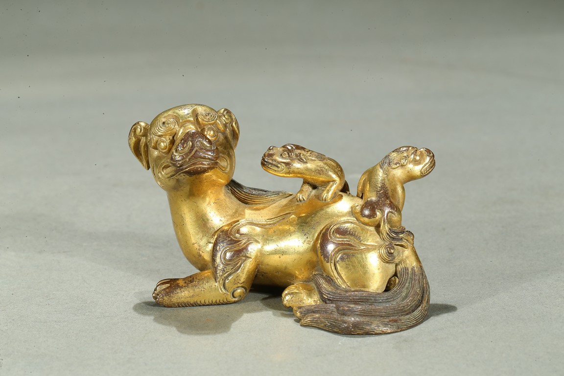 The paperweight finely modelled in the form a recumbent mythical beast, head turned to the side, with bulging rounded eyes and powerful nose, the mane and eyebrows finely detailed with incised lines, with two playful small cubs clambering on its back. Qing Dynasty period.