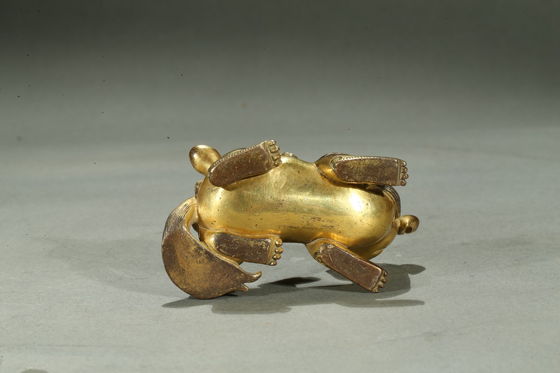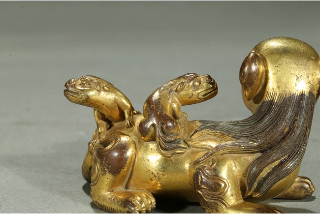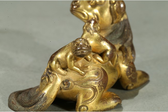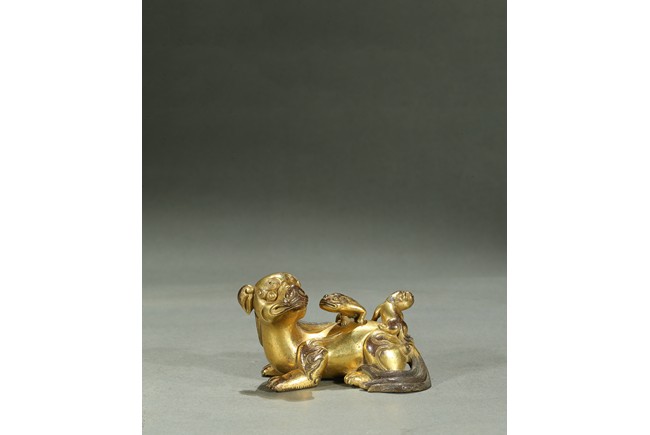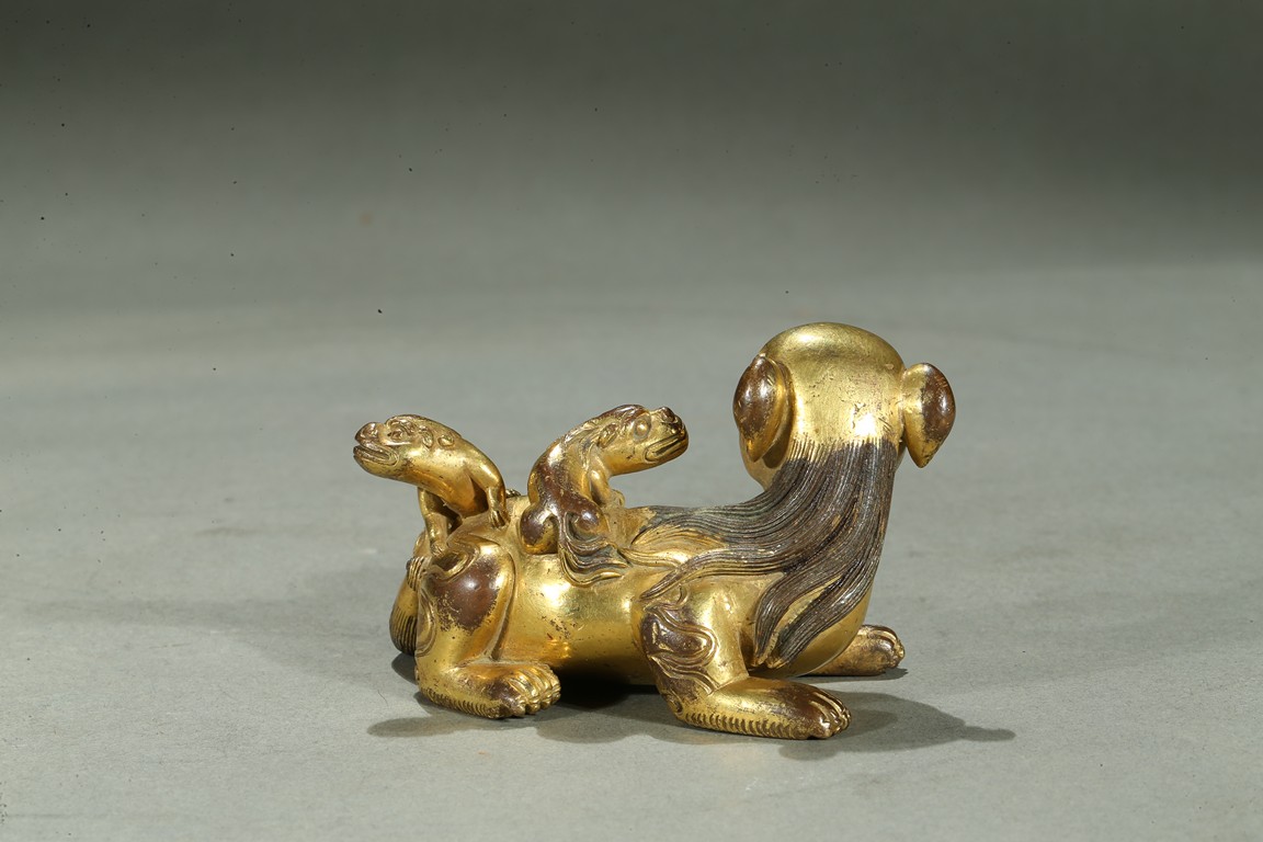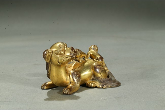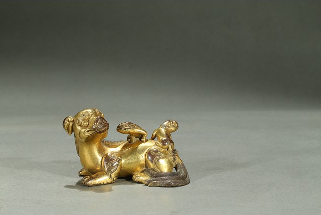 The paperweight finely modelled in the form a recumbent mythical beast, head turned to the side, with bulging rounded eyes and powerful nose, the mane and eyebrows finely detailed with incised lines, with two playful small cubs clambering on its back. Qing Dynasty period.