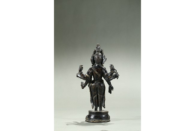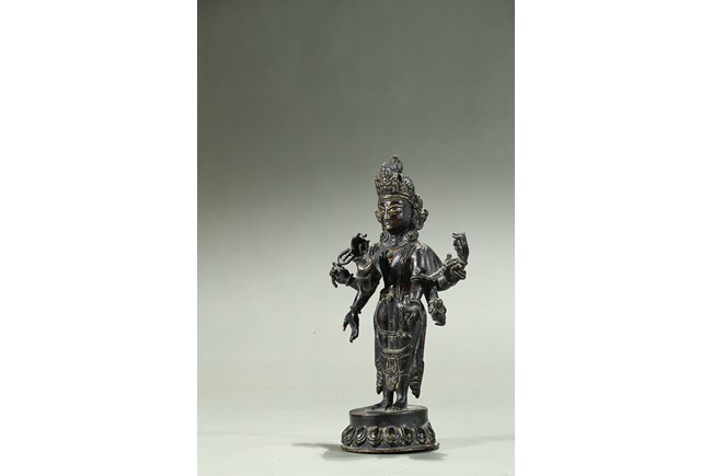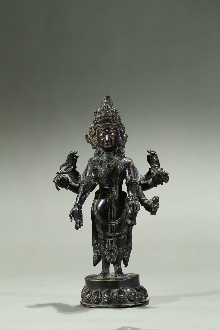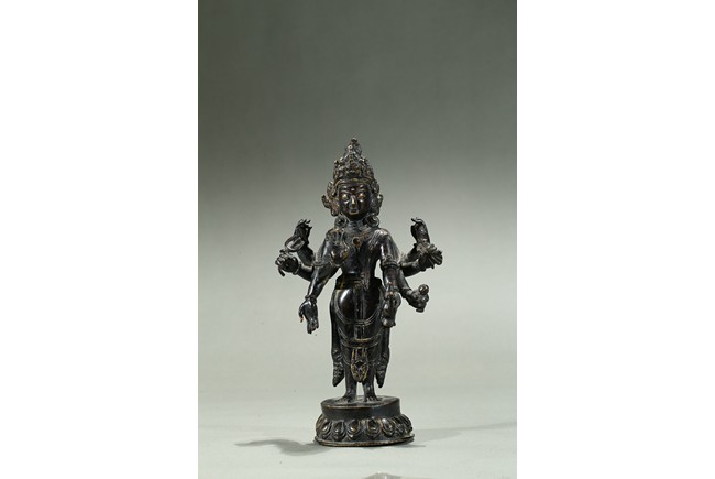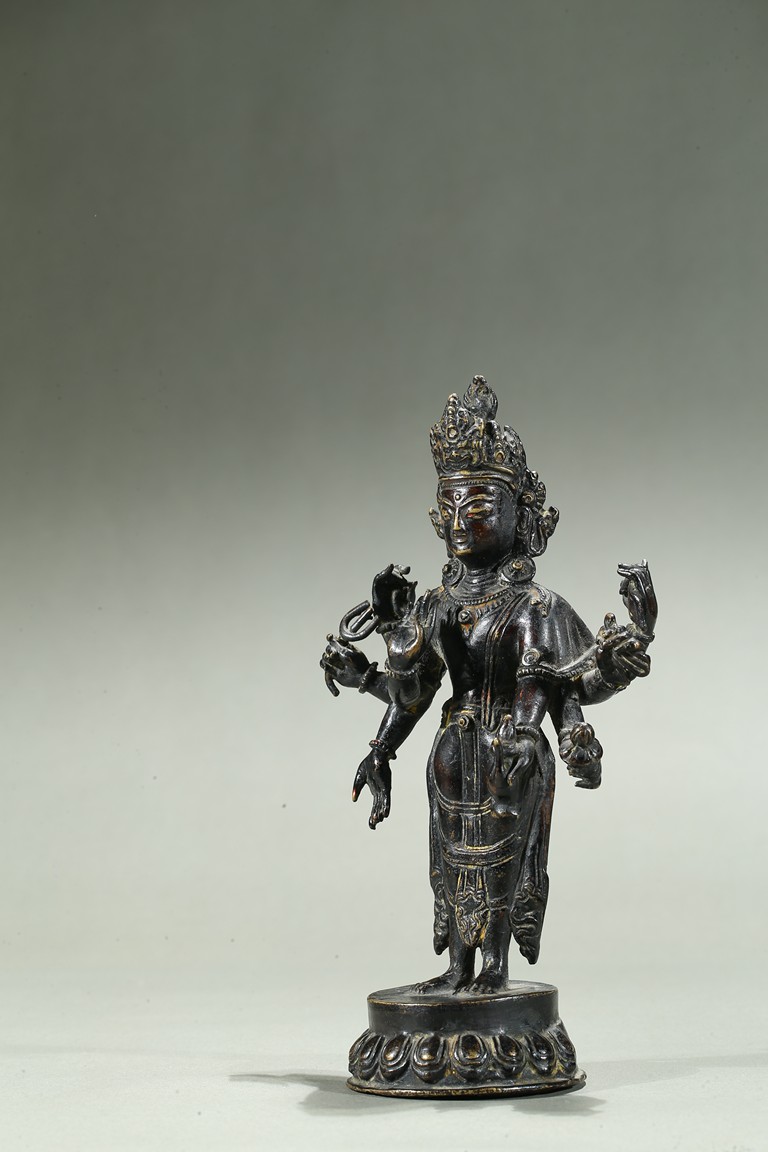 The deity is shown standing upon a lotus throne, wearing loose fitting dhoti and adorned with beaded necklace, his hands holding various ritual attributes, with a serene face framed by pointed crown enclosing high chignon. 16th century.