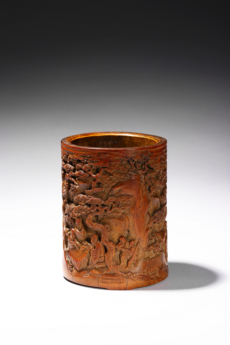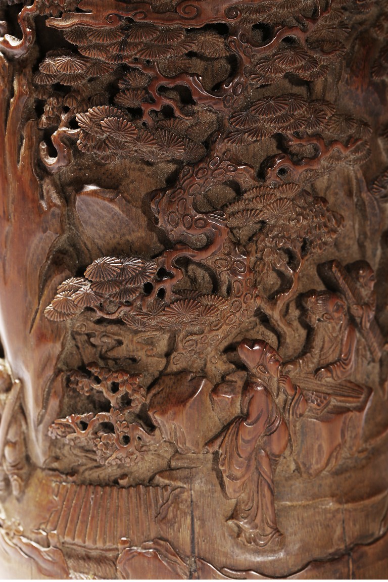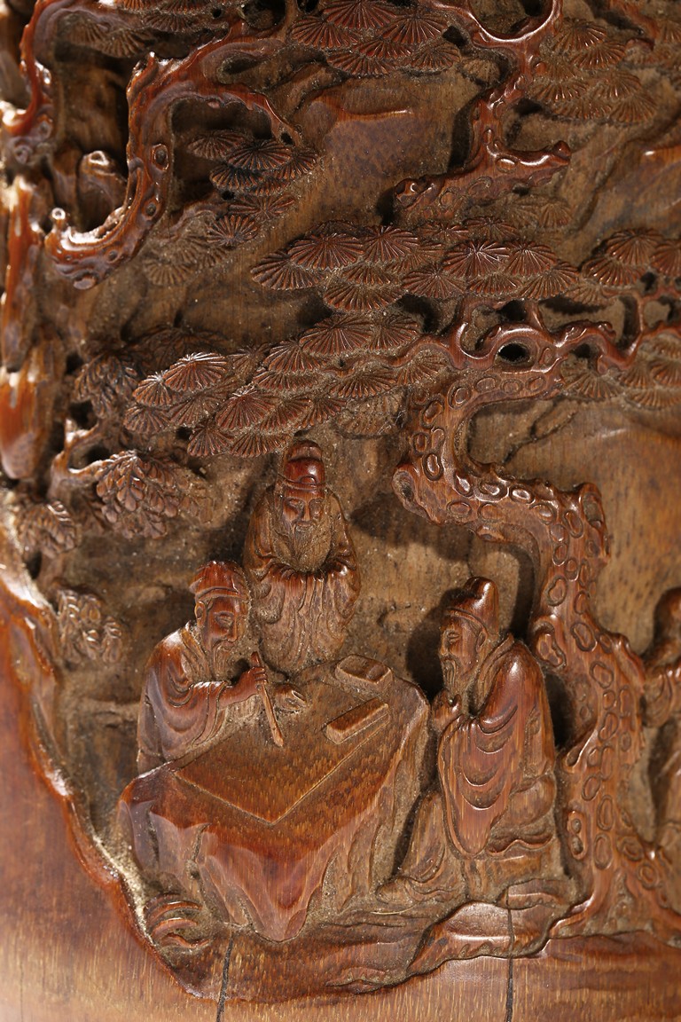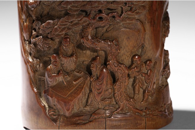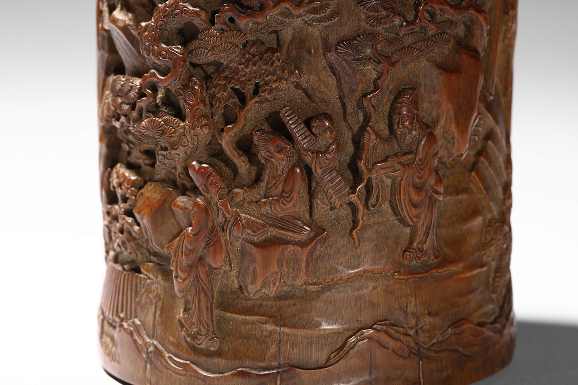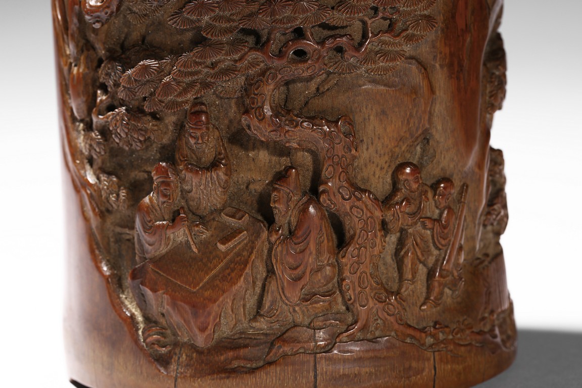 Of cylindrical form, finely carved in high relief with a continuous scene of six sage and three children under a large pine tree. One side with two sage sitting around a table, one practicing calligraphy, the other sage standing nearby. Two attendants behind; on the other side, one sage is playing the qin a child hold a qin behind him, while another sage stands in front. One sage carries a bundle of scrolls. Qing Dynasty period.