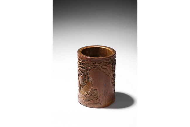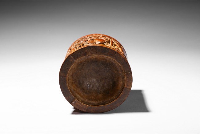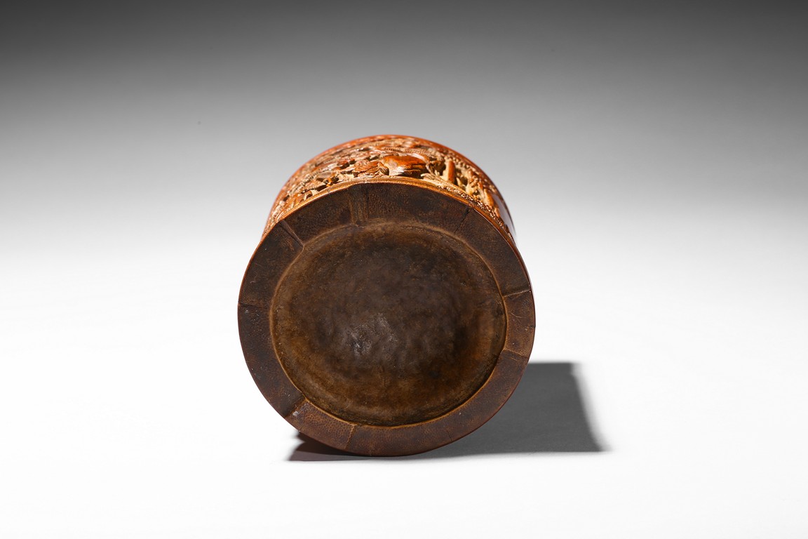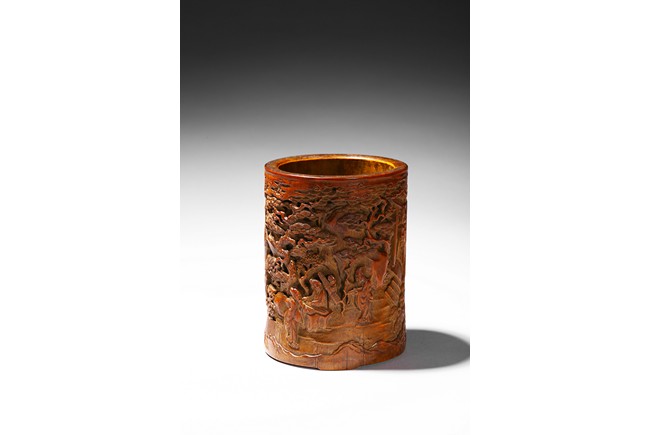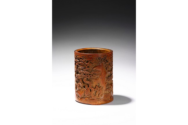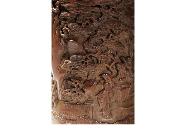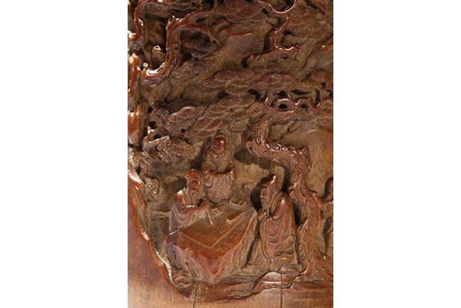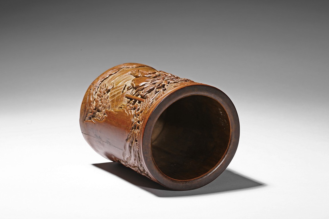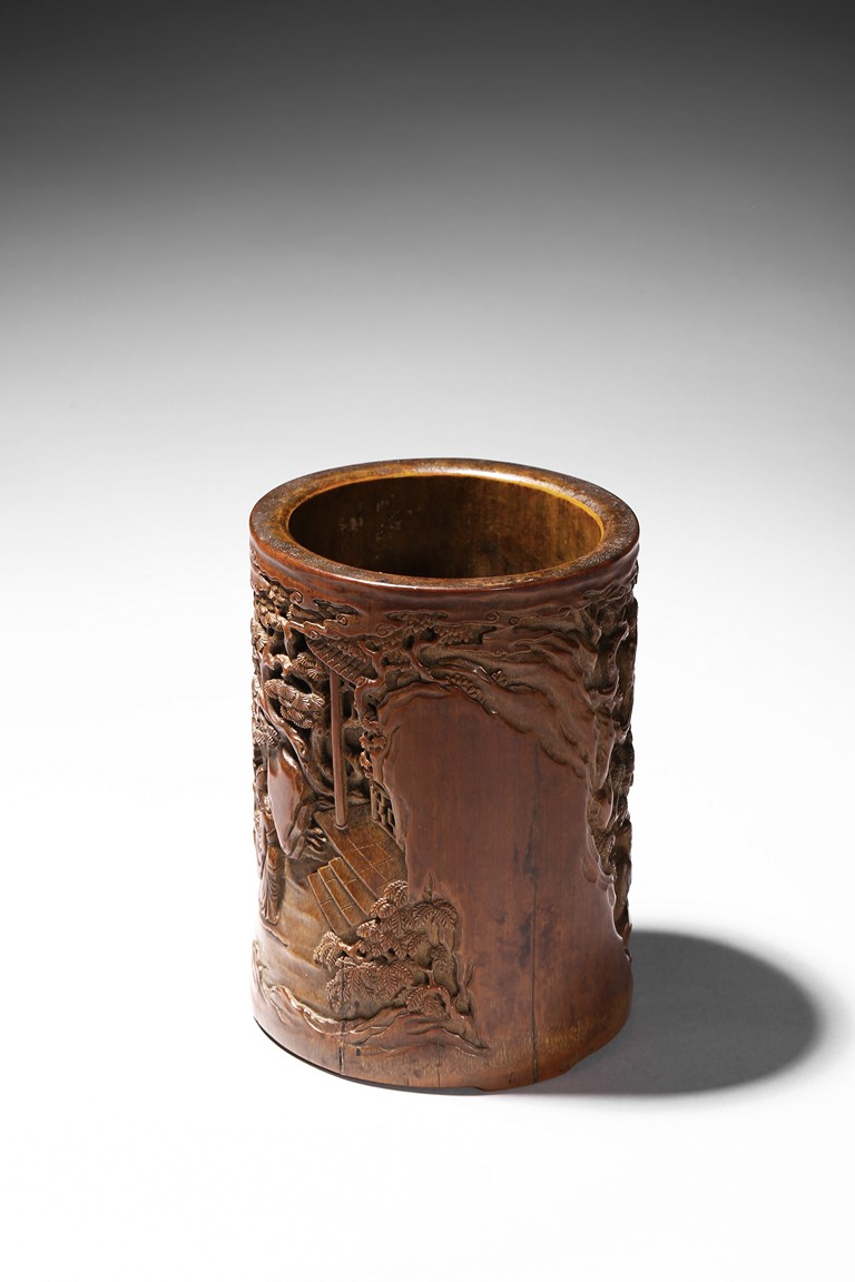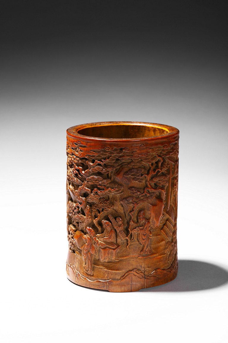 Of cylindrical form, finely carved in high relief with a continuous scene of six sage and three children under a large pine tree. One side with two sage sitting around a table, one practicing calligraphy, the other sage standing nearby. Two attendants behind; on the other side, one sage is playing the qin a child hold a qin behind him, while another sage stands in front. One sage carries a bundle of scrolls. Qing Dynasty period.