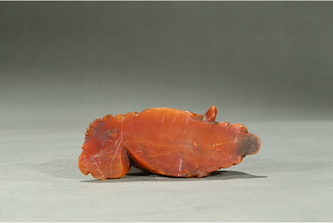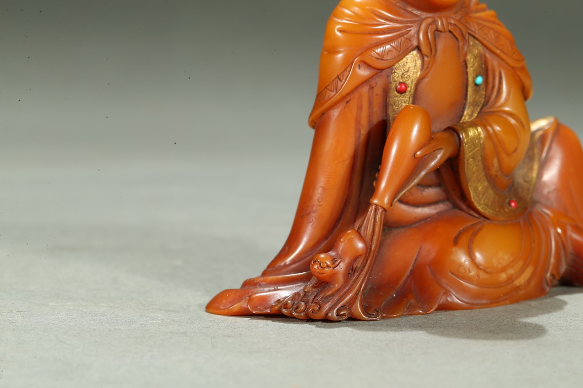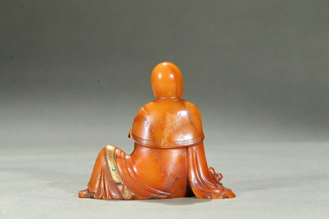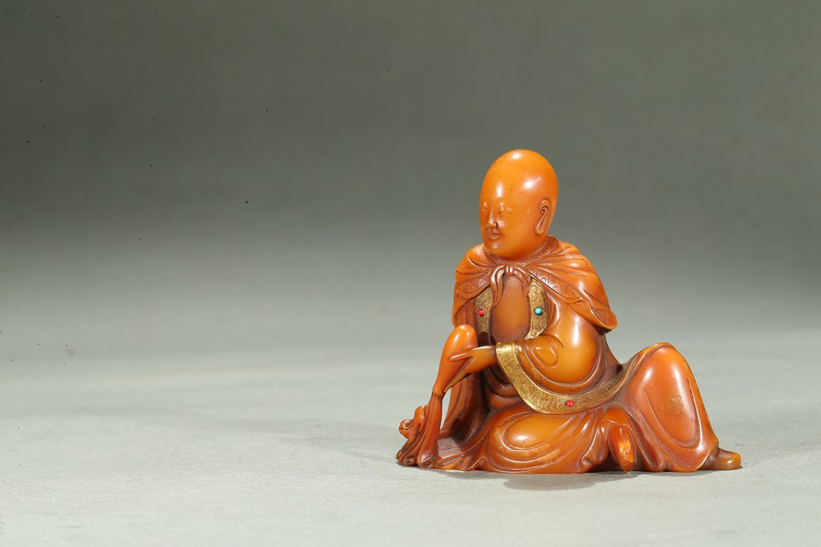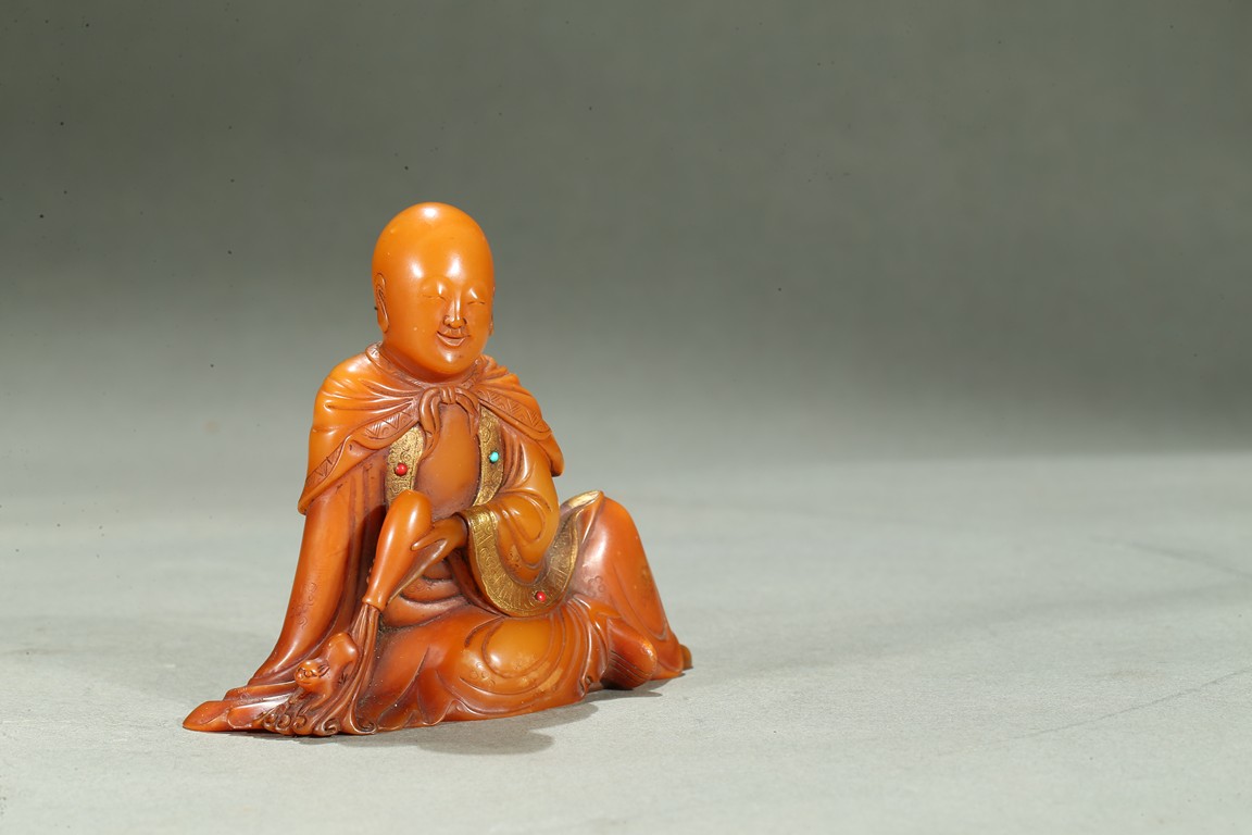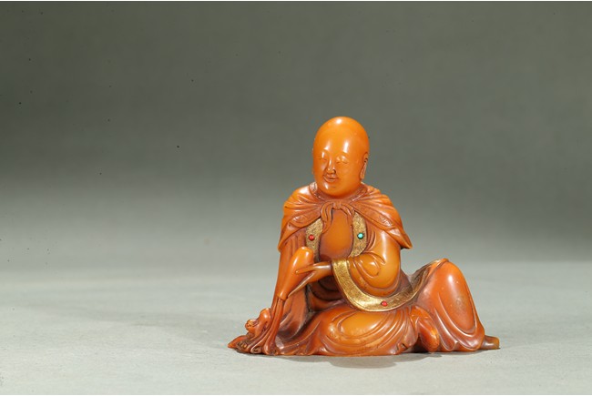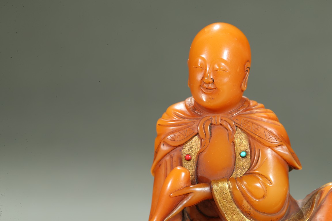 The luohan shown seated casually with left knee raised, depicted dressed in loose robe with hems incised with scroll pattern on gilt-painted ground and embellished with tiny coral and turquoise beads, face with mild smile, his left hand flipping a vase, further carved with a small cub on the water stream pouring from the vase. Late Qing Dynasty period.