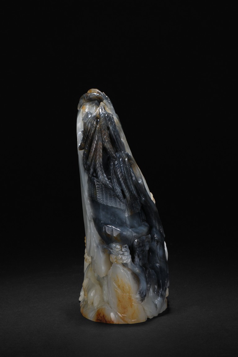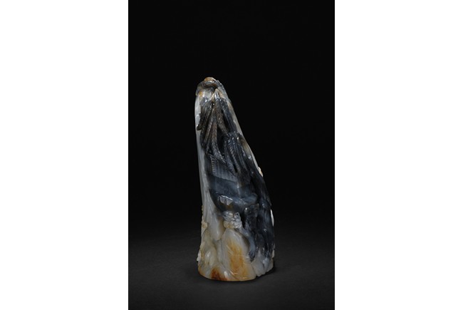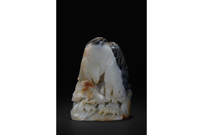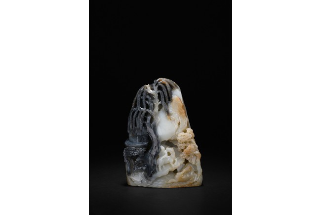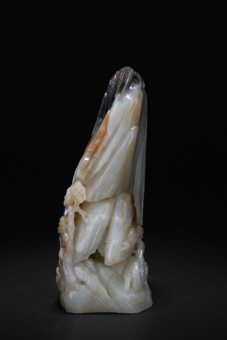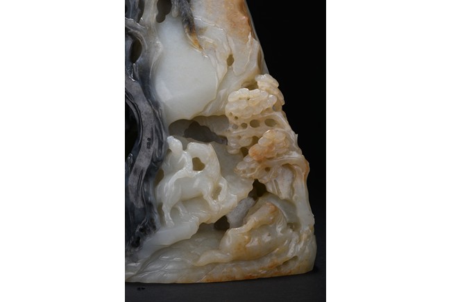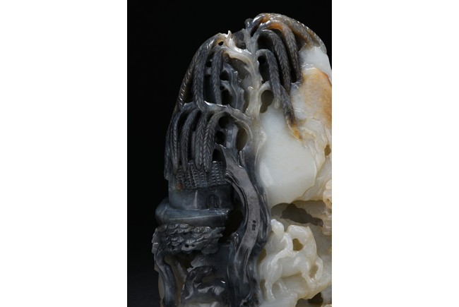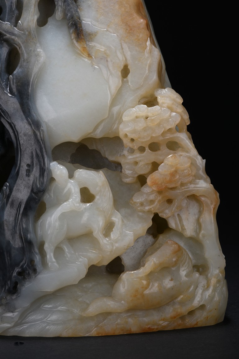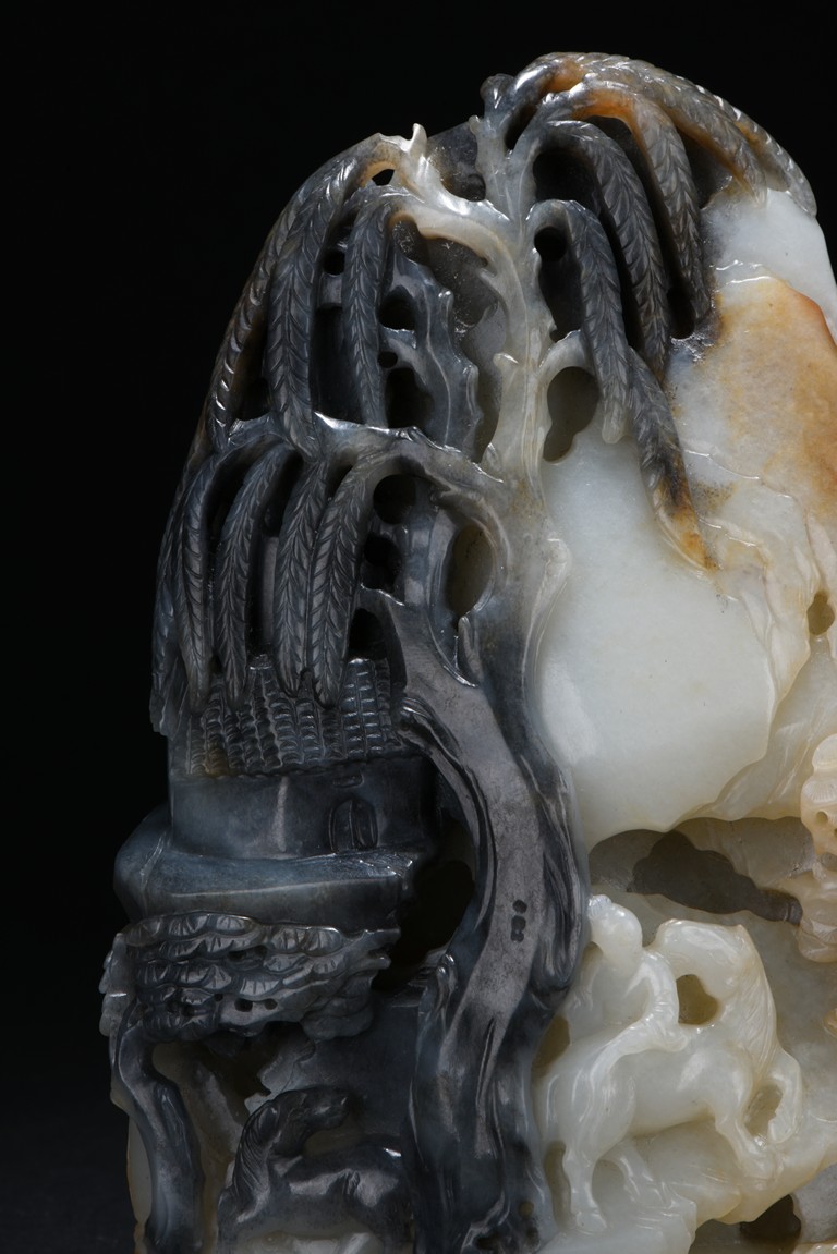 Of irregular boulder form, superbly worked in openwork to one side with tall willow tree in black jade and an official riding on a horse along the mountain path near pine trees in russet color jade, the reverse close to the bottom with two running horses in the mountain setting, the stone of even white color with grey inclusions and russet skin skillfully incorporated into the design of the boulder.