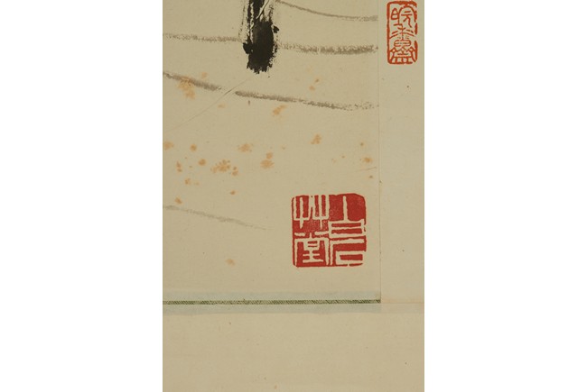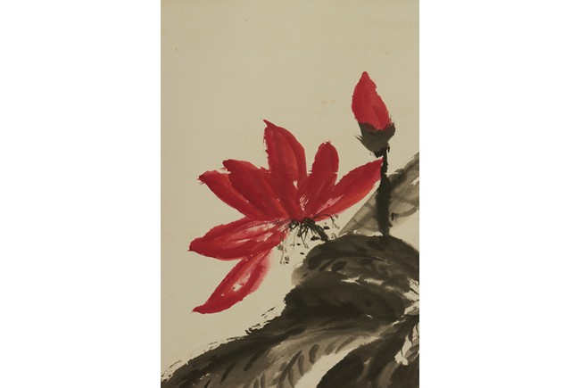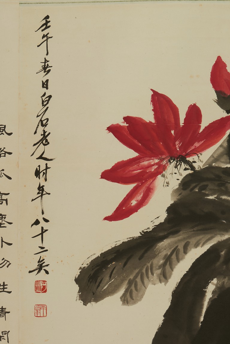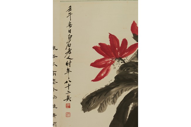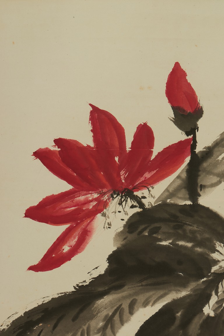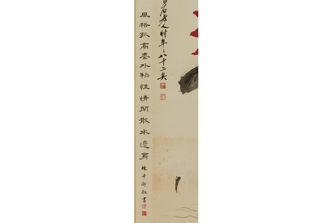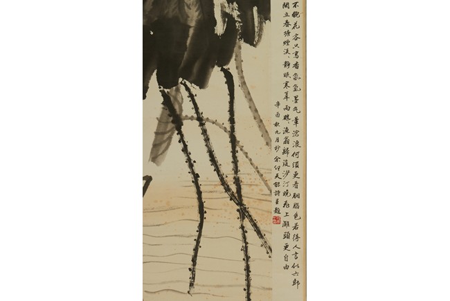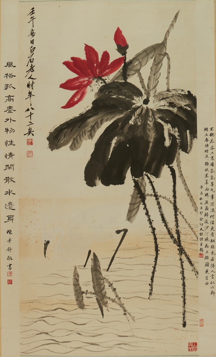 Color and ink on paper. Lotus and crane. Hanging scroll. Inscribed and signed. With three seal marks of the artist and four seal marks of the commentator. Colophon inscribed signed by Cheng Jingshu and Yu Rentian.