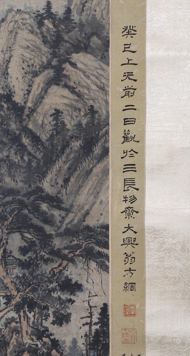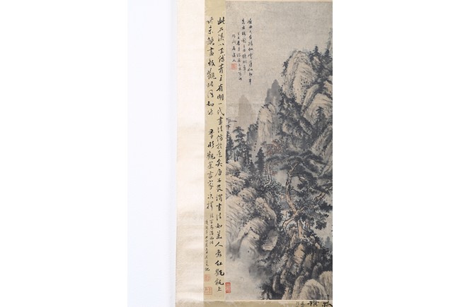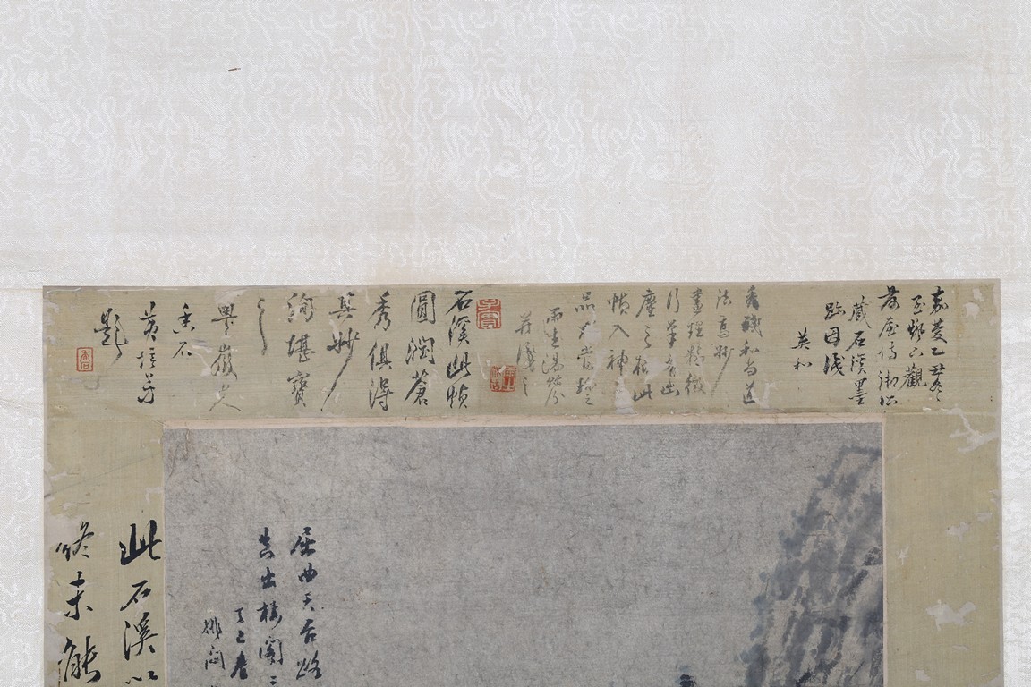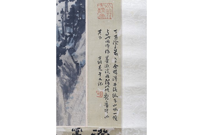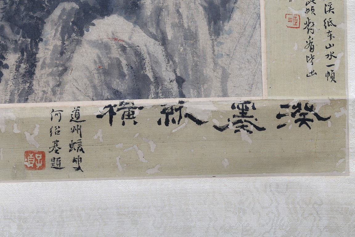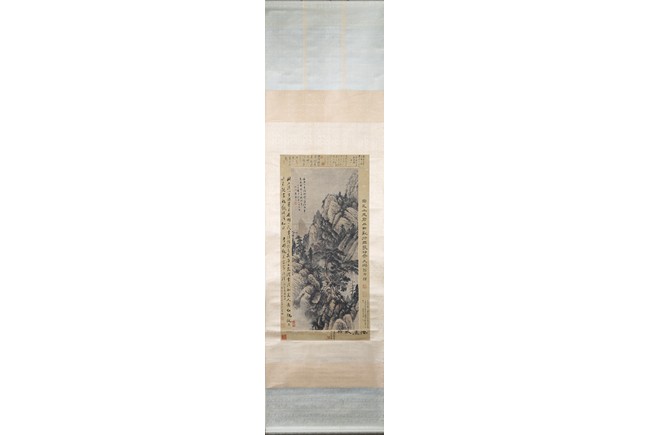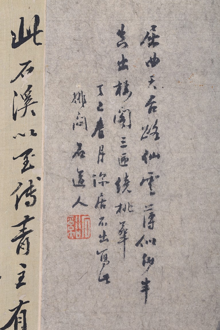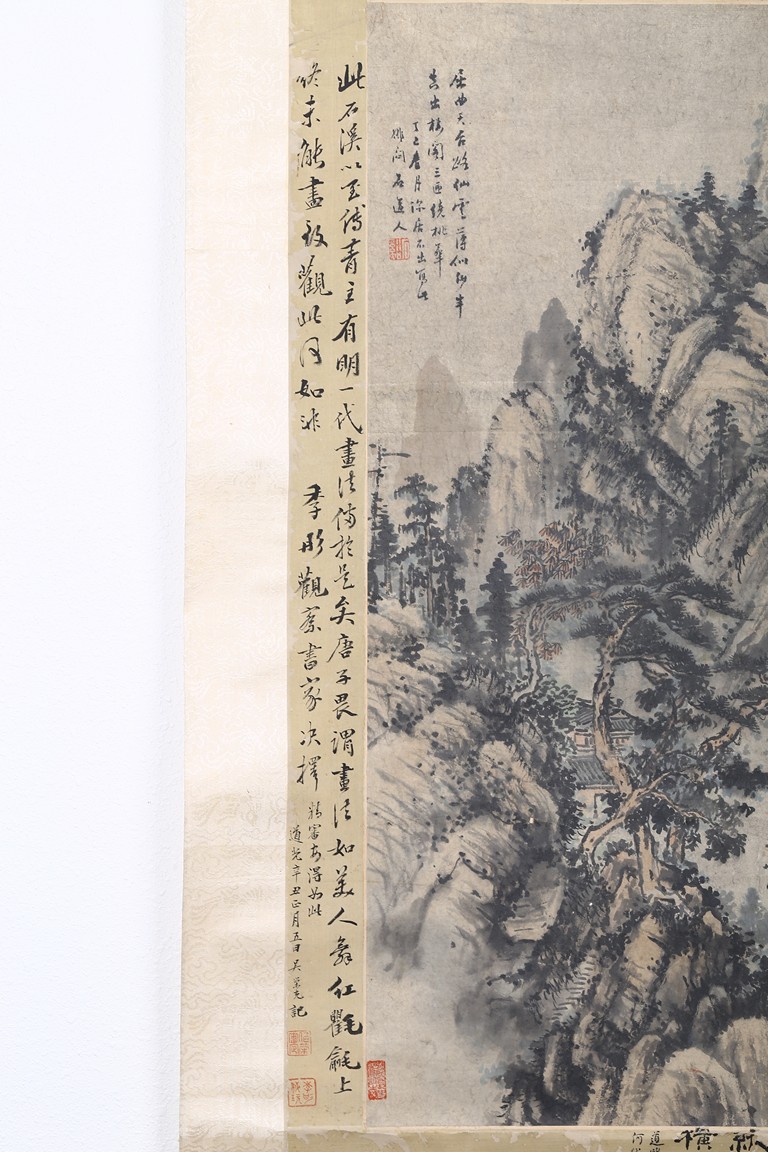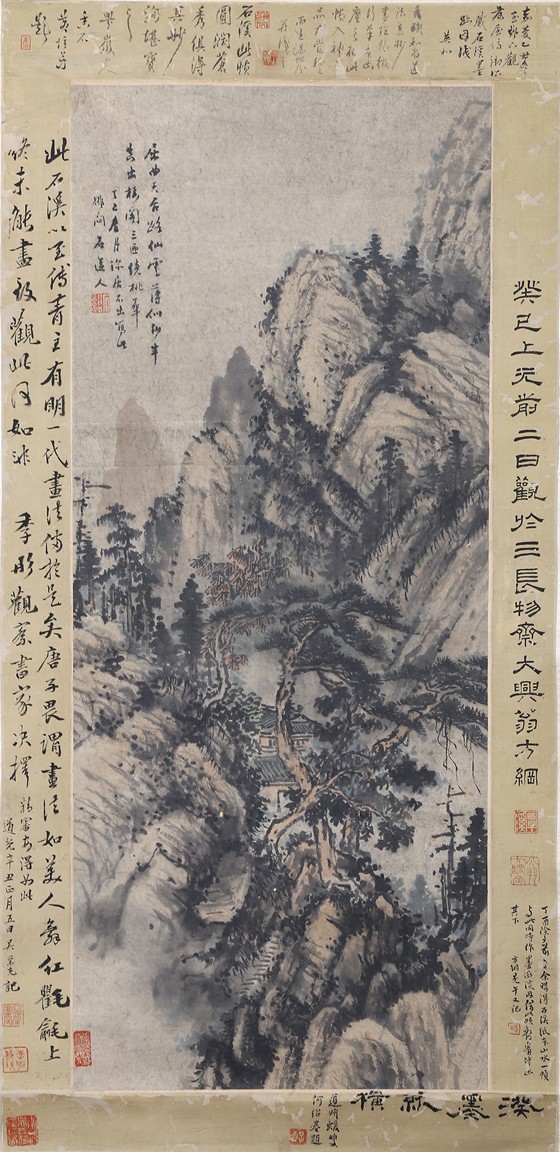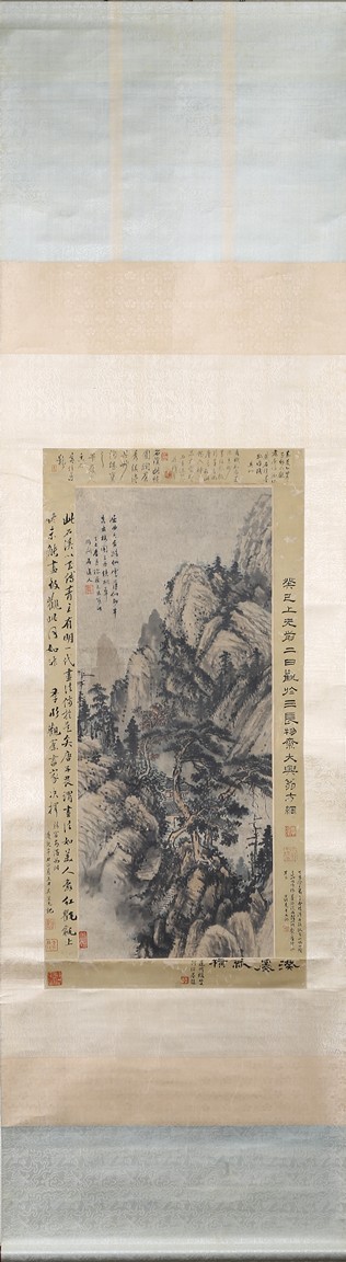 Color and ink on paper. Landscape. Hanging scroll. Inscribed and signed Shi Dao Ren, with two seal marks of the artist. Colophon signed Weng Fanggang, He Shaoji, Wu Ronggang, etc, with total ten seal marks.