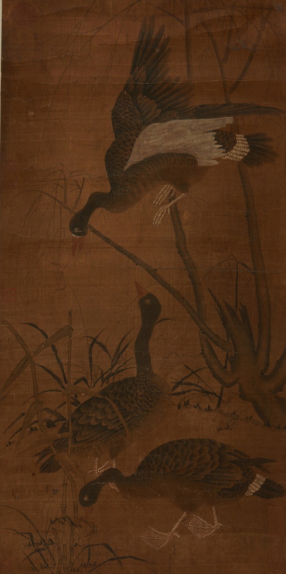 Color and ink on silk. Wild geese. Hanging scroll. Anonymous. With five seals of collectors.