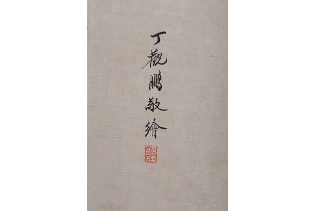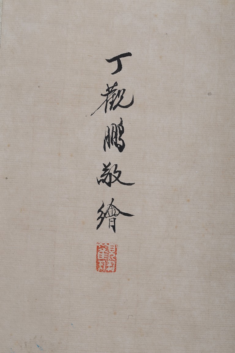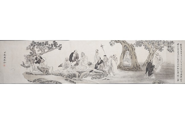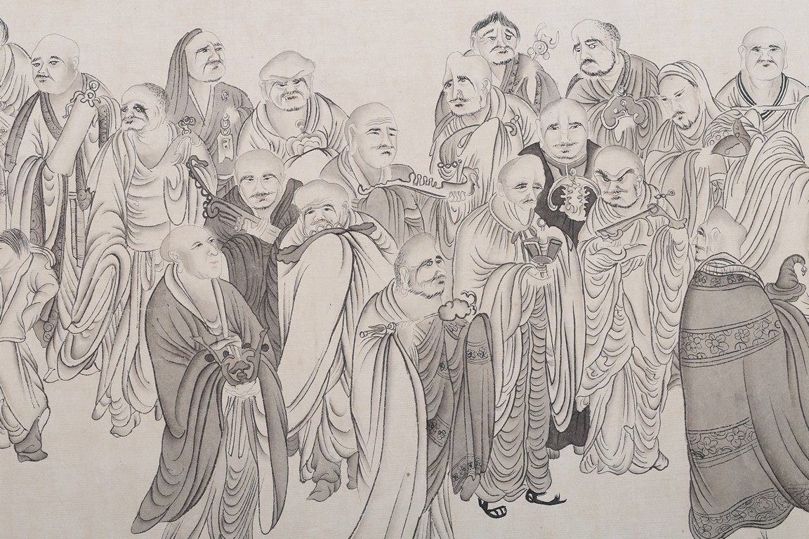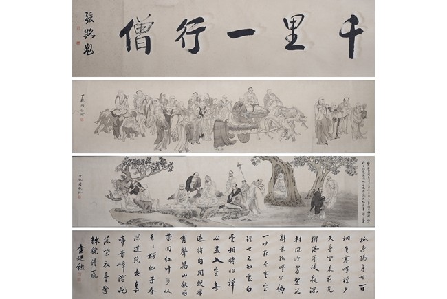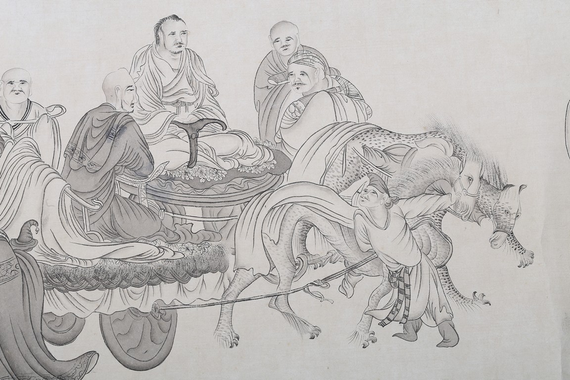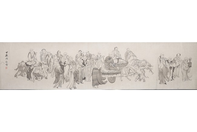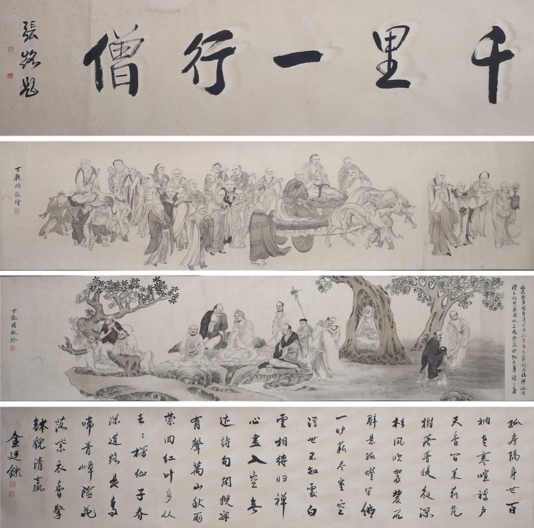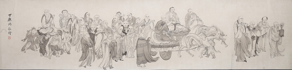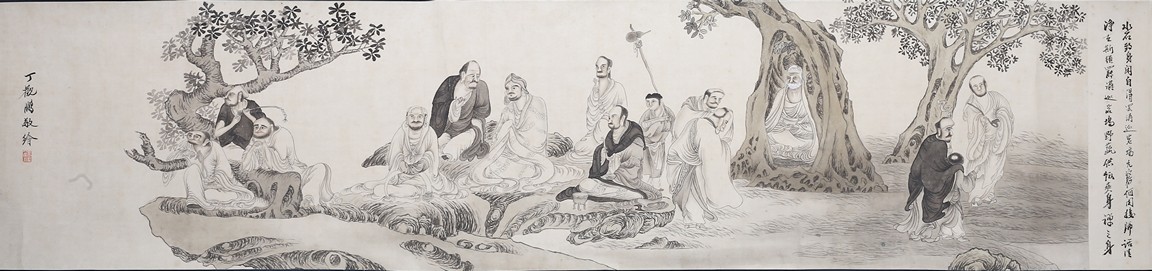 Ink on paper. Arhat. Hand scroll. Inscribed and signed Ding Guanpeng, with two seal marks of the artist. Frontpiece signed Zhang Lu and with two seal marks. Colophon signed Jing Tingbiao and with two seal marks.
