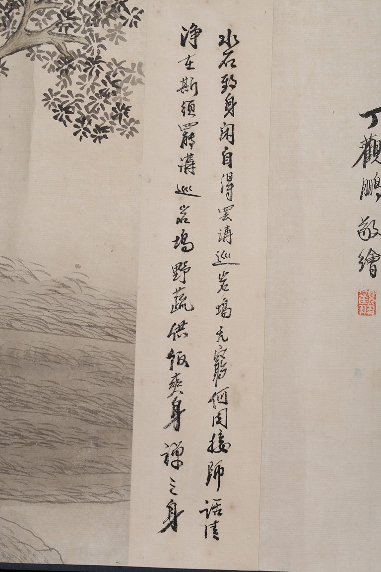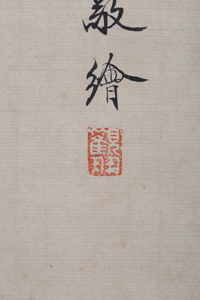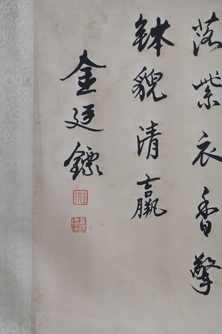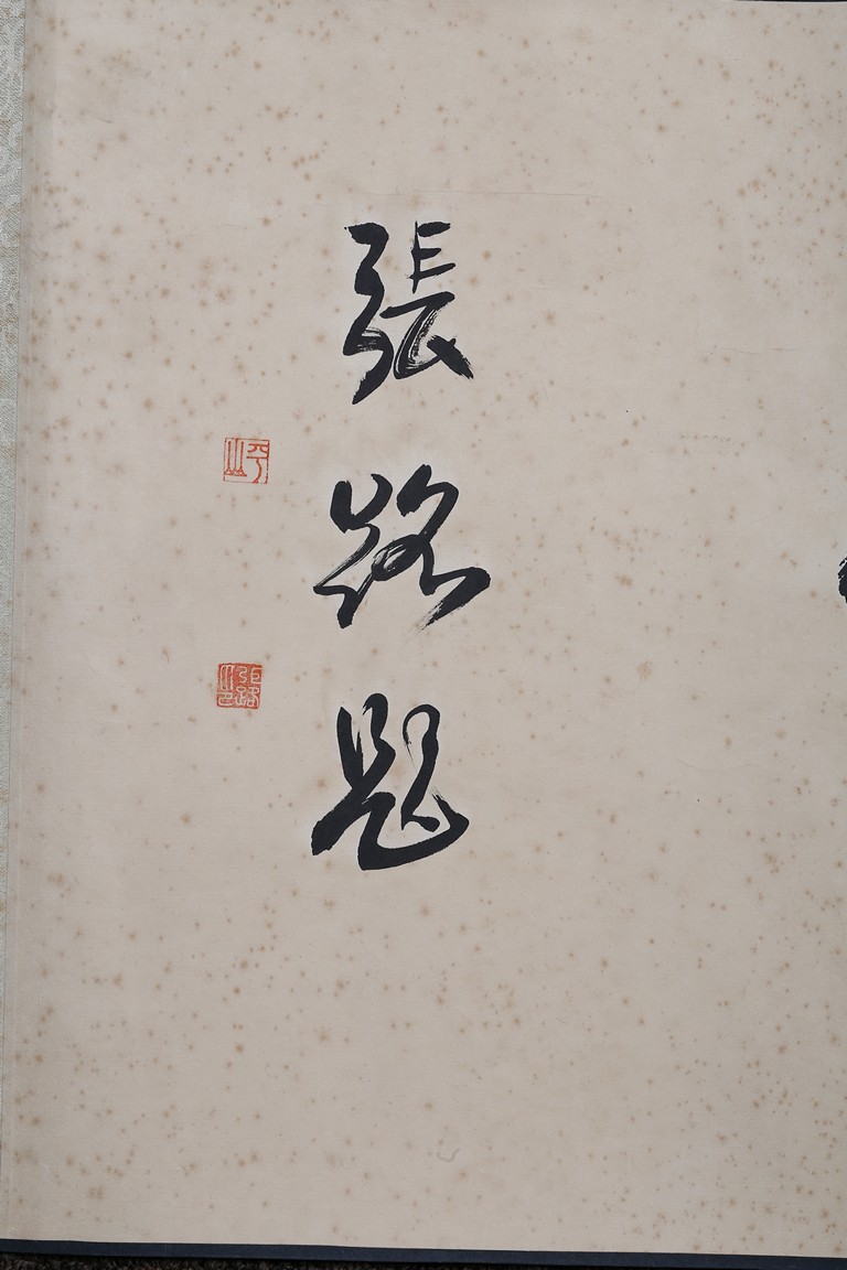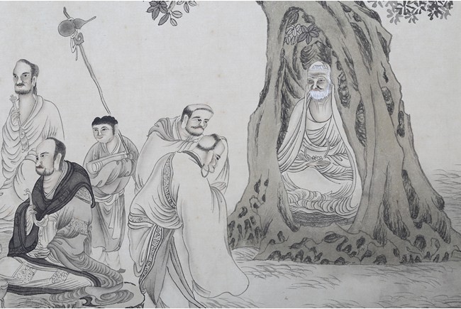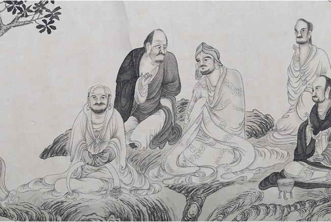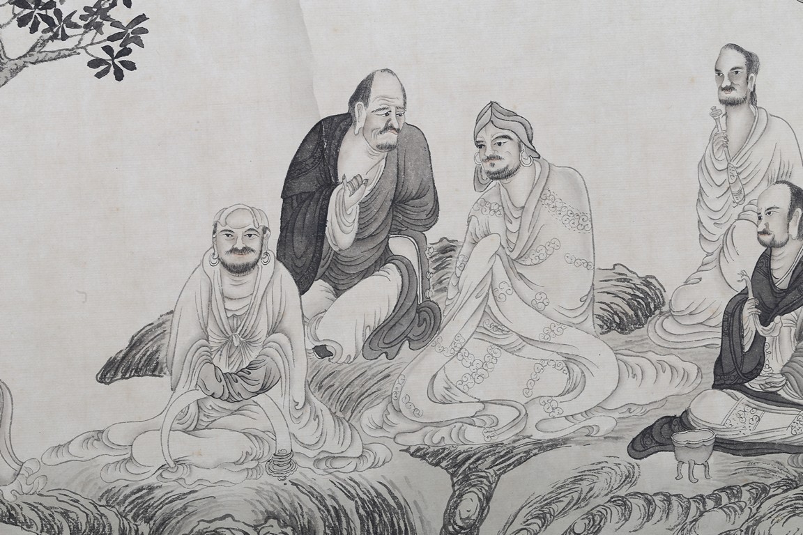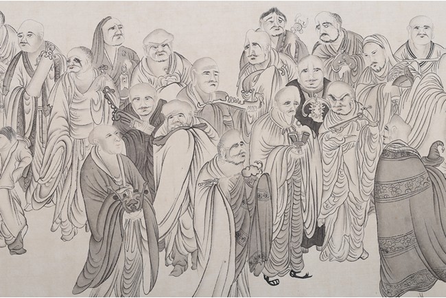 Ink on paper. Arhat. Hand scroll. Inscribed and signed Ding Guanpeng, with two seal marks of the artist. Frontpiece signed Zhang Lu and with two seal marks. Colophon signed Jing Tingbiao and with two seal marks.