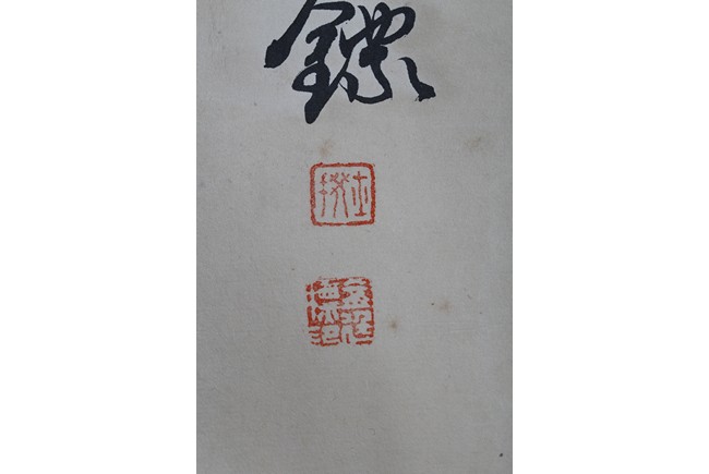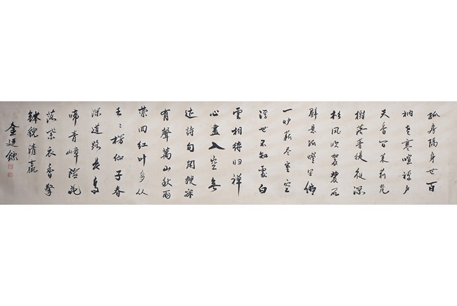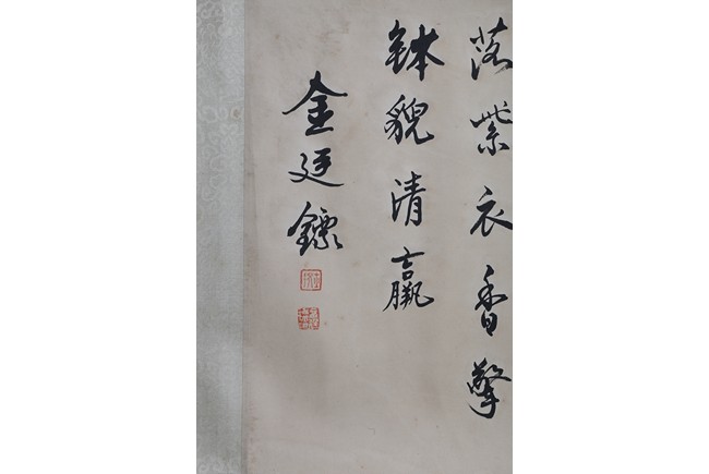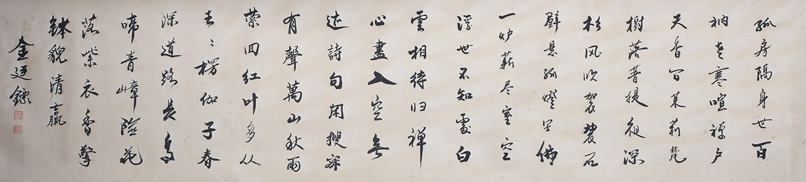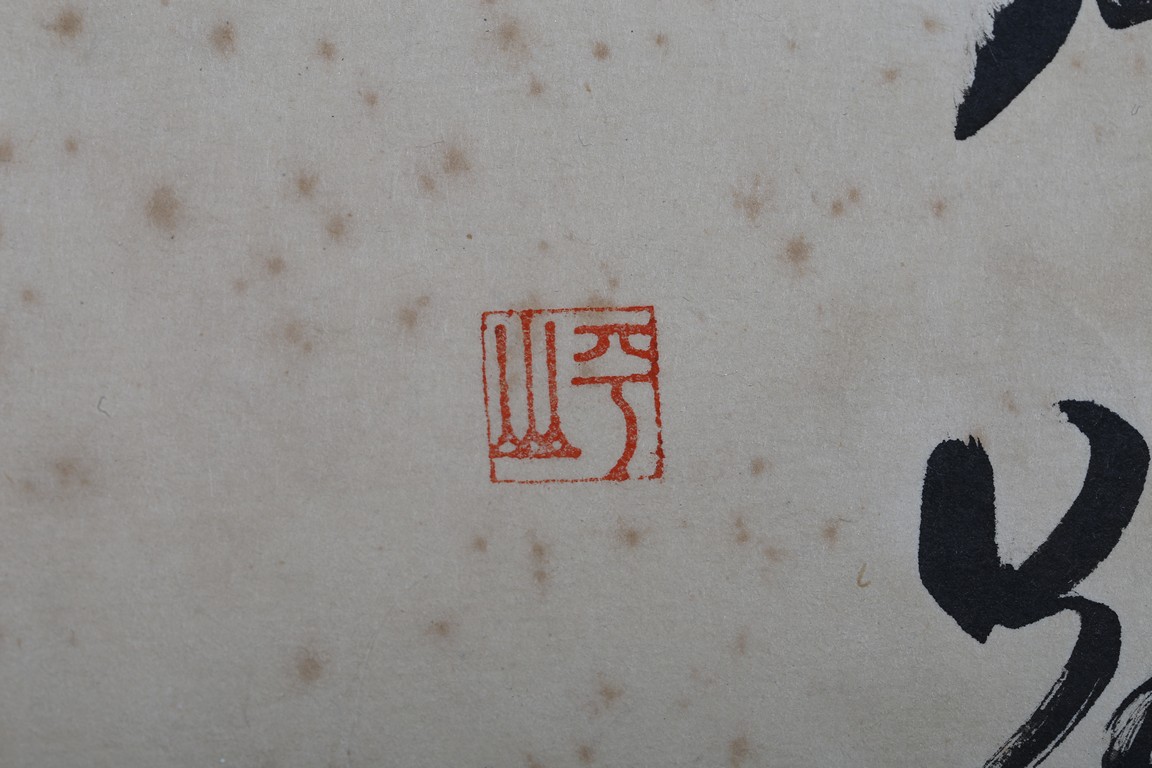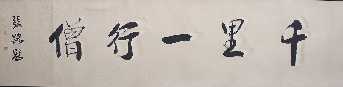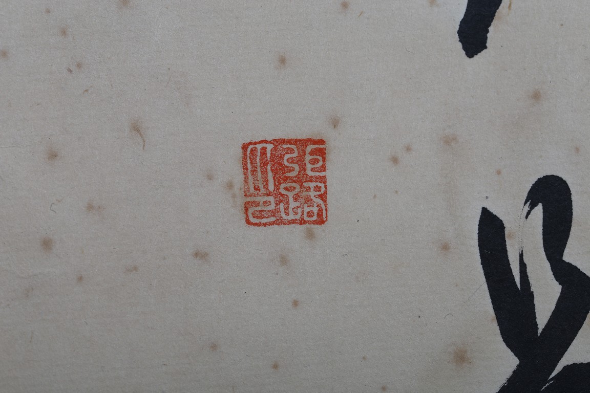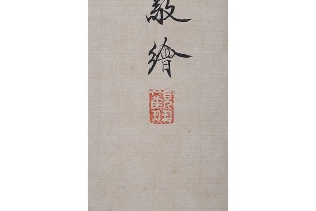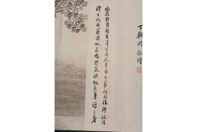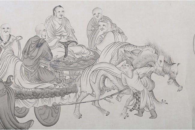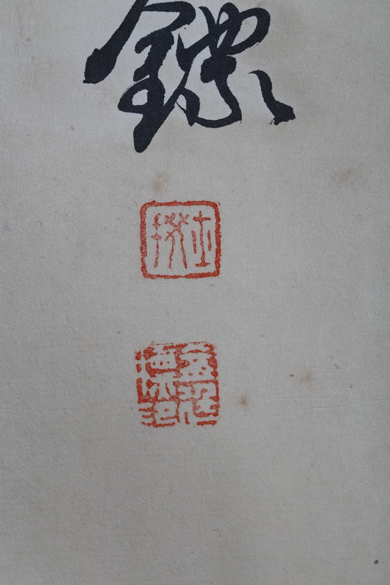 Ink on paper. Arhat. Hand scroll. Inscribed and signed Ding Guanpeng, with two seal marks of the artist. Frontpiece signed Zhang Lu and with two seal marks. Colophon signed Jing Tingbiao and with two seal marks.