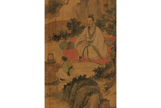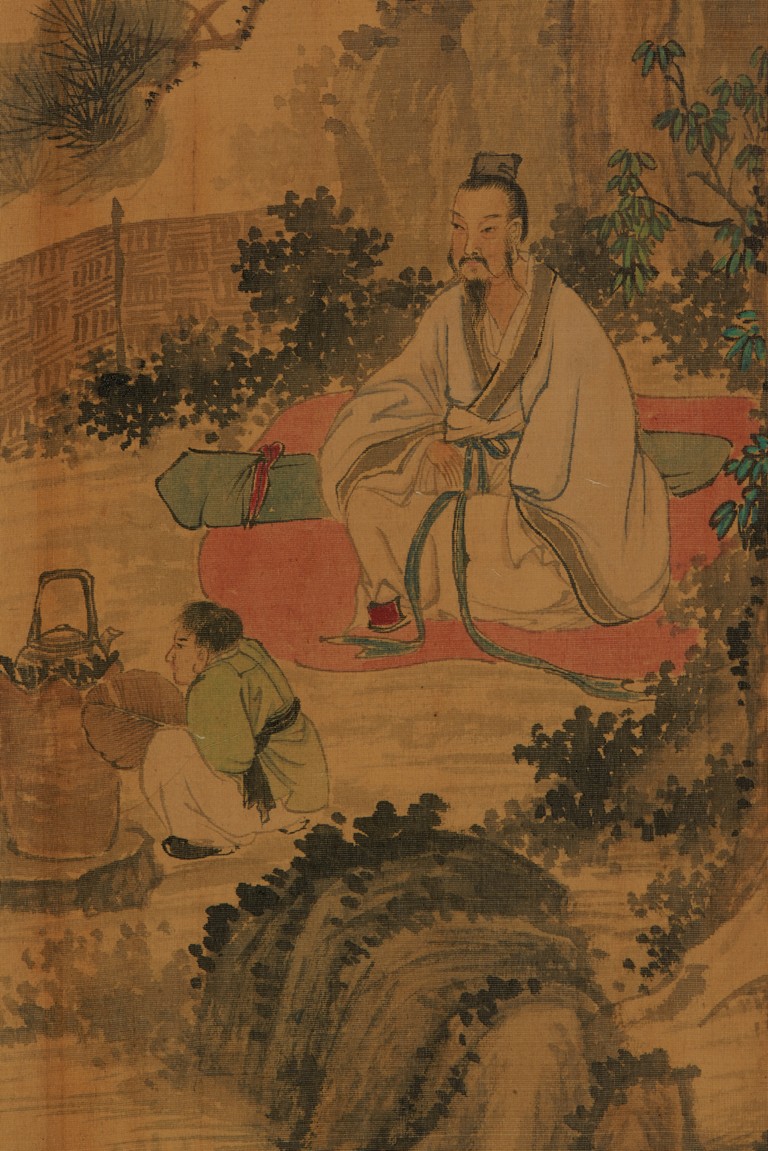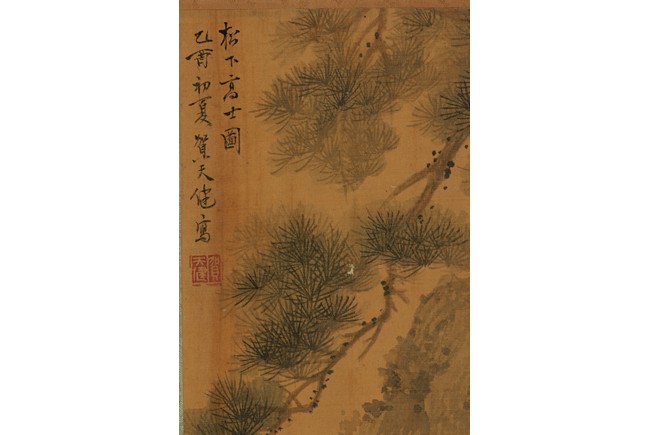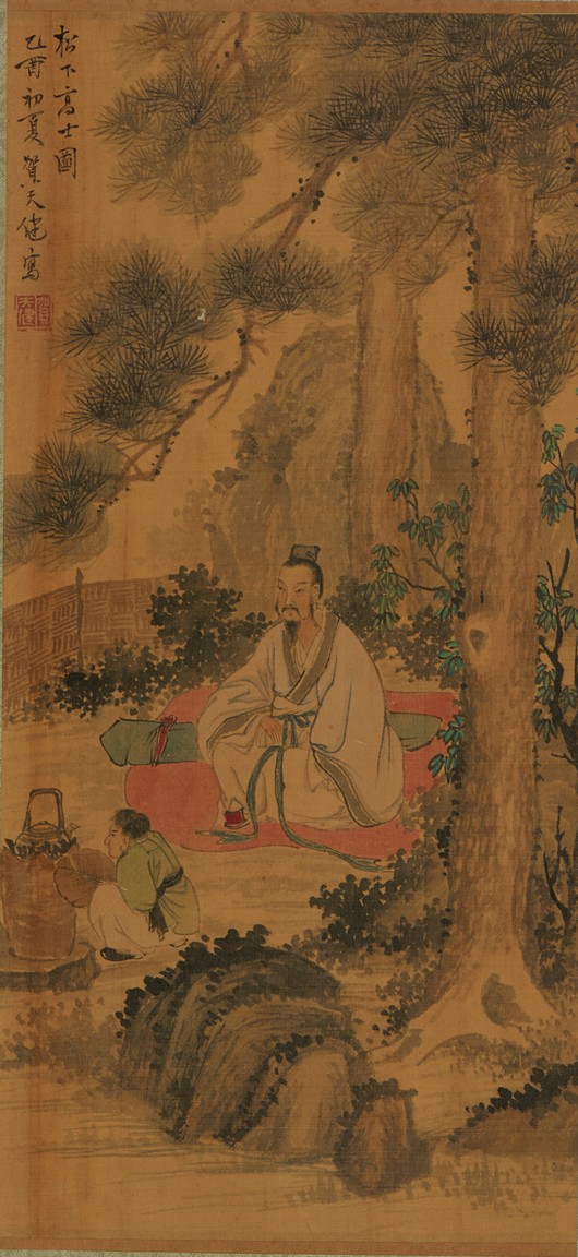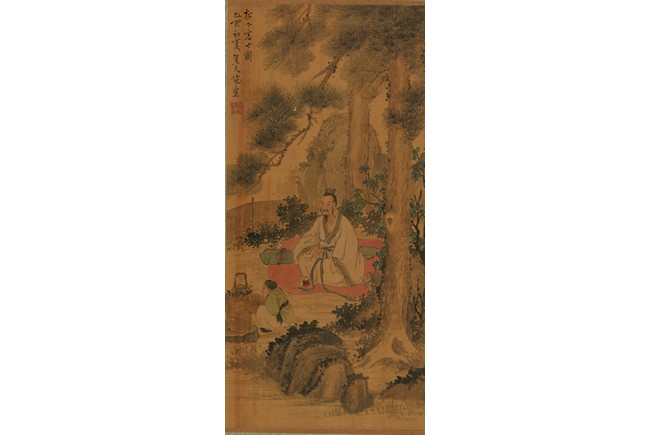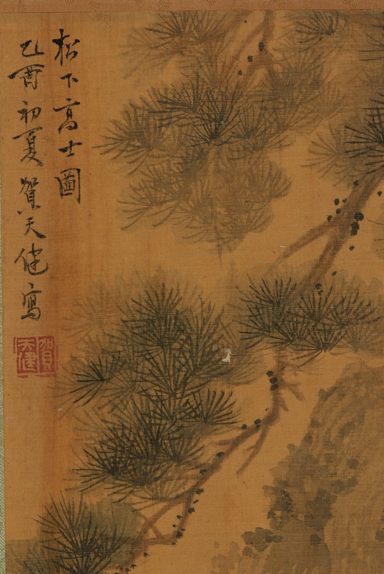 Color and ink on silk. Figures under pine tree. Unframed. Inscribed and signed, with one seal of the artist.