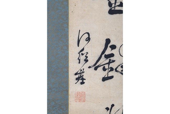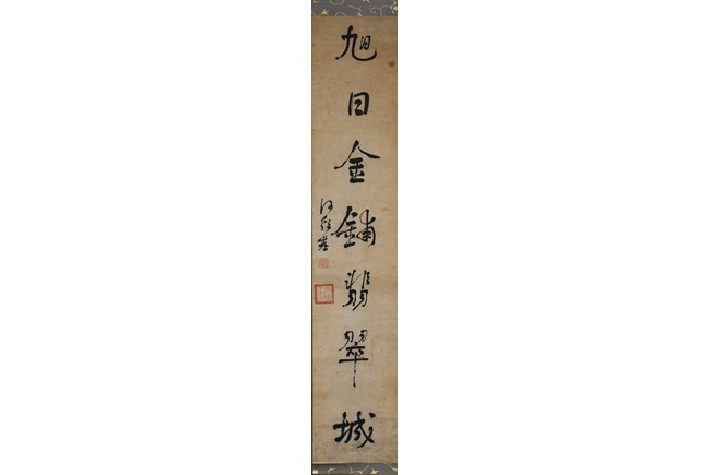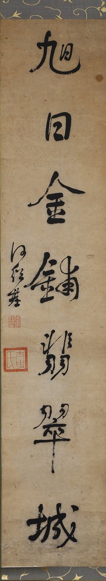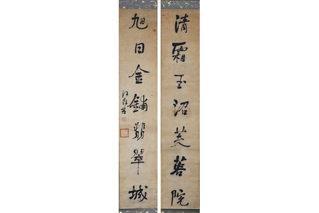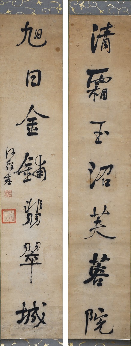 Ink on paper. Seven-character calligraphy couplet, hanging scroll. Signed with two seal marks.