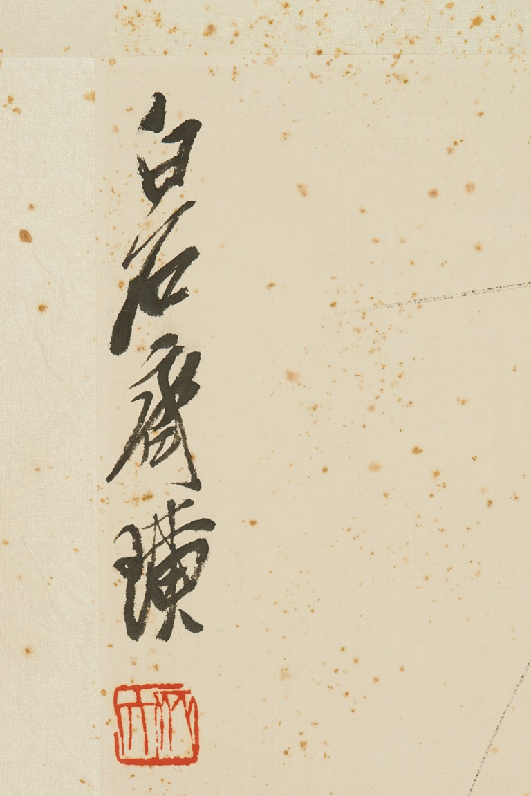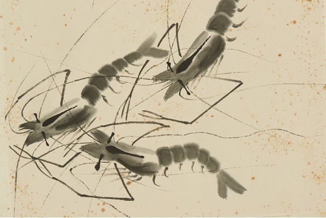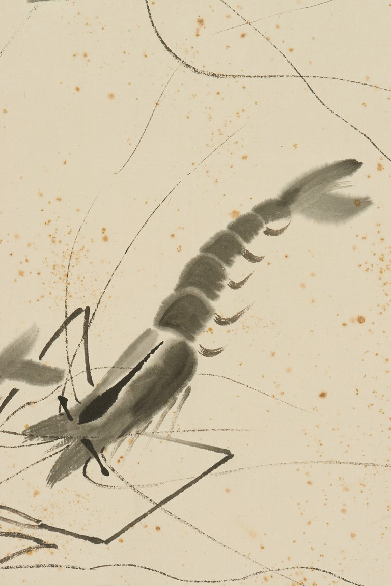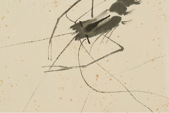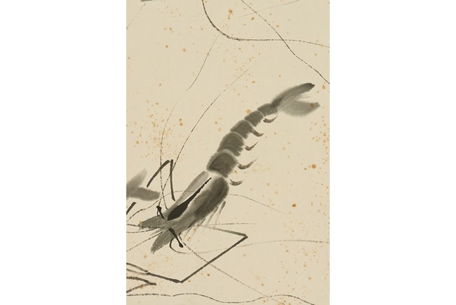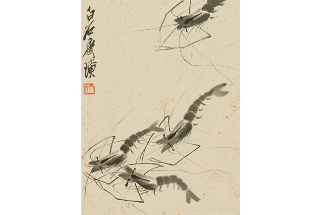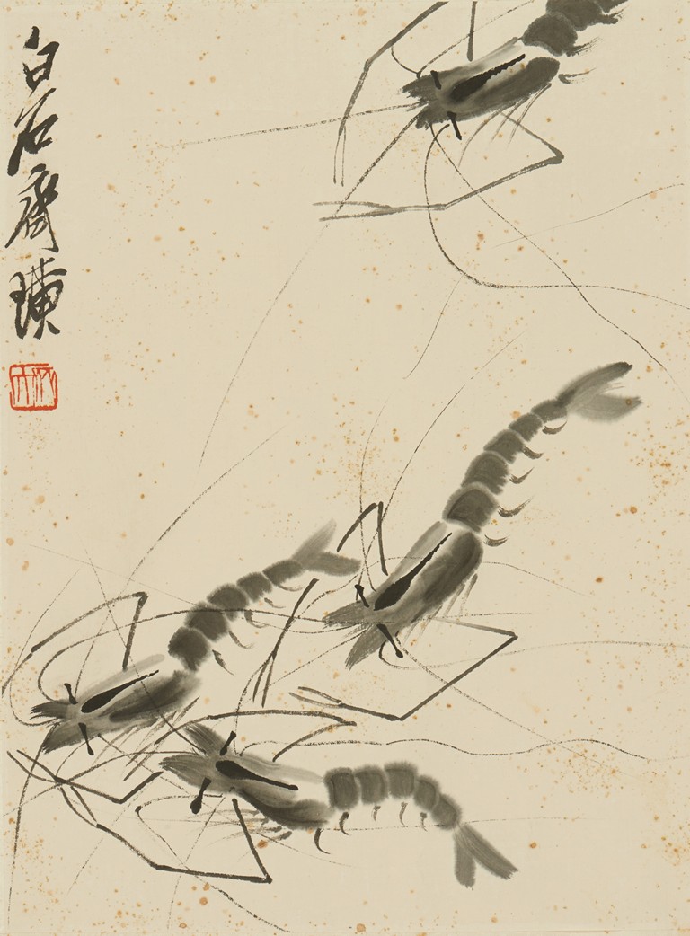 Ink on paper. Shrimps. Framed. Signed Bai Shi Qi, with one seal of the artist.