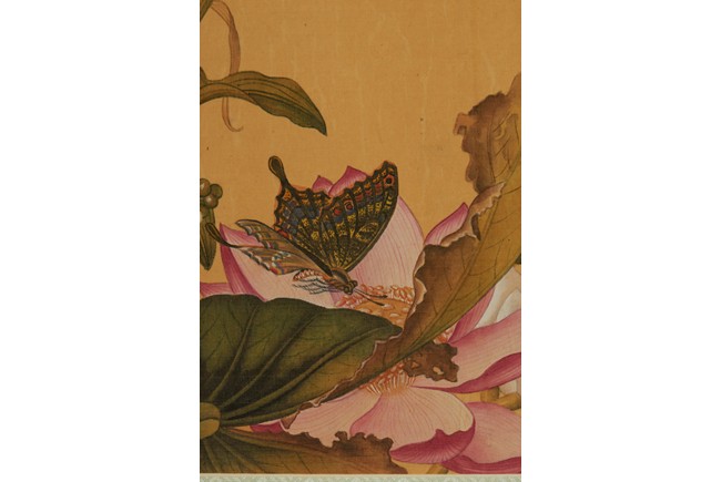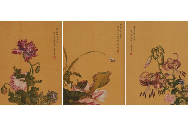 Color and ink on silk. A set of three flowers painting. Inscribed, with three seals of the artist.