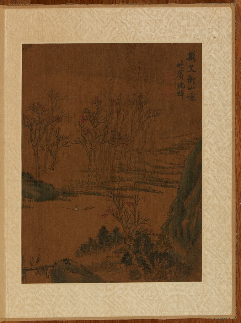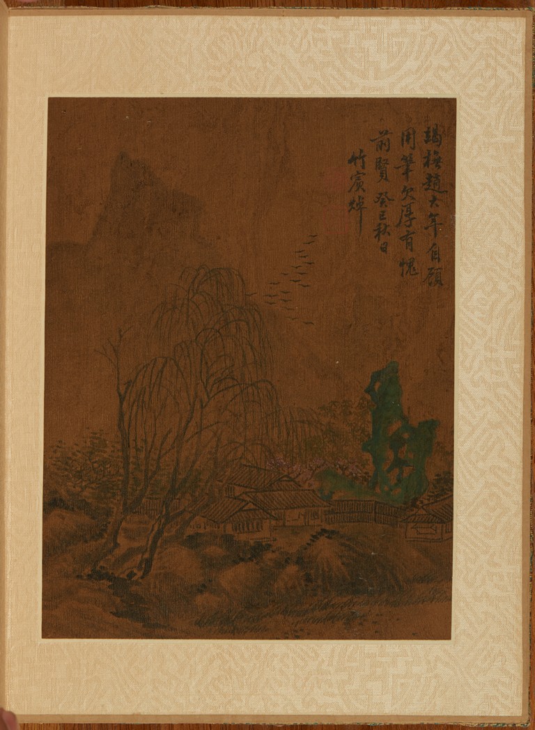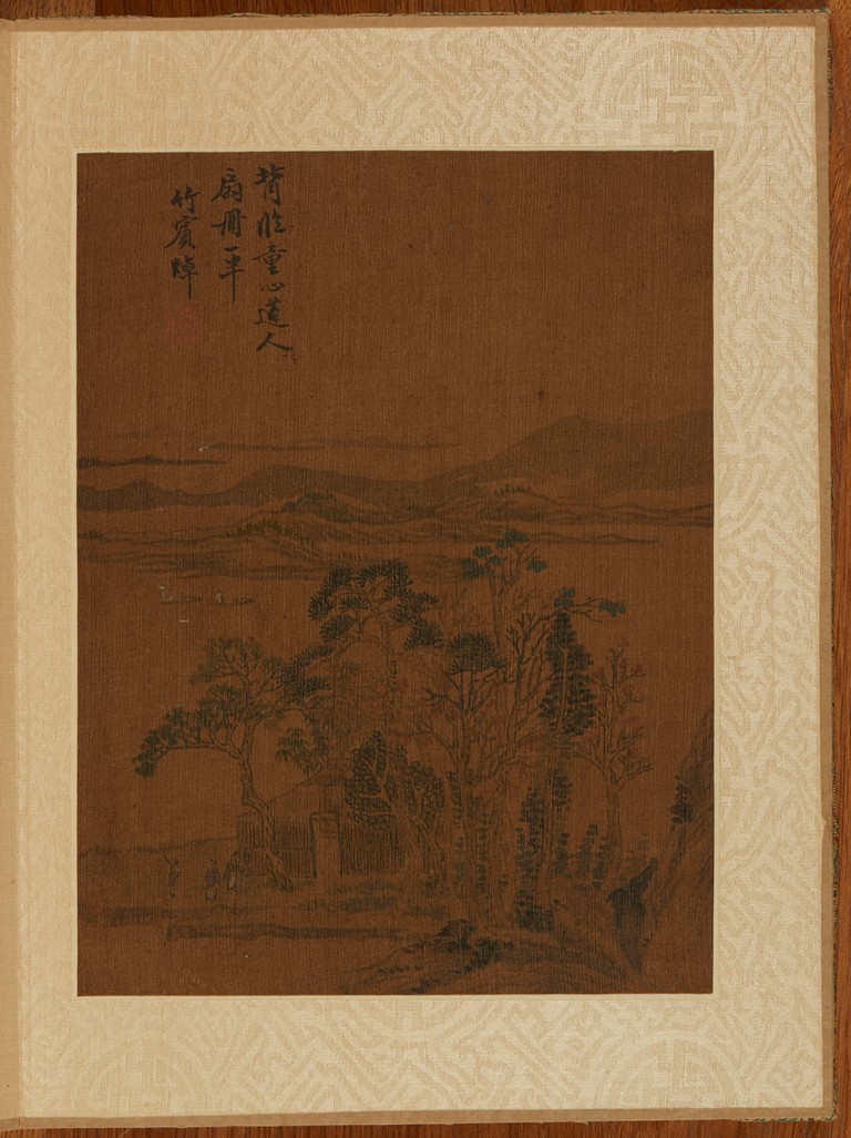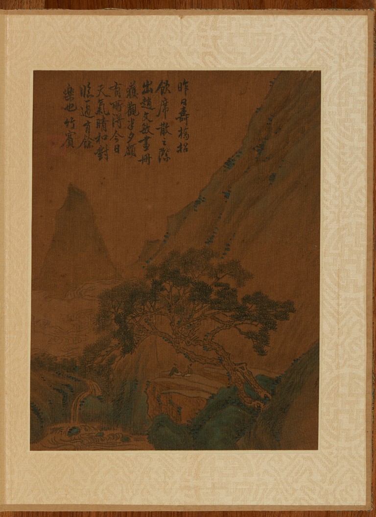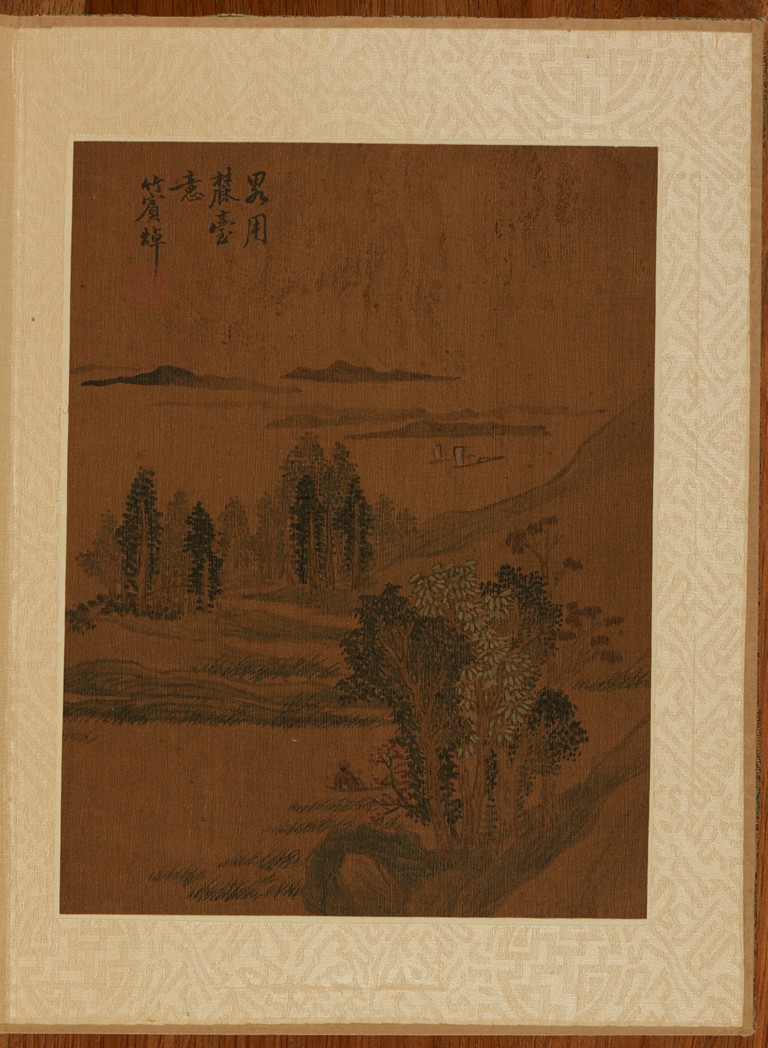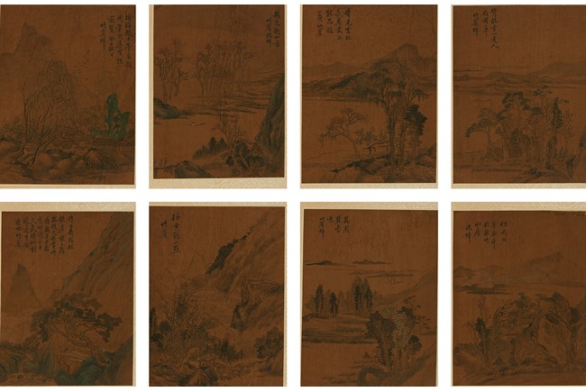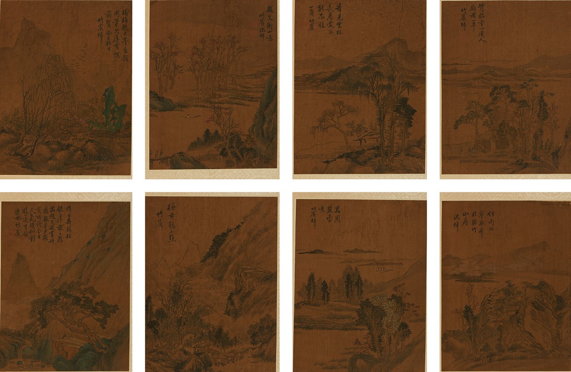 Color and ink on silk. Landscape. Eight leaves album. Inscribed and signed Zhu Bin, with ten seals of the artist.