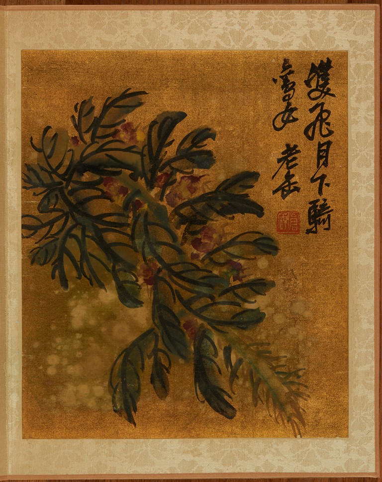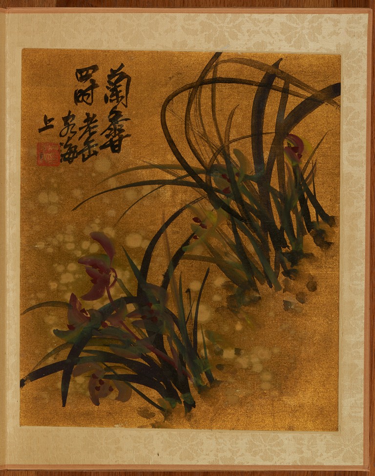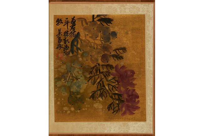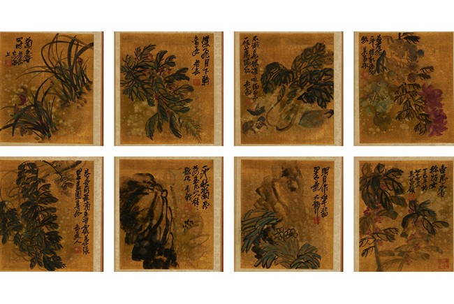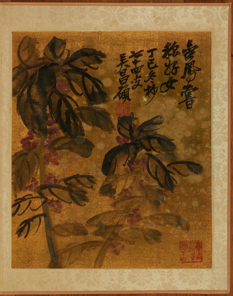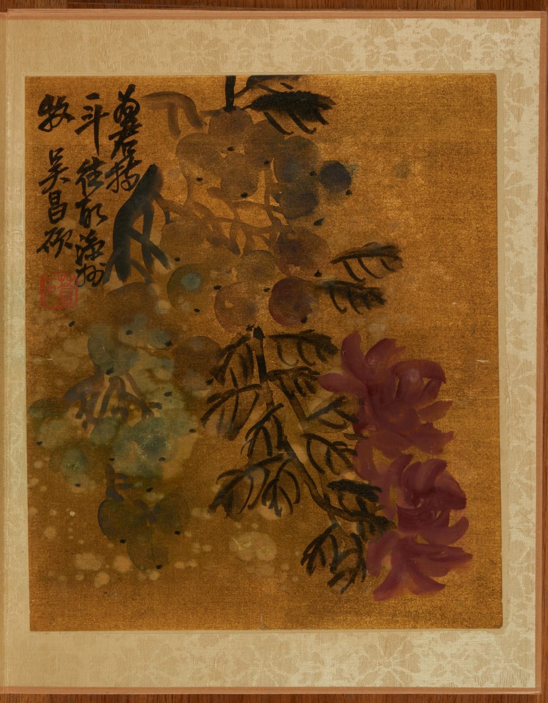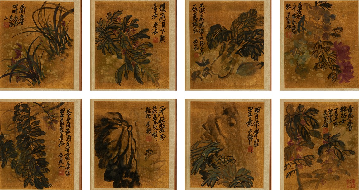 Color and ink on gold silk. Flowers. Eight leaves album. Inscribed and signed Wu Chang Shuo, with nine seals of the artist.