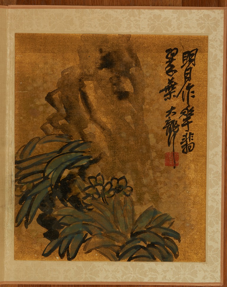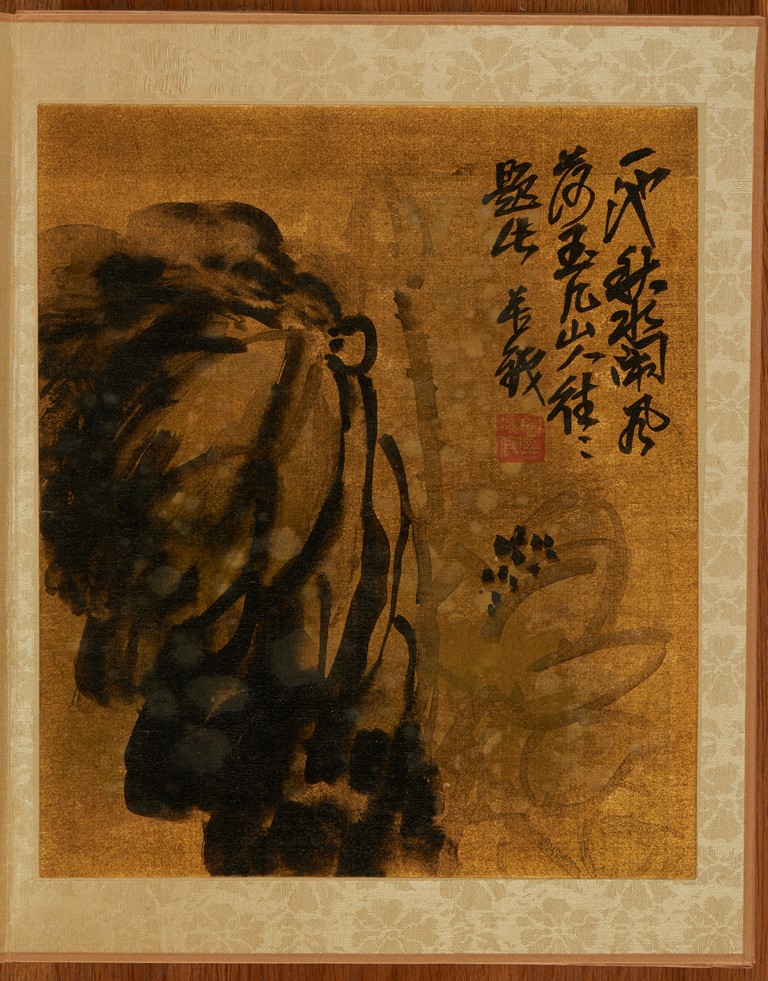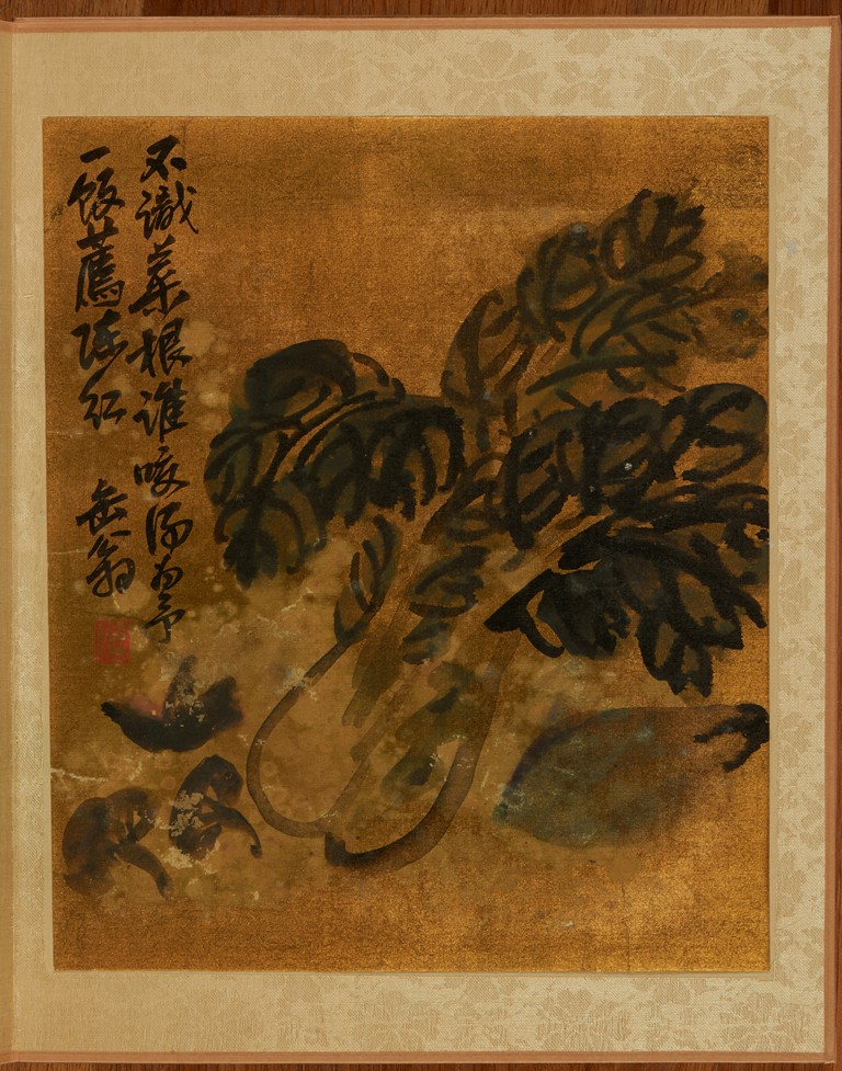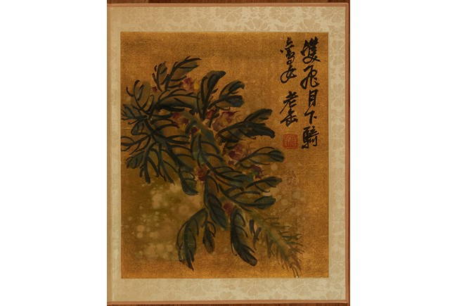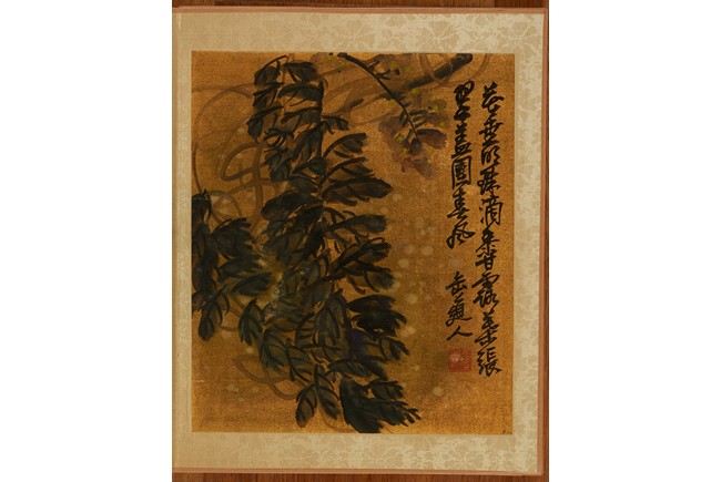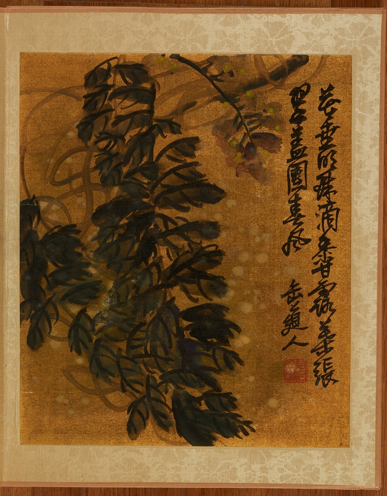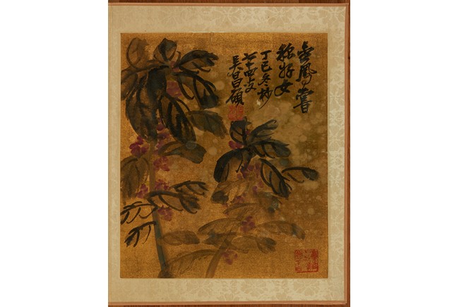 Color and ink on gold silk. Flowers. Eight leaves album. Inscribed and signed Wu Chang Shuo, with nine seals of the artist.