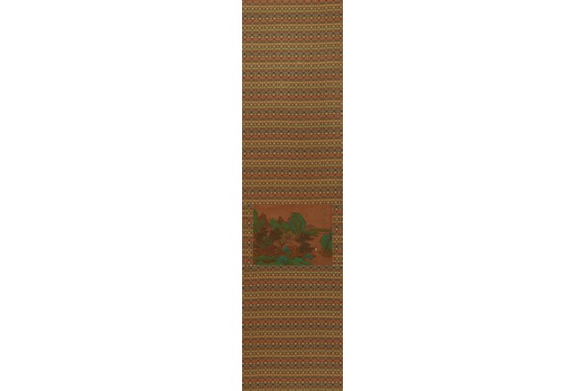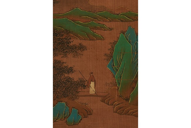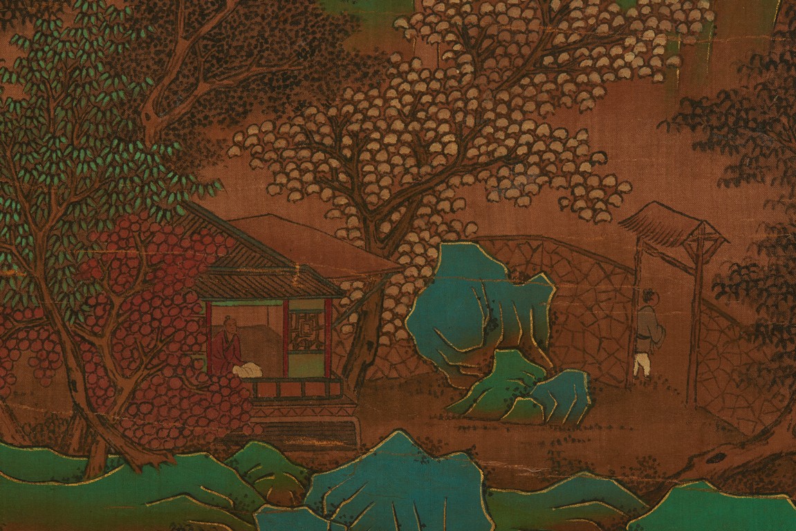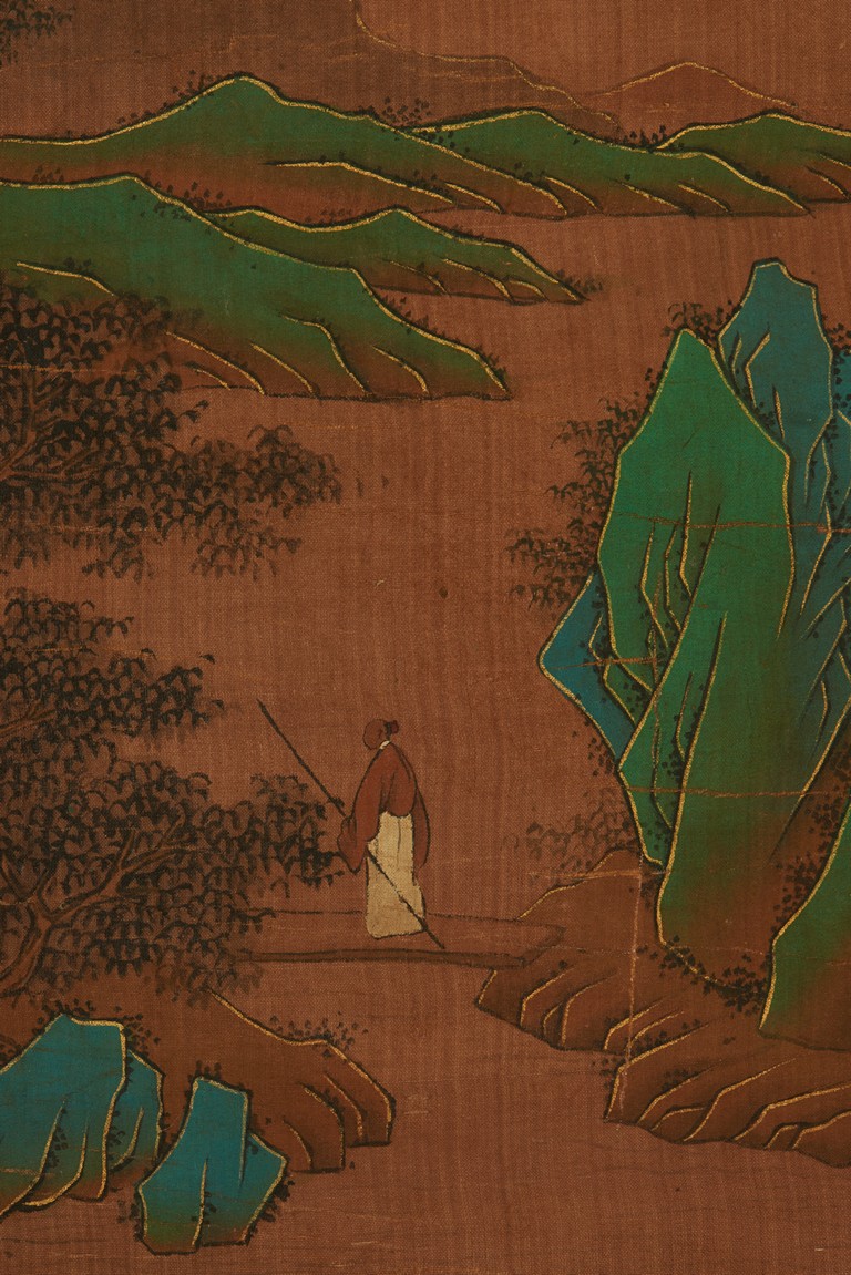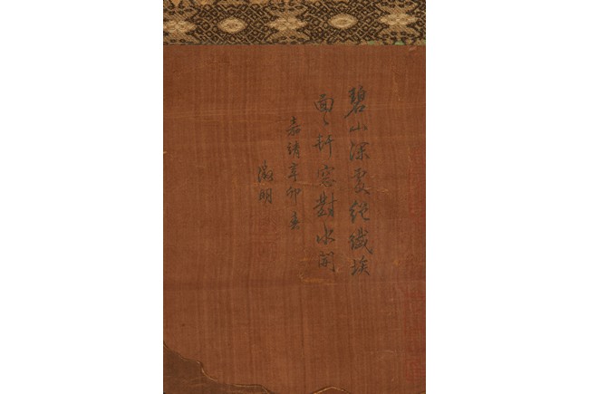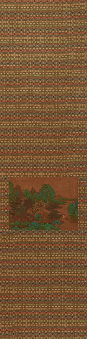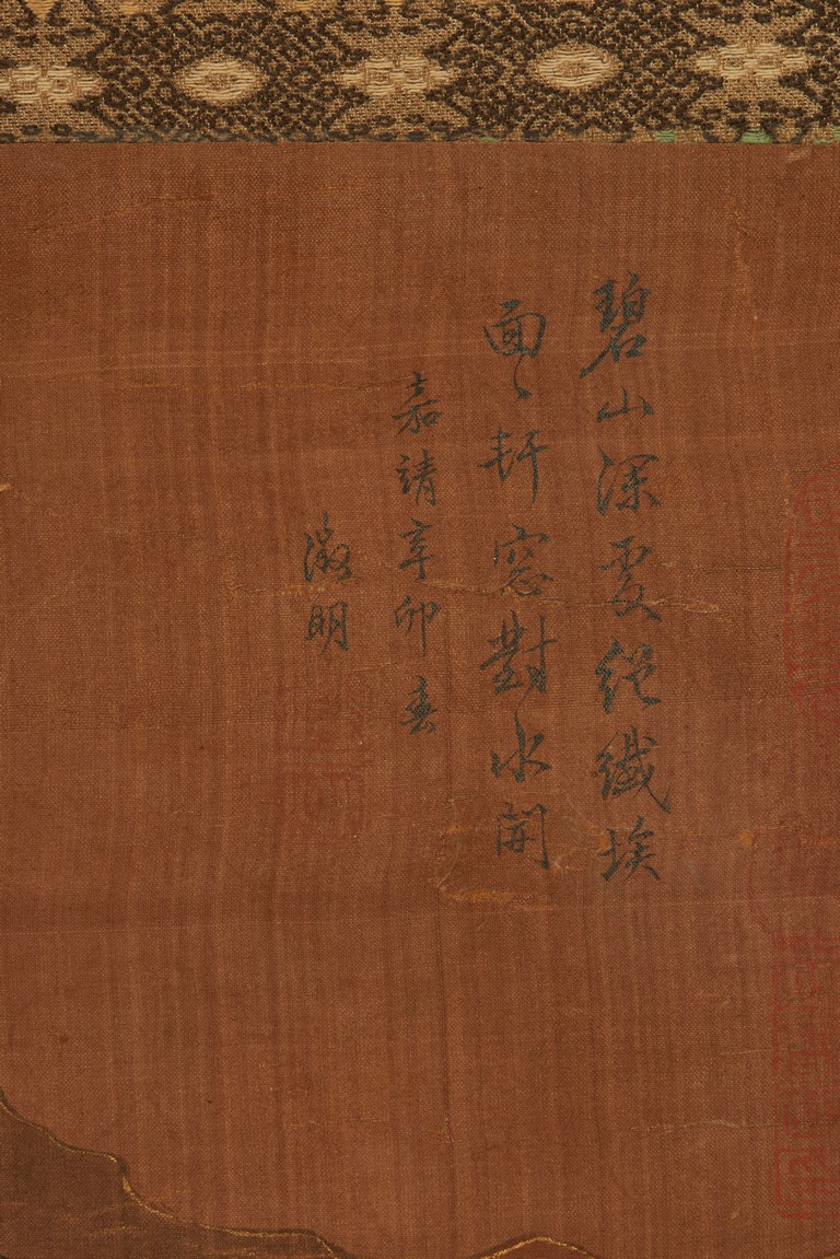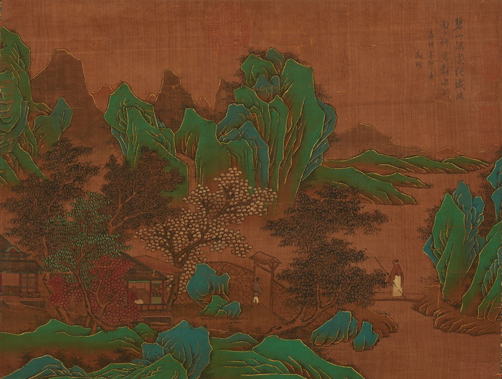 Color and ink on silk. Blue and green landscape. Hanging scroll. Inscribed and signed zheng ming, with three seals of the artist. Attributed to Wen Zhengming.
