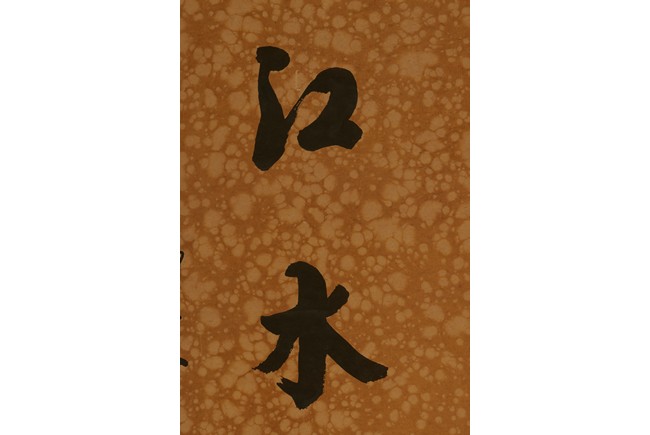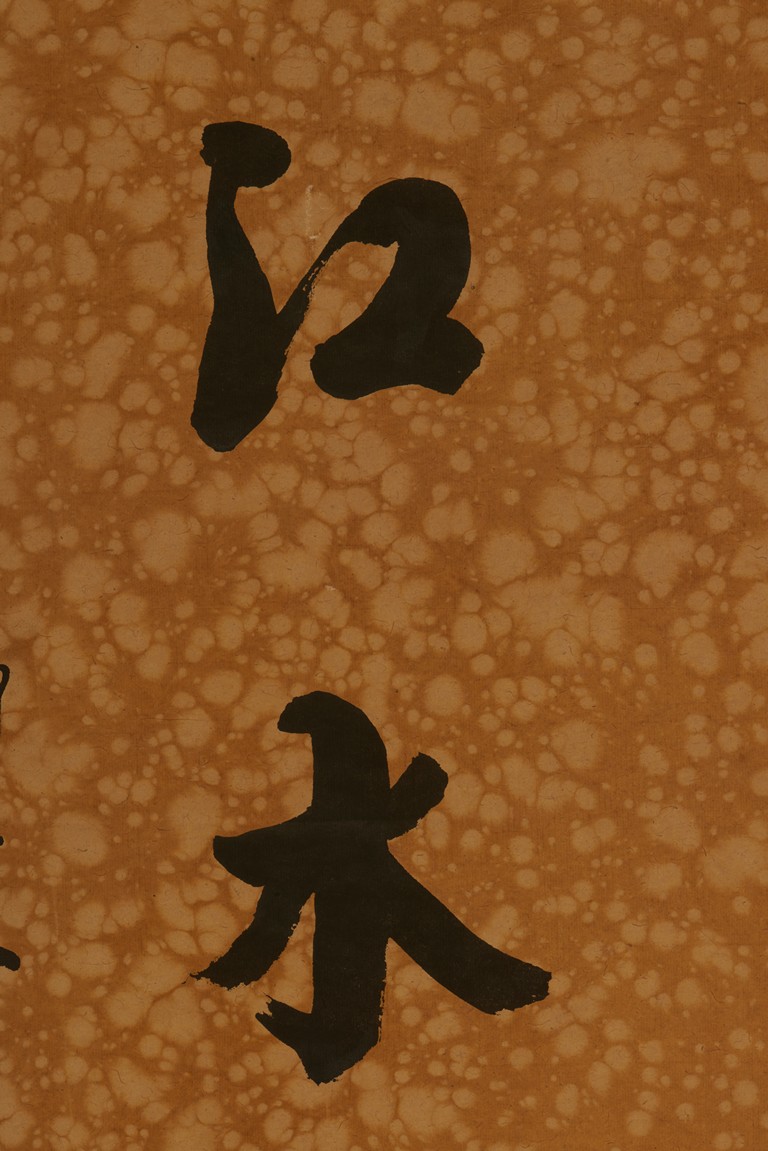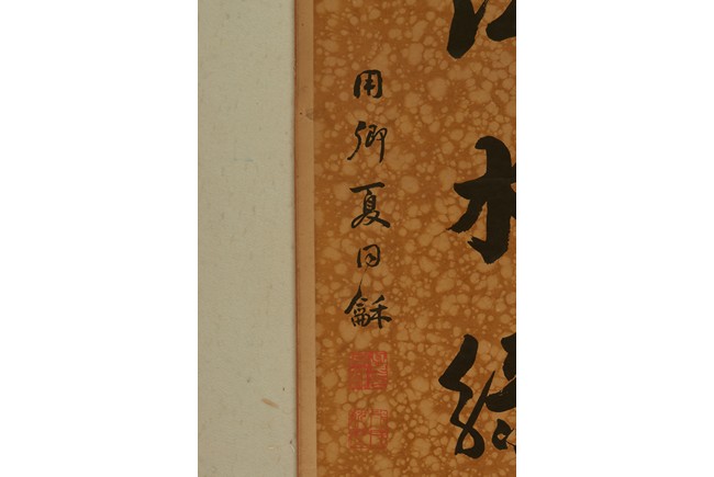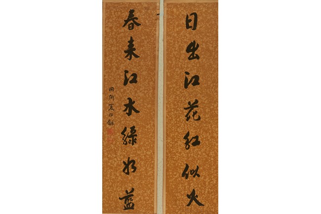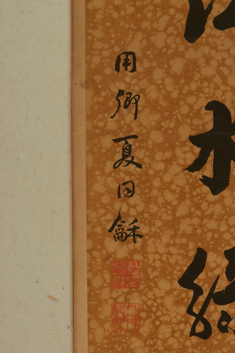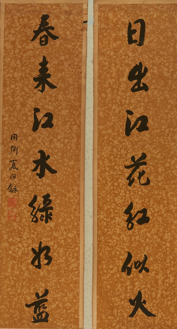 Ink on paper. Seven character calligraphy couplet. Hanging scrolls. Signed Xia Tong He, with two seals of the artist.