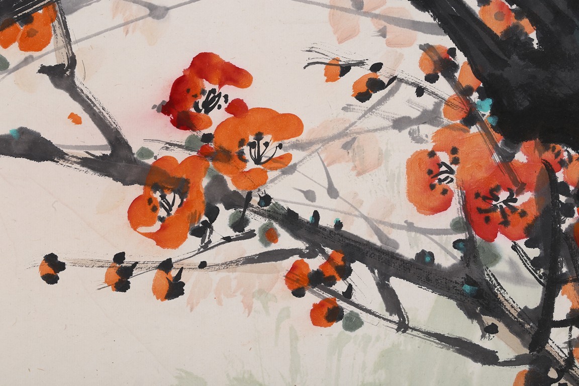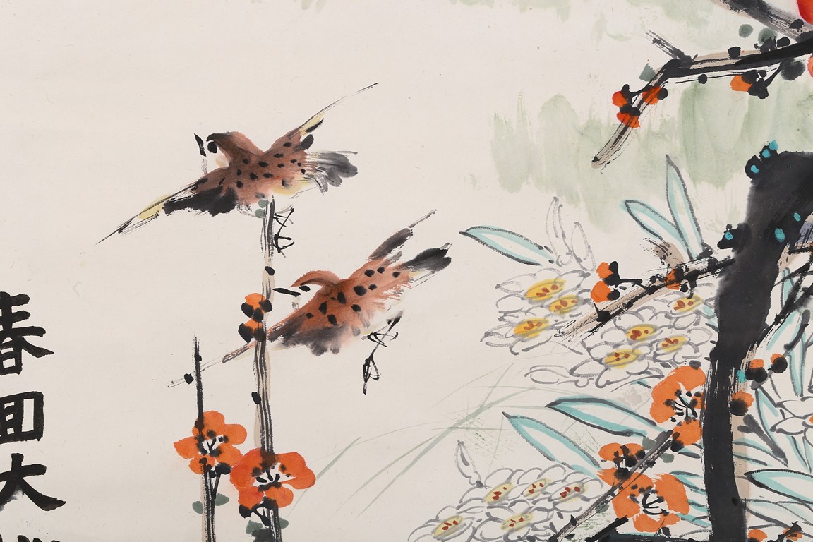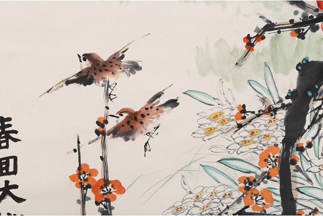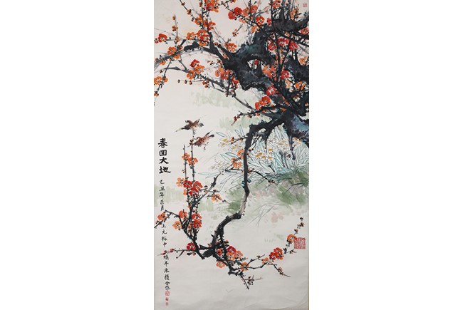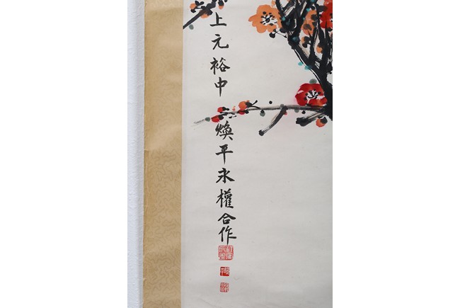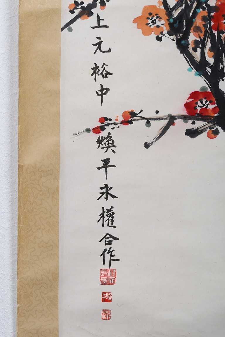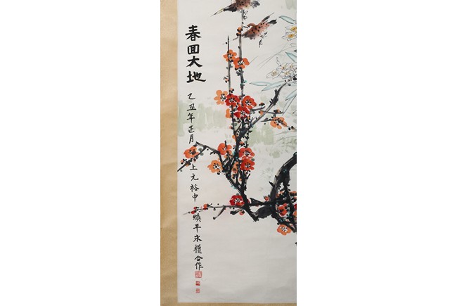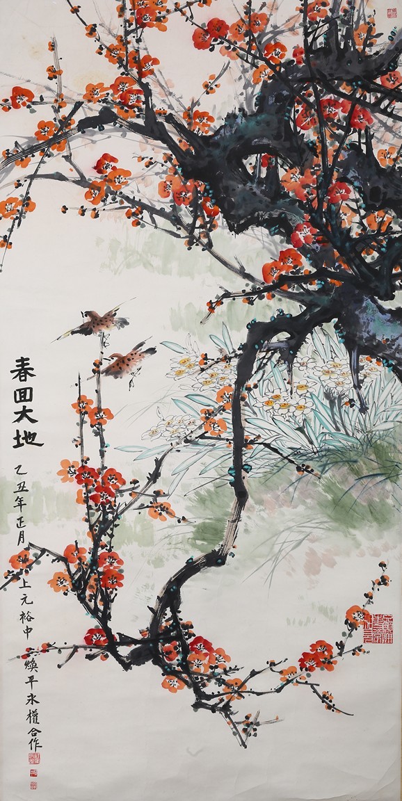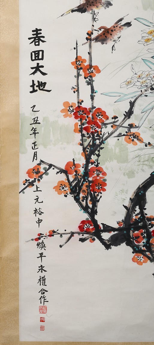 Color and ink on paper. Orchid, plum blossom and two birds. Inscribed and signed, hanging roll, with four seals of the artists.