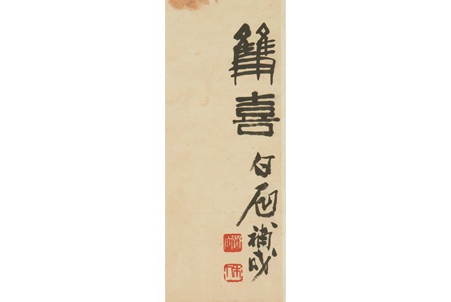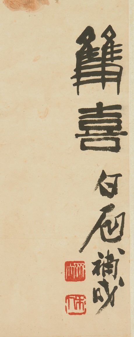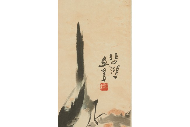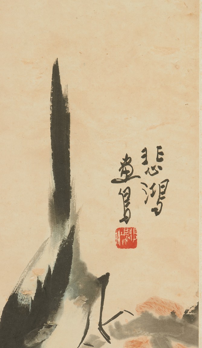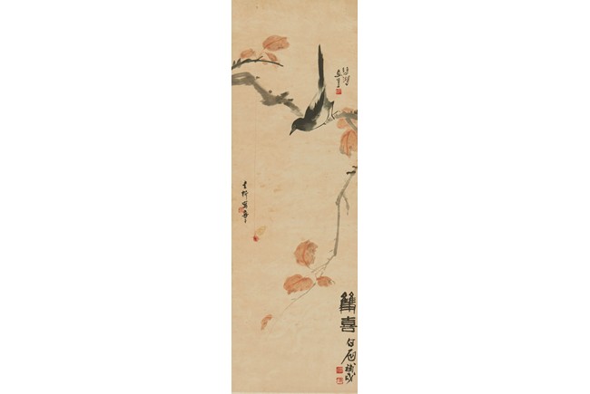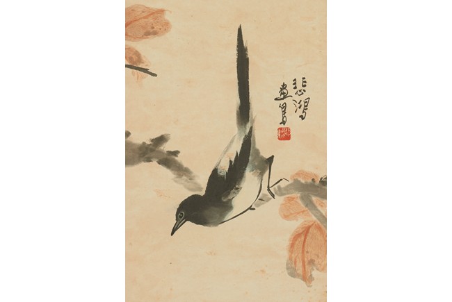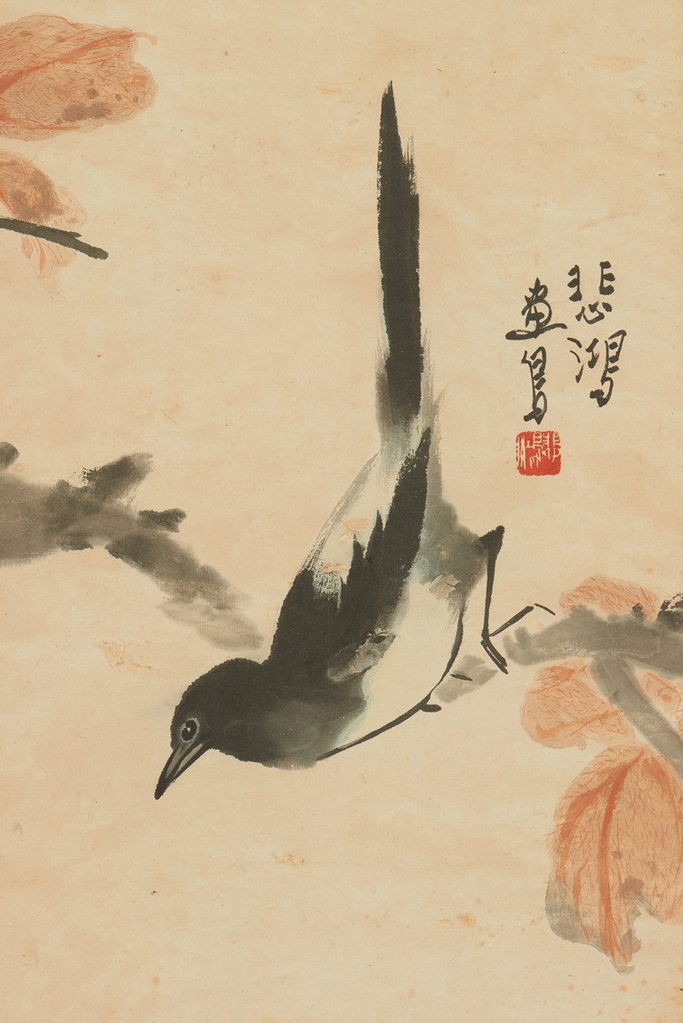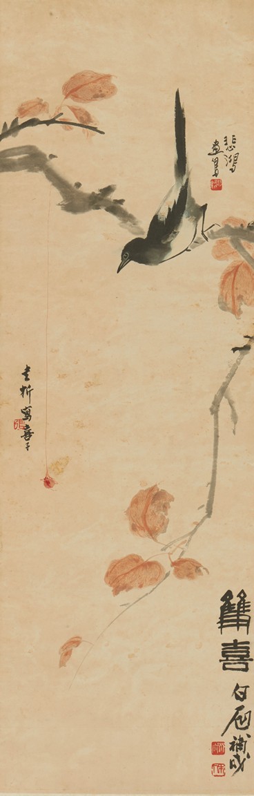Color and ink on paper. Magpie standing on plum tree. Hanging scroll. Artist signed include Qi BaiShi, Zhang ShuQi, Xu BeiHong.