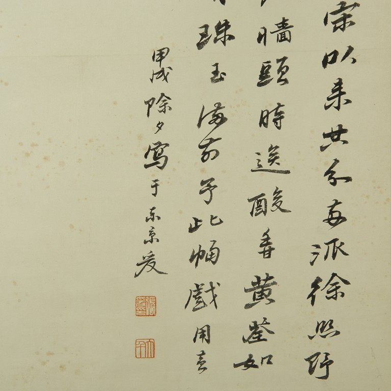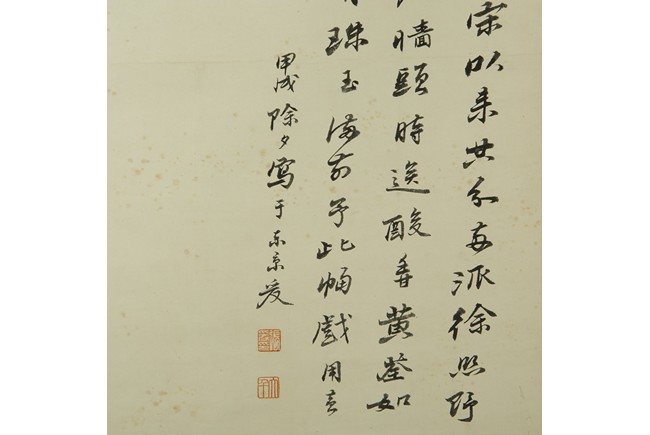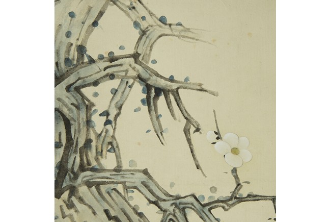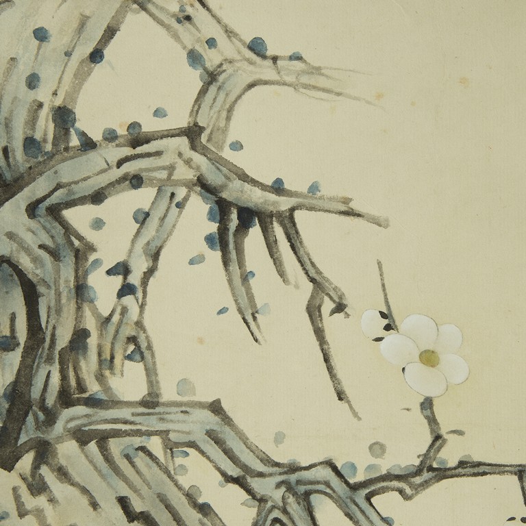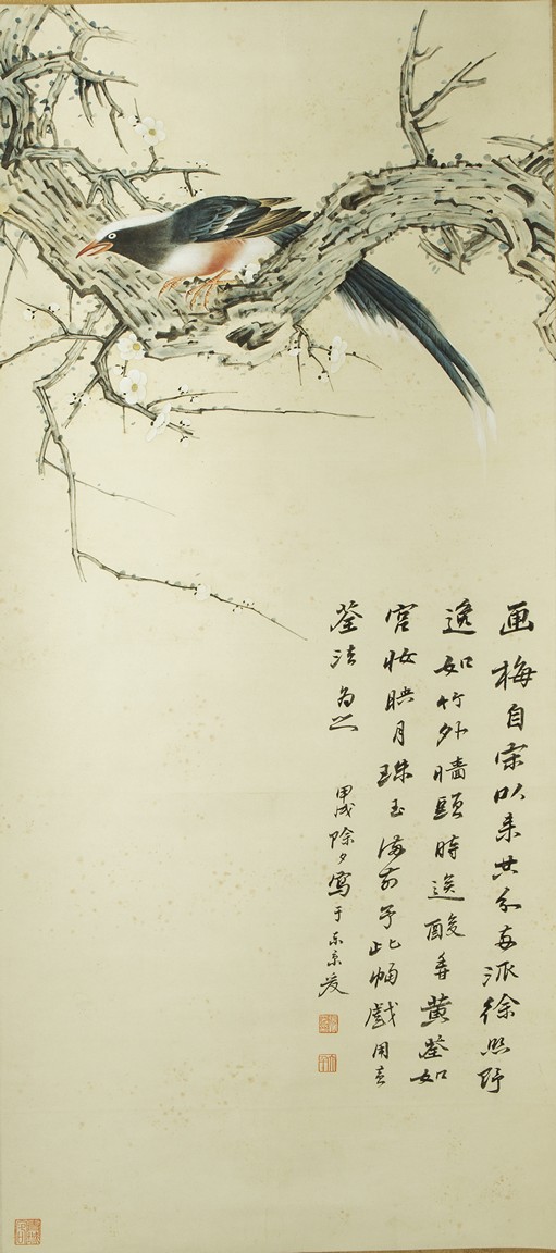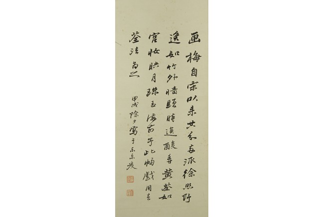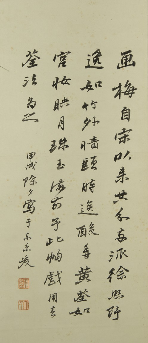 Color and ink on paper. Plum and blossom. Hanging scroll. Inscribed. With three seals of the artist.