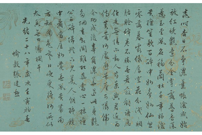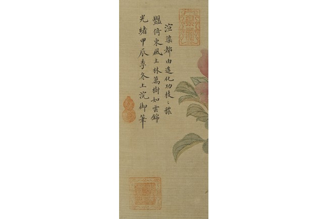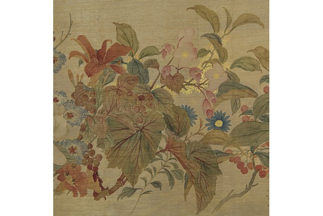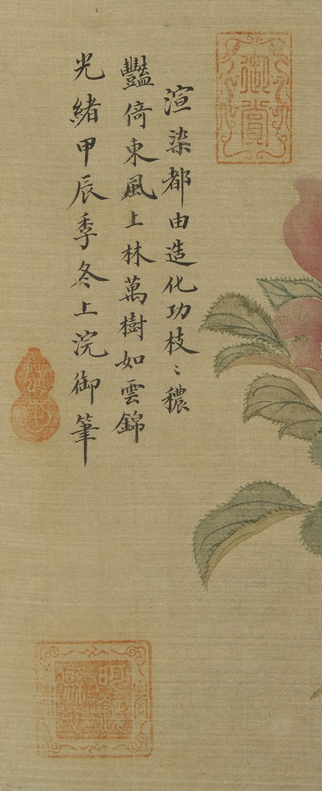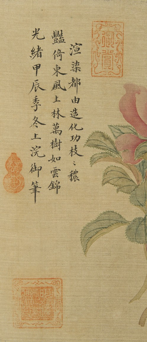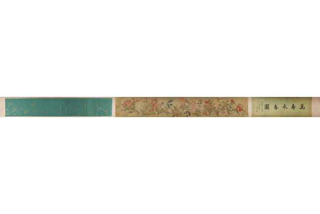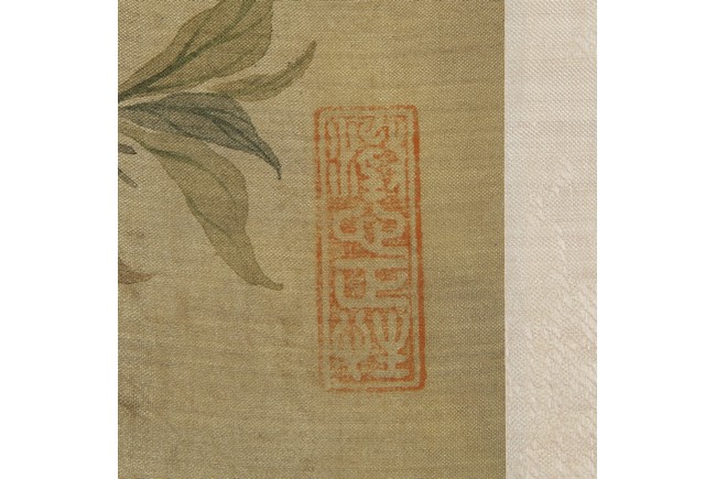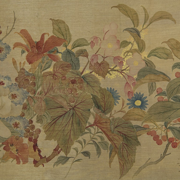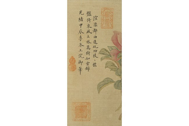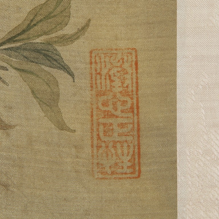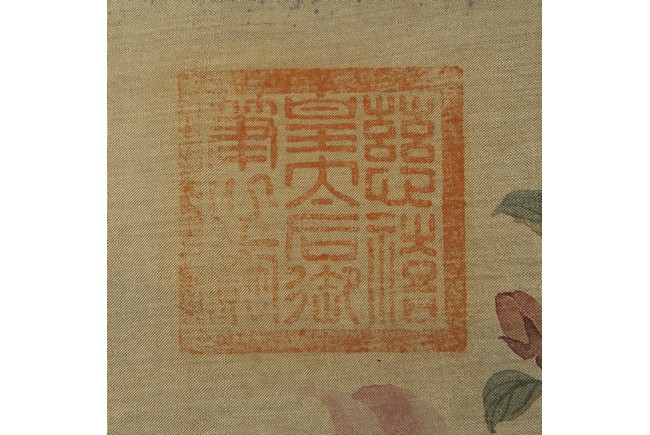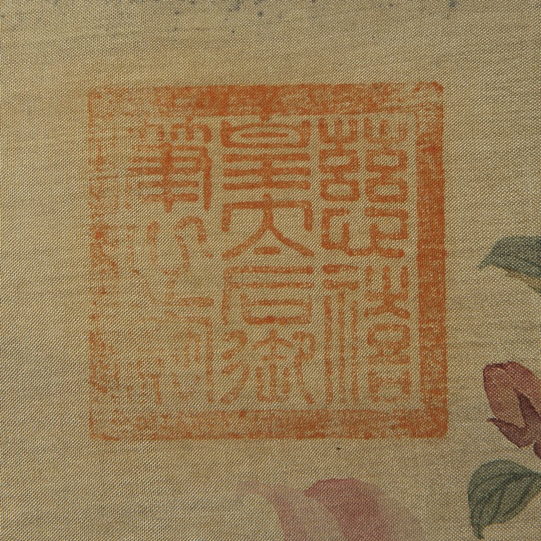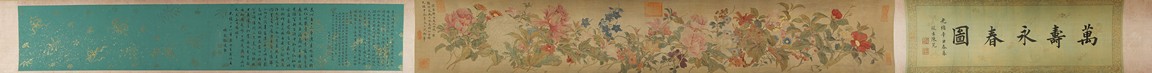 Color and ink on silk. Flowers. Frontpiece by Chen Mian, with two seals of the artist. The painting with six seals of the Emperor, with colophons and signed Chen Mian and Zhang Jianxun, with four seals.