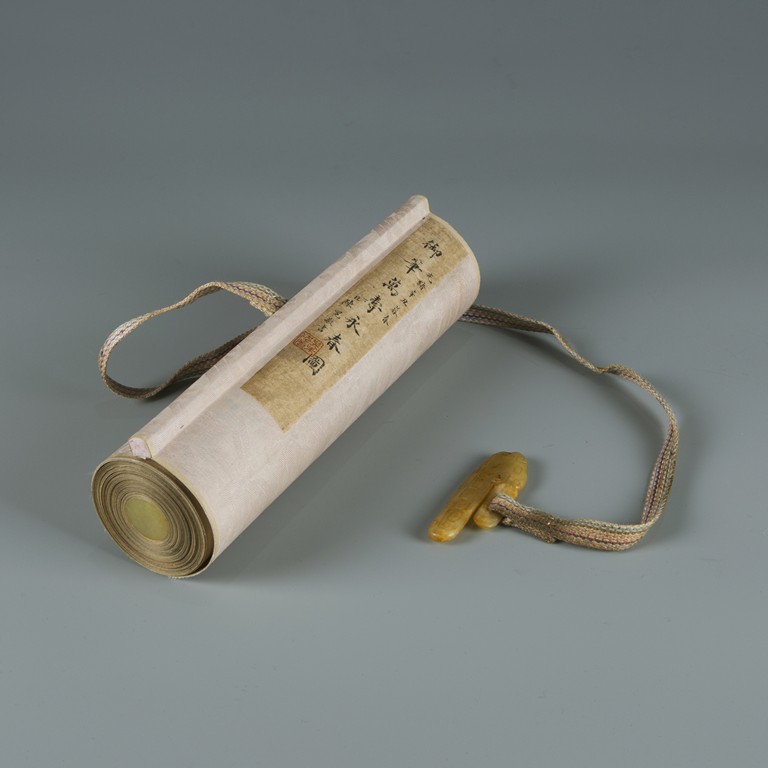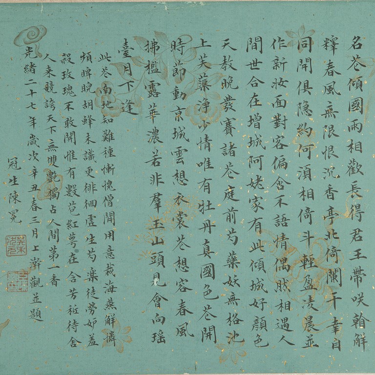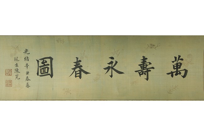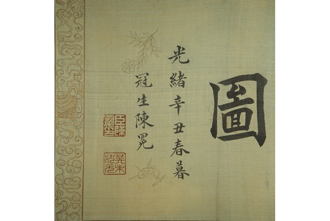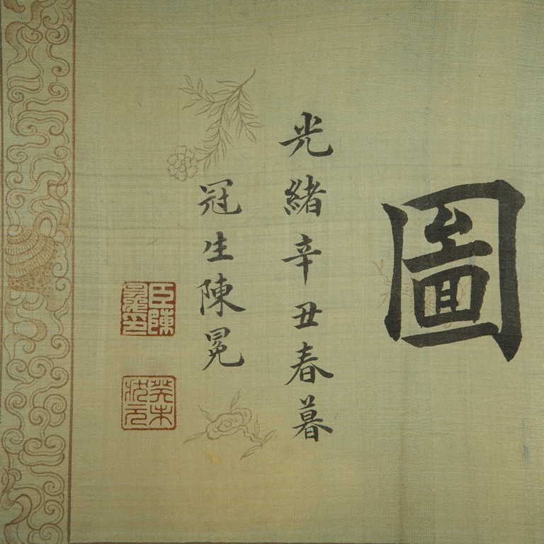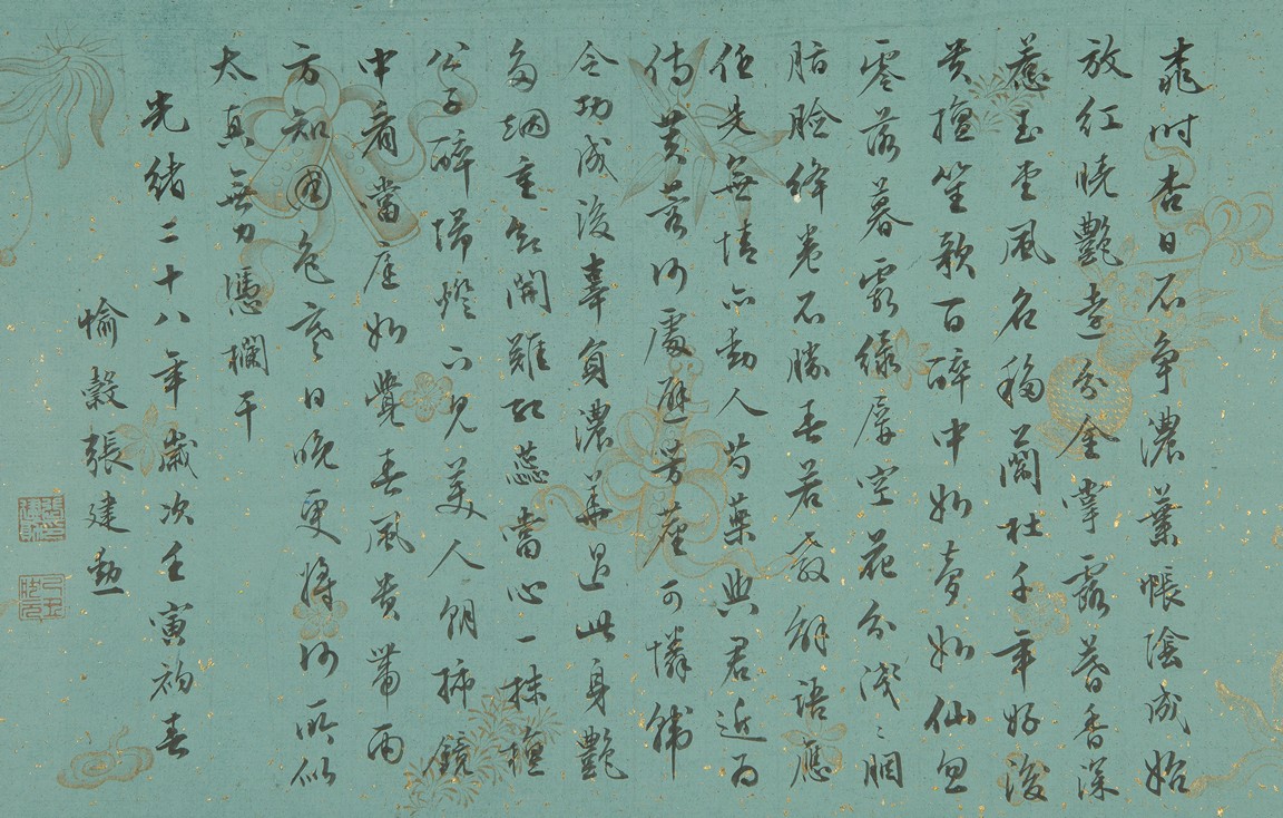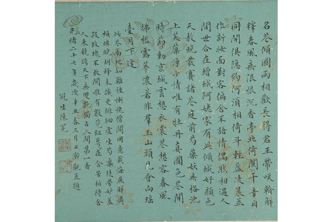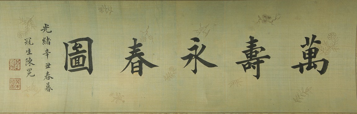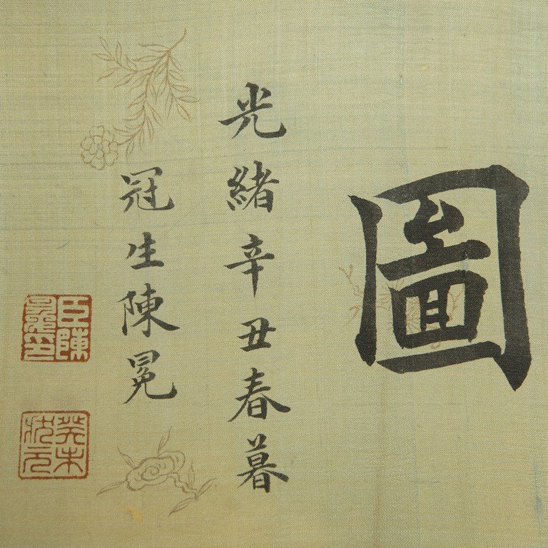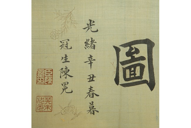 Color and ink on silk. Flowers. Frontpiece by Chen Mian, with two seals of the artist. The painting with six seals of the Emperor, with colophons and signed Chen Mian and Zhang Jianxun, with four seals.