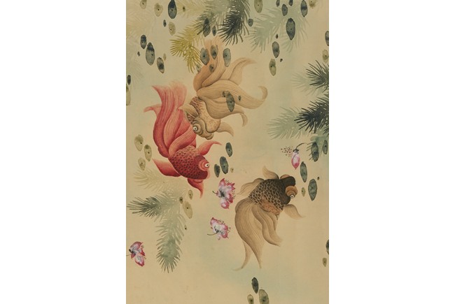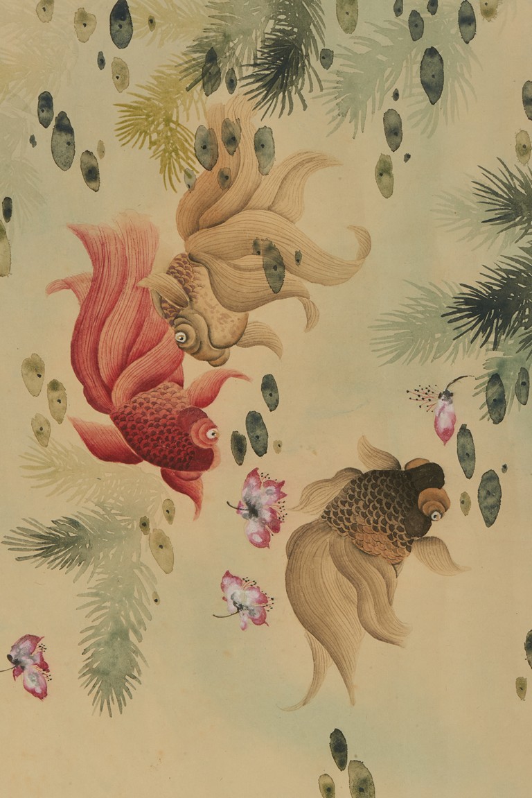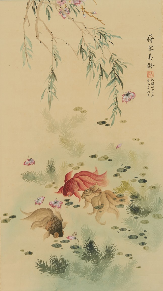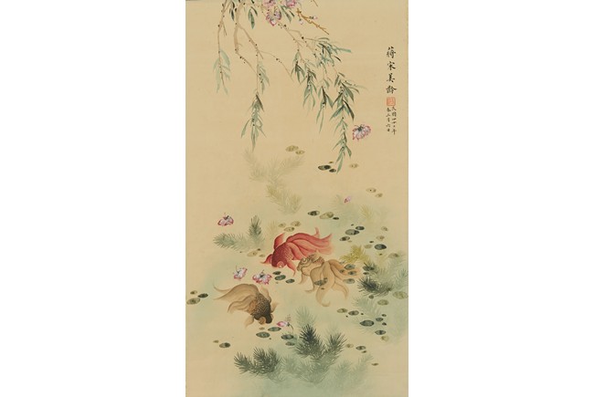 Color and ink on paper. Goldfish. Mounted for framing. Signed jiang song meiling, with one seal of the artist.