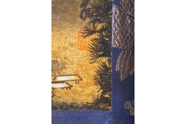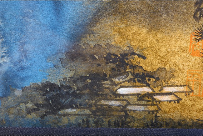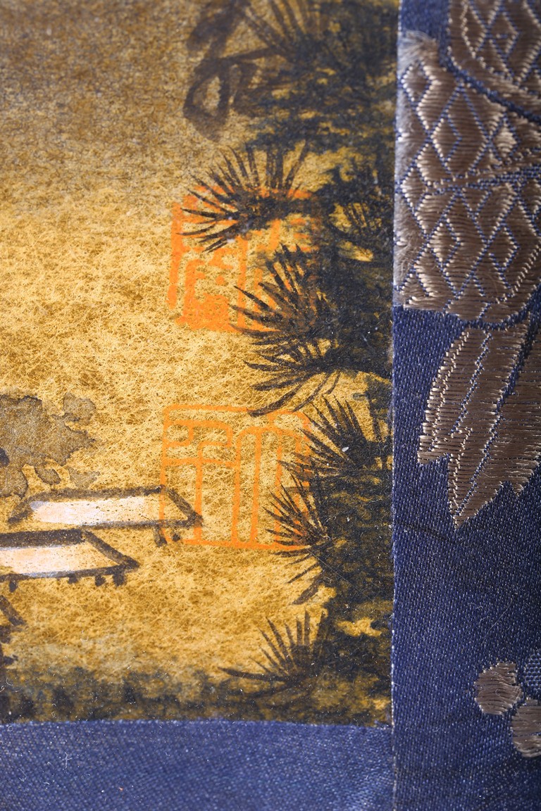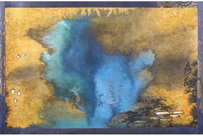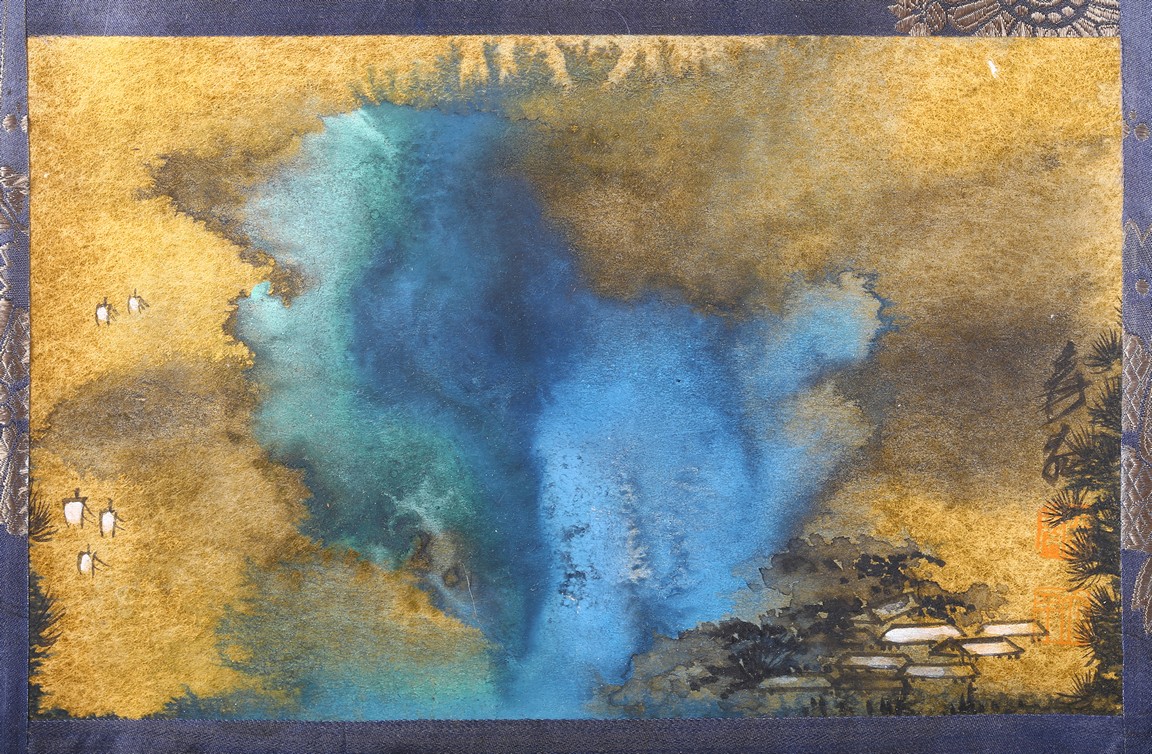 Color and ink on gold cardboard. Framed. Mountain landscape. Signed and with two seals of the artist.
