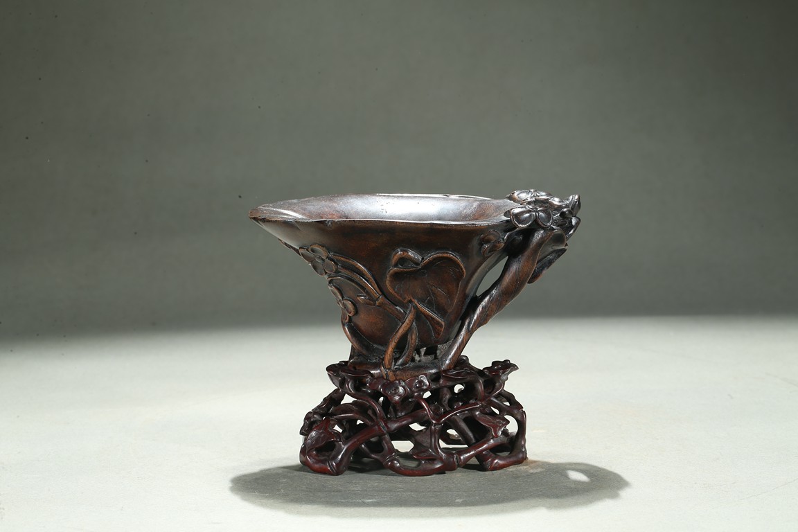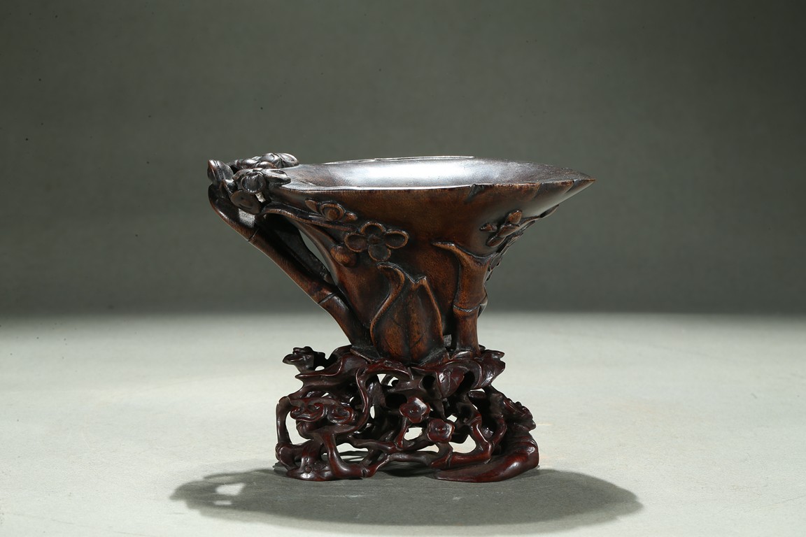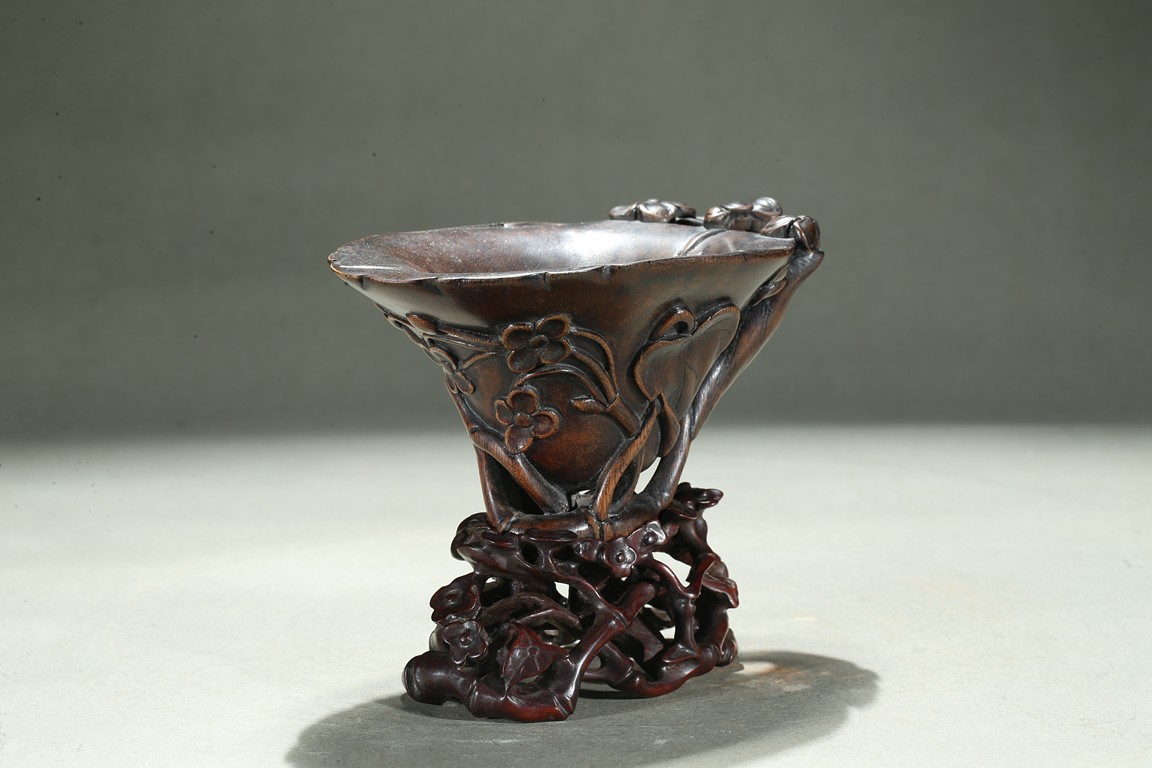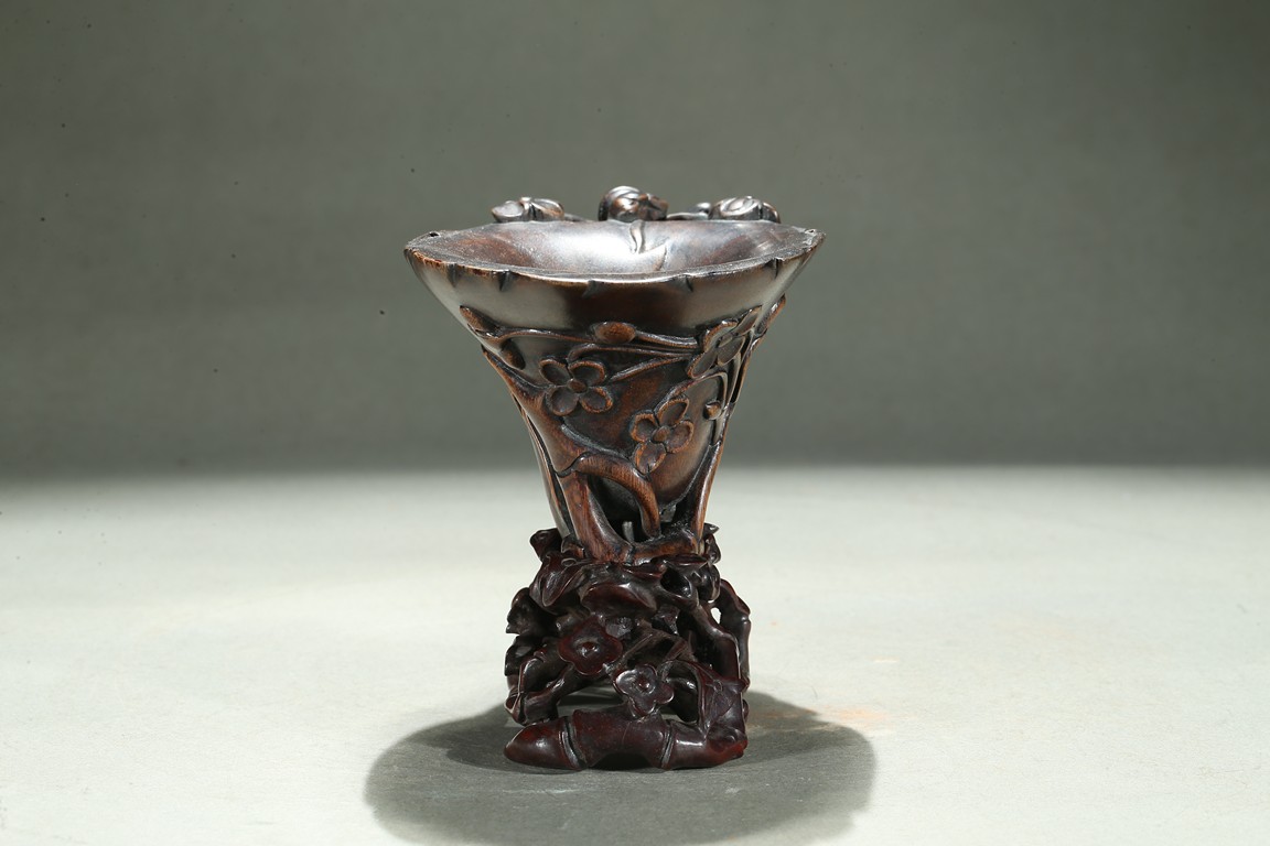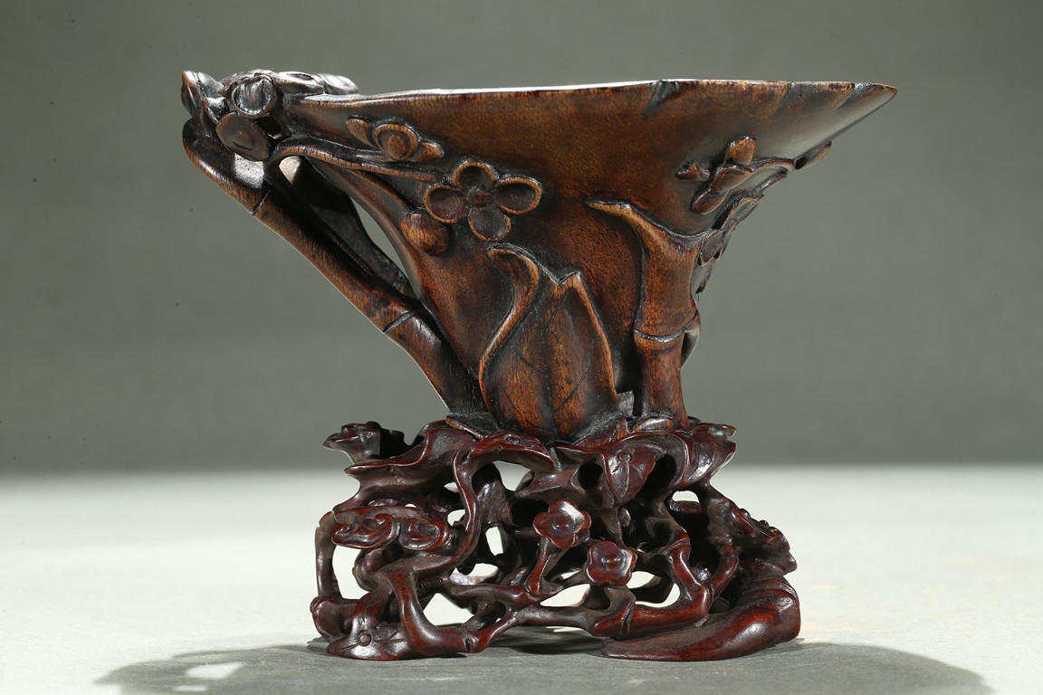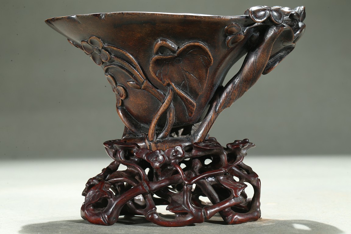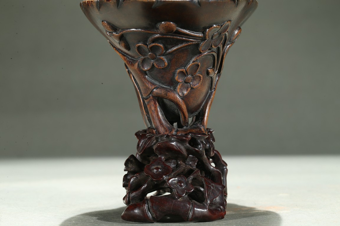 The tapered cup carved on the exterior with an irregular surface with subtle ridges and knots simulating a tree trunk, one side detailed in high relief with a gnarled branch and thin twigs issuing prunus blossoms of varying sizes and extending across the exterior, the base and onto the interior of the cup, with fitted carved wood stand.