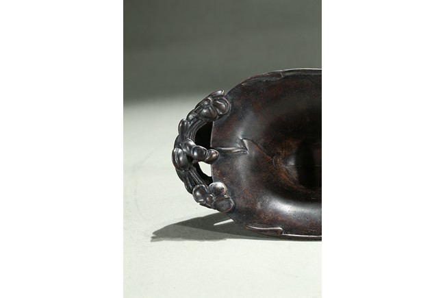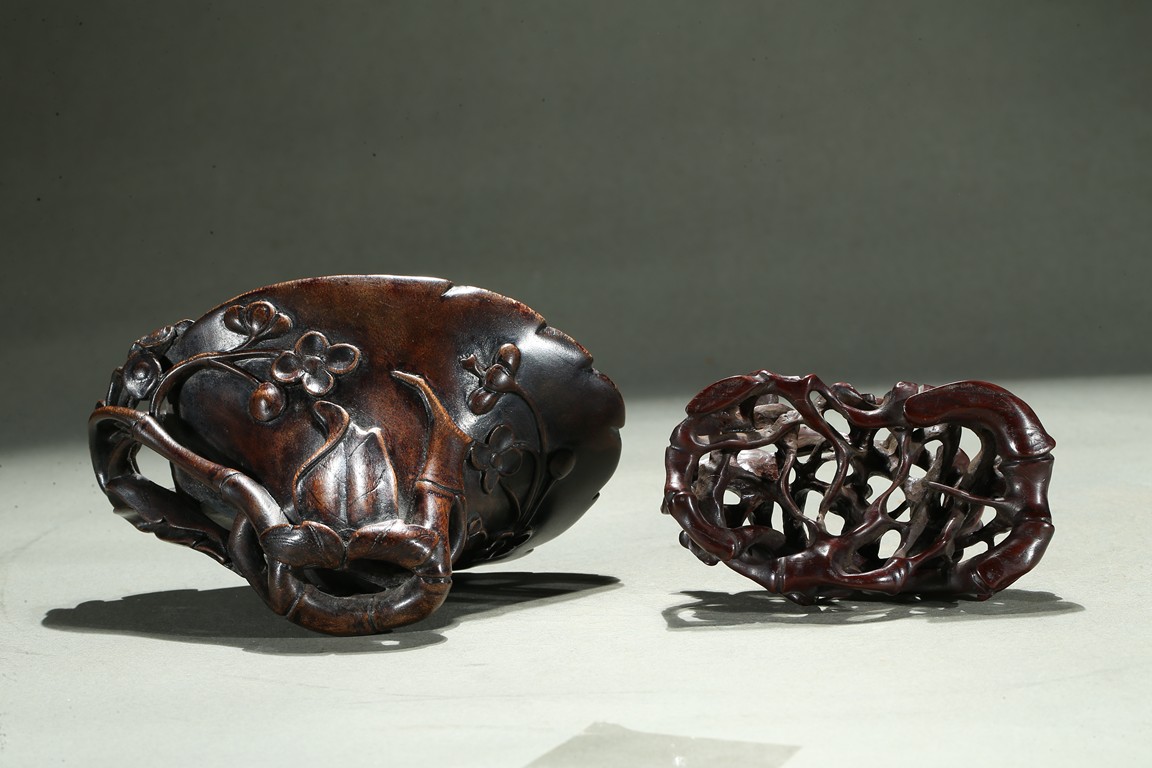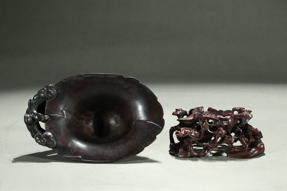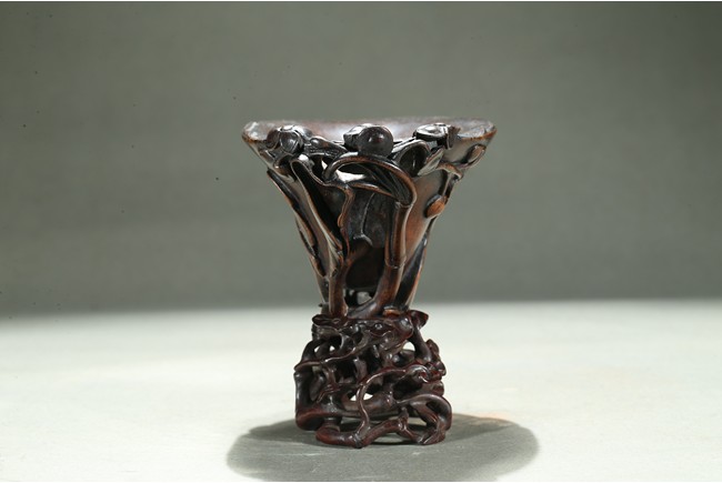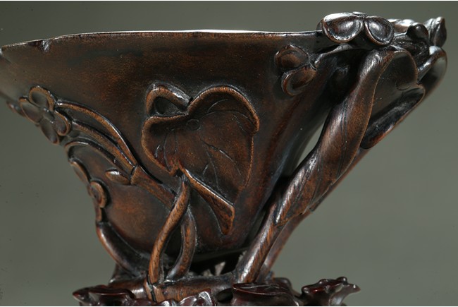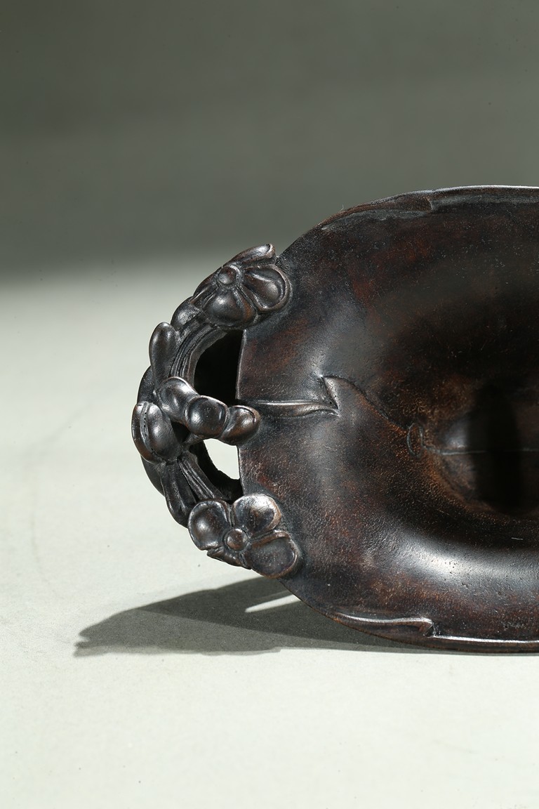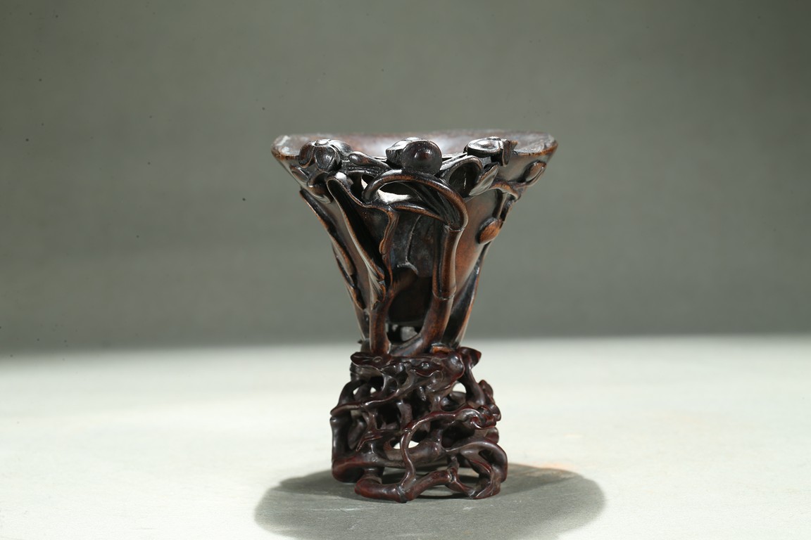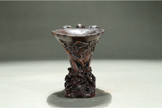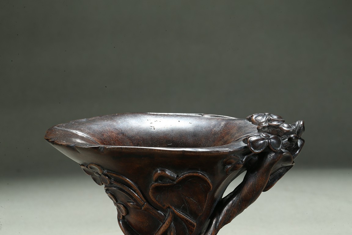 The tapered cup carved on the exterior with an irregular surface with subtle ridges and knots simulating a tree trunk, one side detailed in high relief with a gnarled branch and thin twigs issuing prunus blossoms of varying sizes and extending across the exterior, the base and onto the interior of the cup, with fitted carved wood stand.