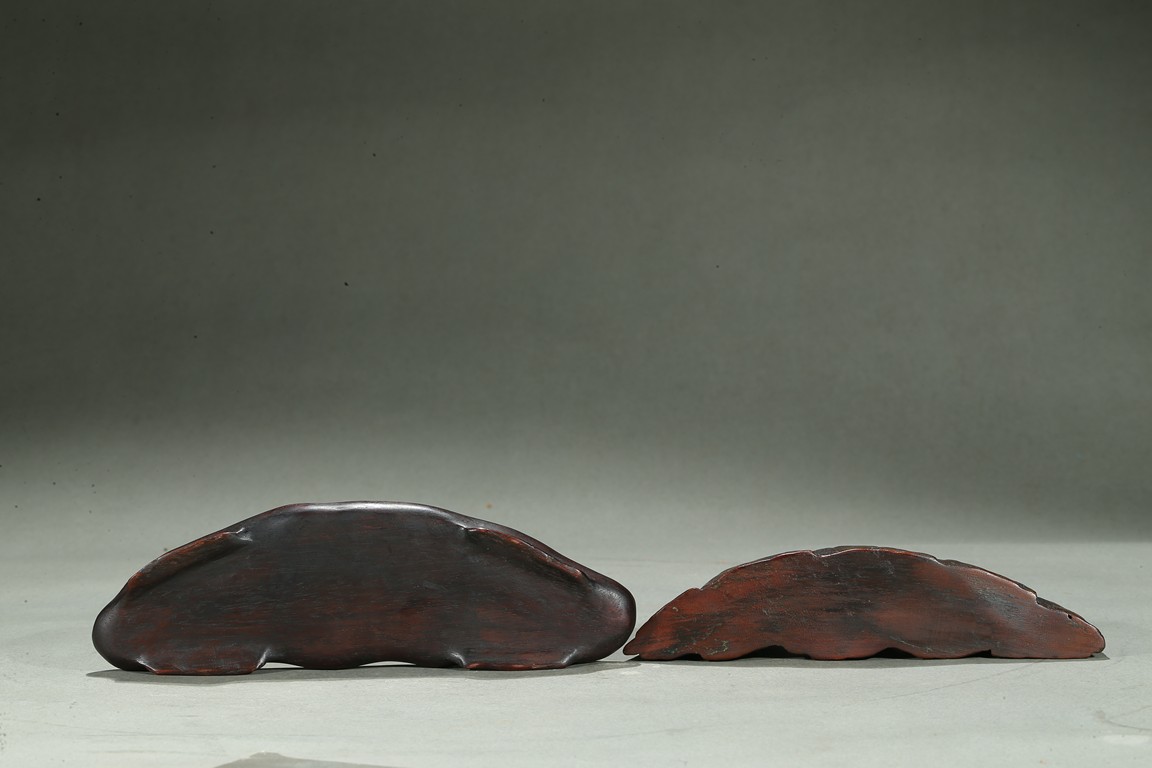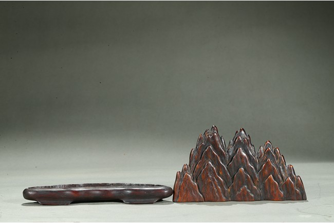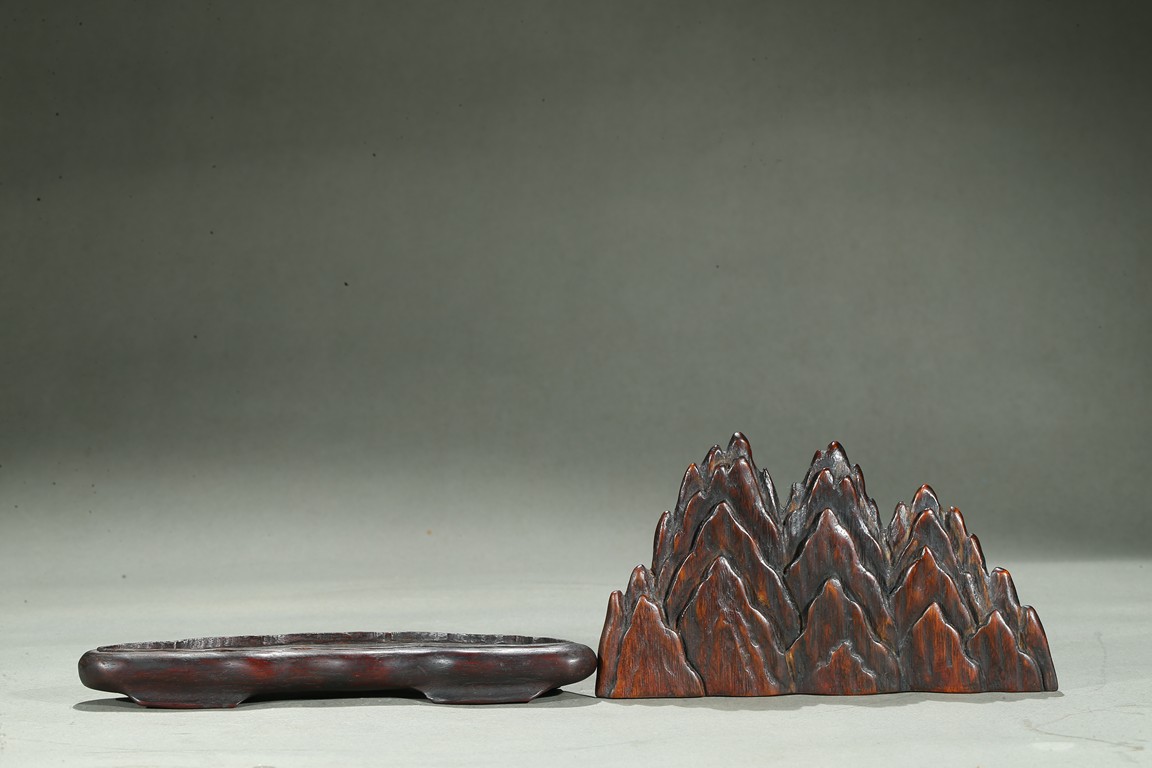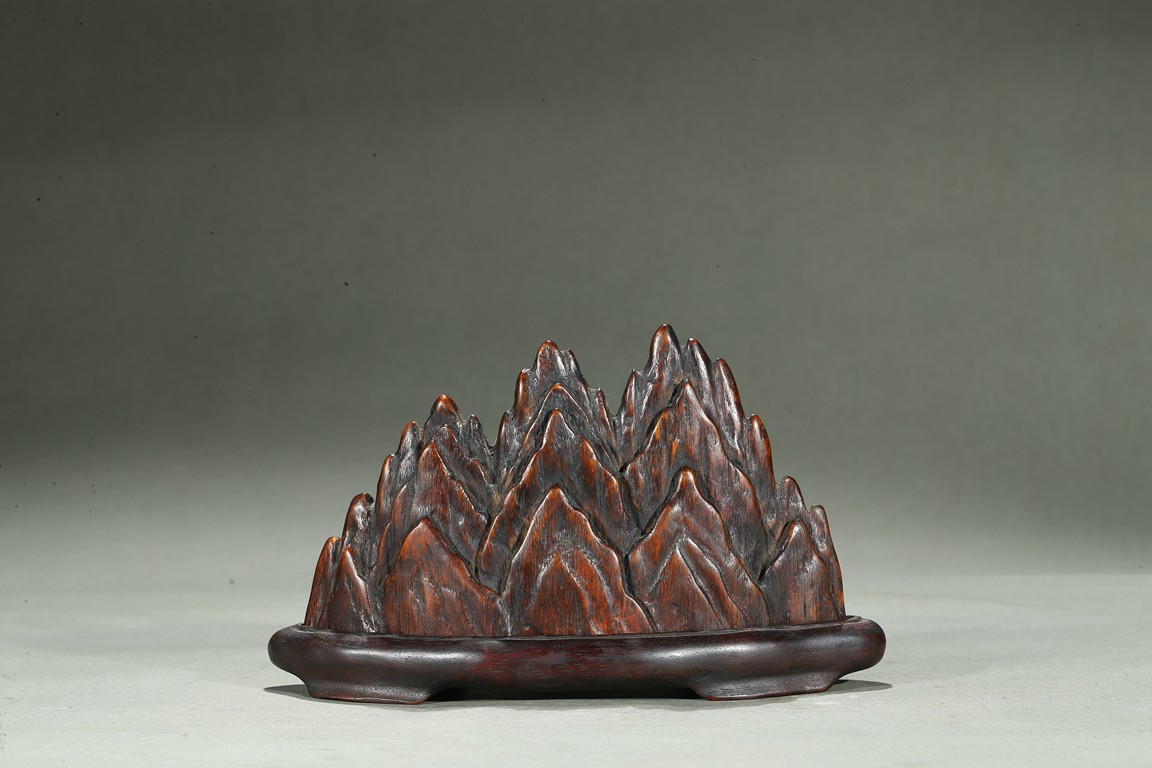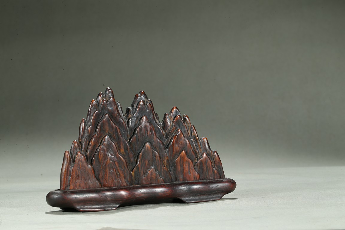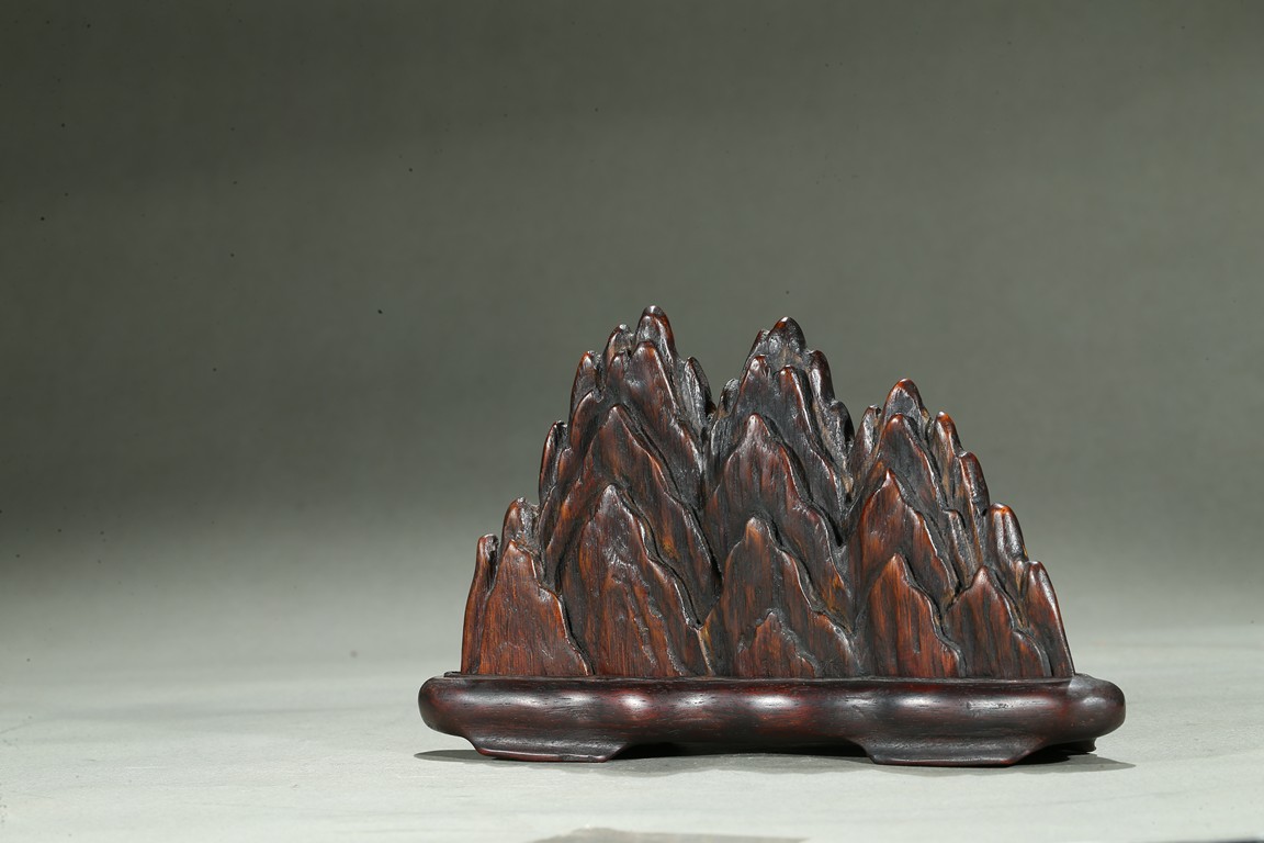 The agarwood brush rest modelled in the form of peaked mountain, fitted on a rosewood stand. Qing Dynasty period.