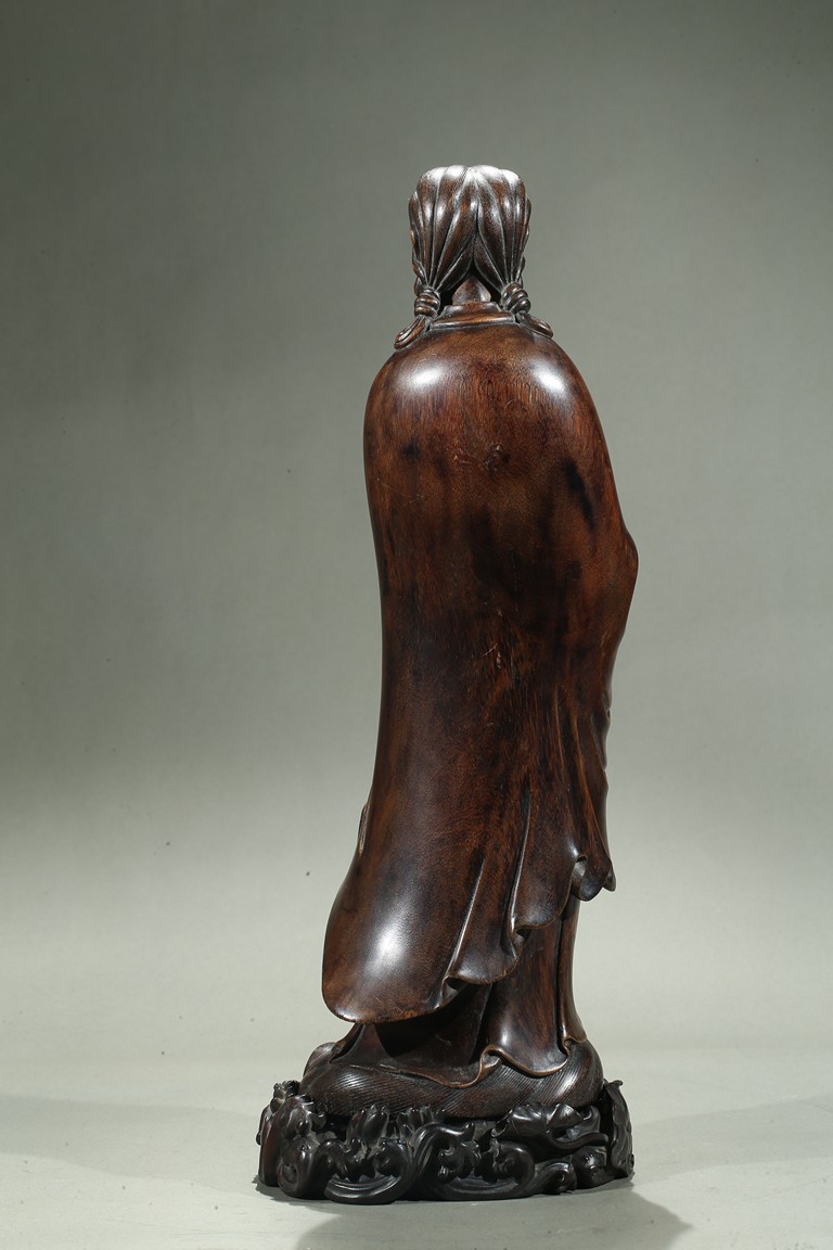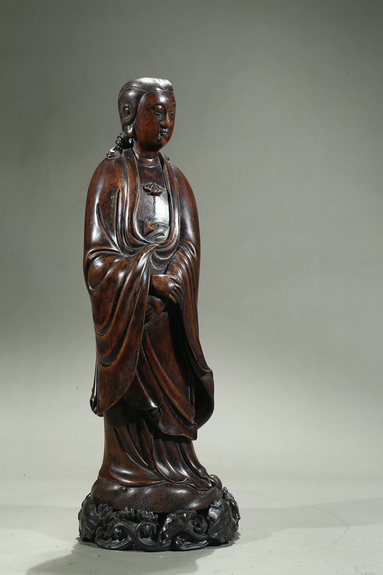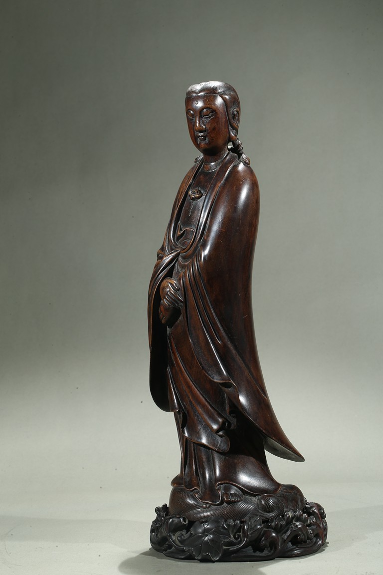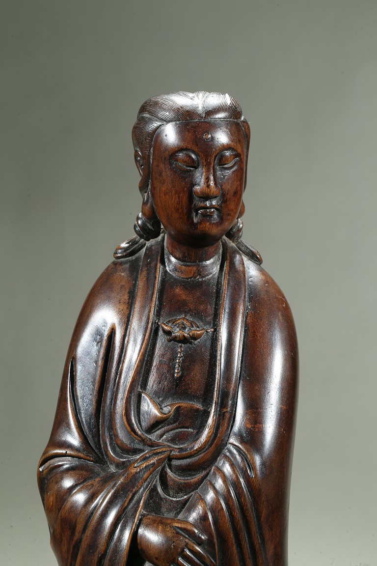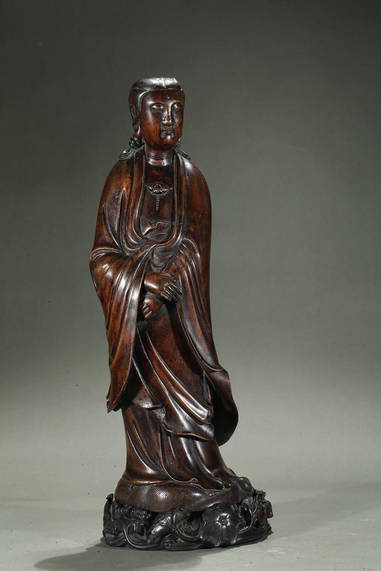 Carved standing with the head turned slightly to the left, wearing a loose fitting robe billowing in the wind and opening at the chest to reveal the beaded necklace, her slender hands emerging from the sleeves to hold before the belly, the face with downcast eyes and a serene expression, with a fitted carved blooming lotus flower zitan stand.