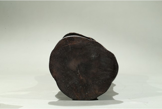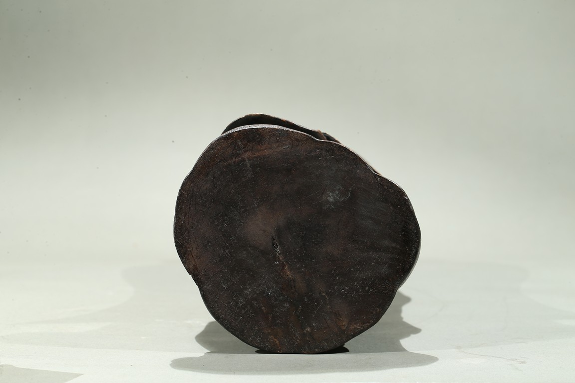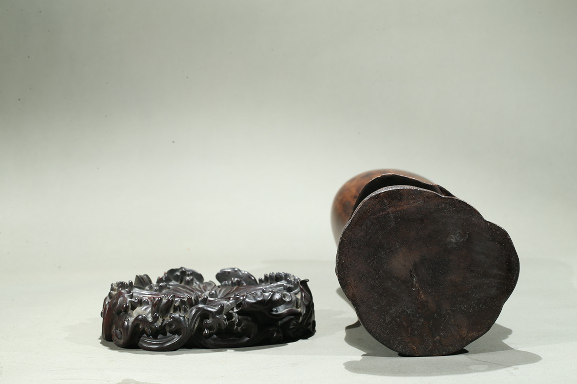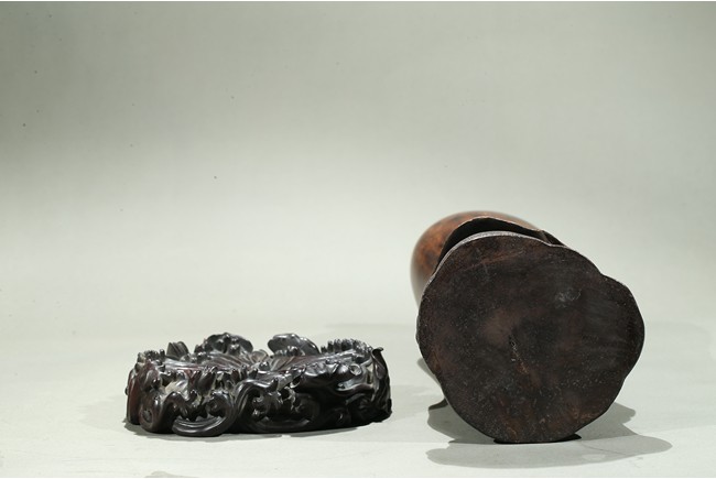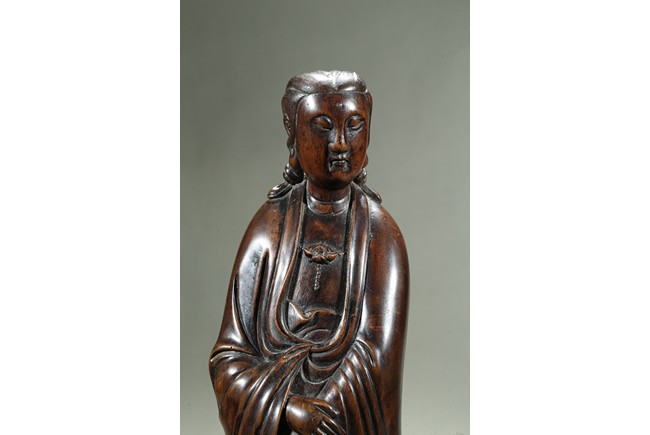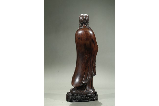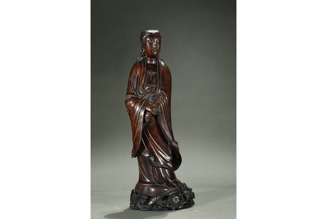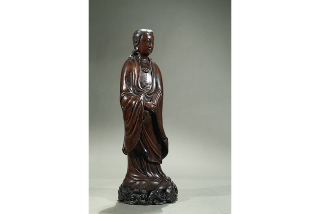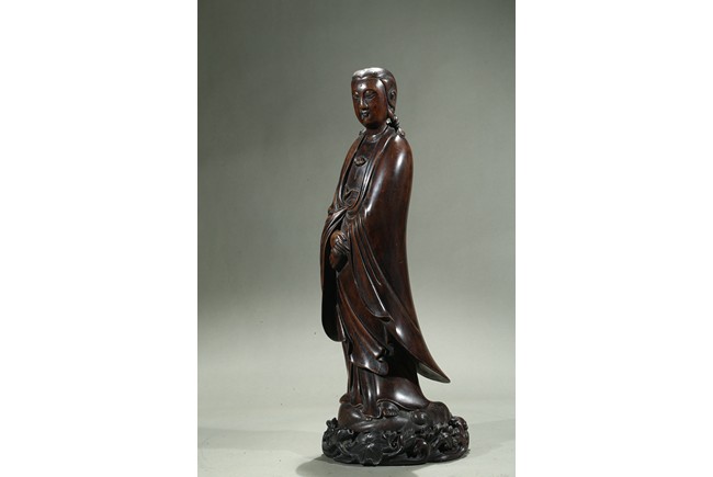 Carved standing with the head turned slightly to the left, wearing a loose fitting robe billowing in the wind and opening at the chest to reveal the beaded necklace, her slender hands emerging from the sleeves to hold before the belly, the face with downcast eyes and a serene expression, with a fitted carved blooming lotus flower zitan stand.