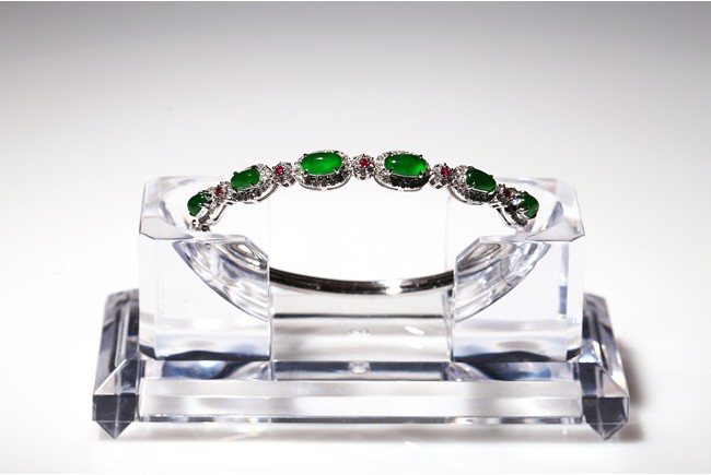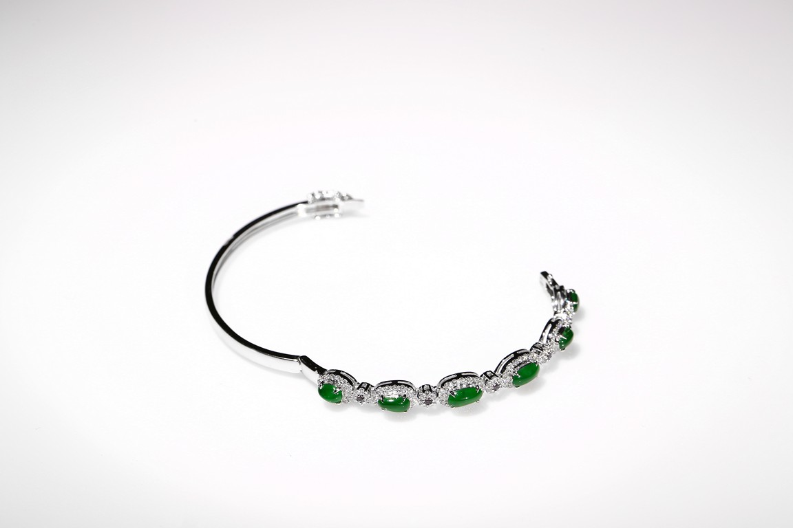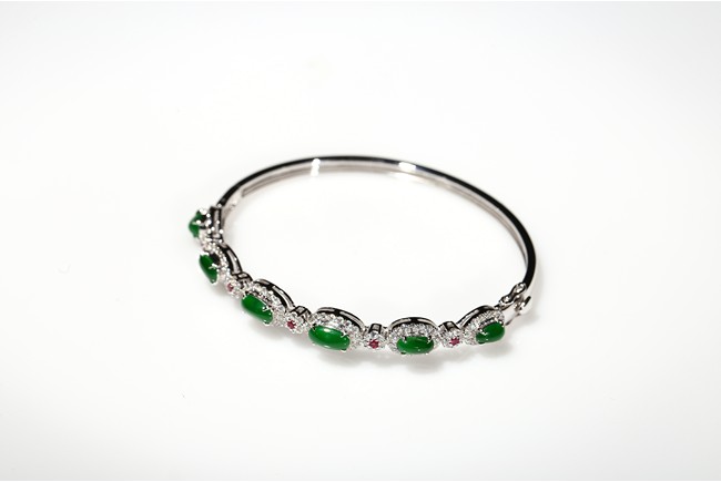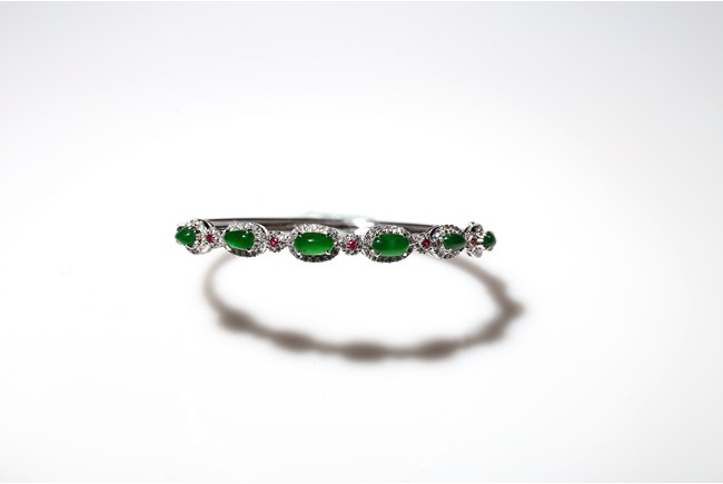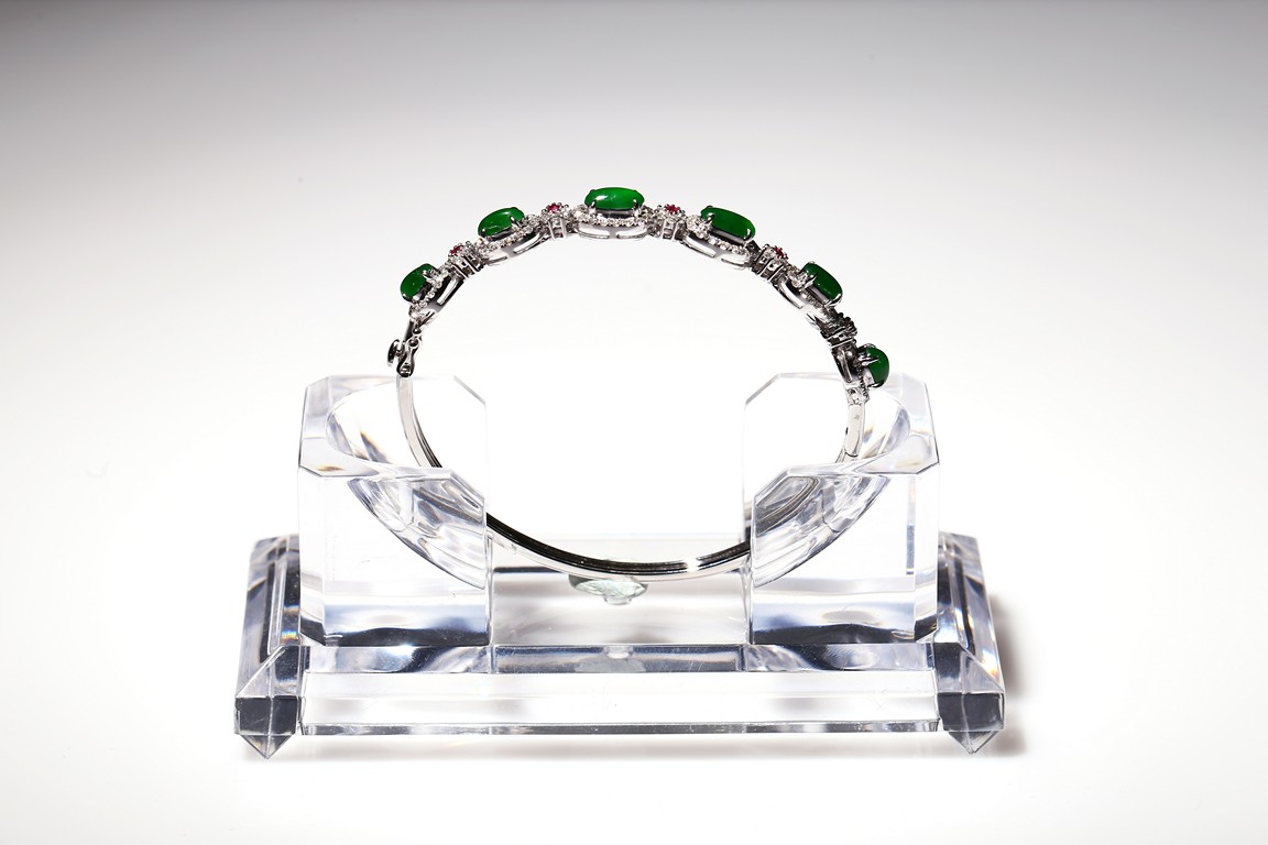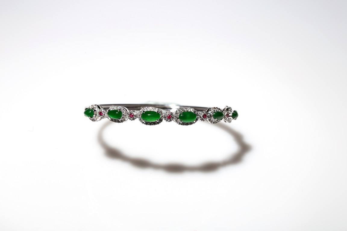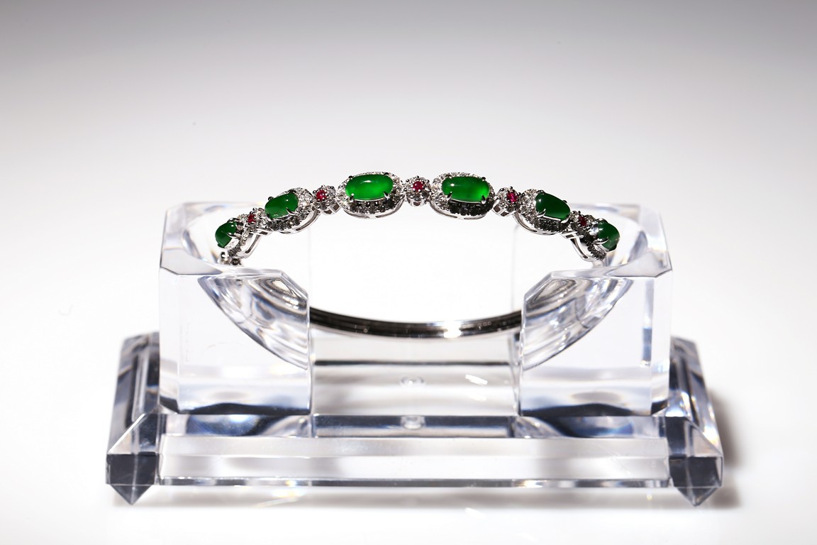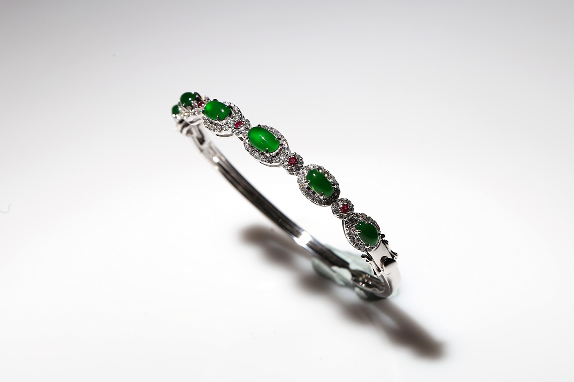 Six true fine imperial green Jadeite Jade cabochons set in 18K white gold a top white diamonds approximately 1.0ct and accent with ruby. Accompanied by a certificate from Hong Kong Jade & Stone Lab indicating natural type A jadeite jade with no resin is detected.