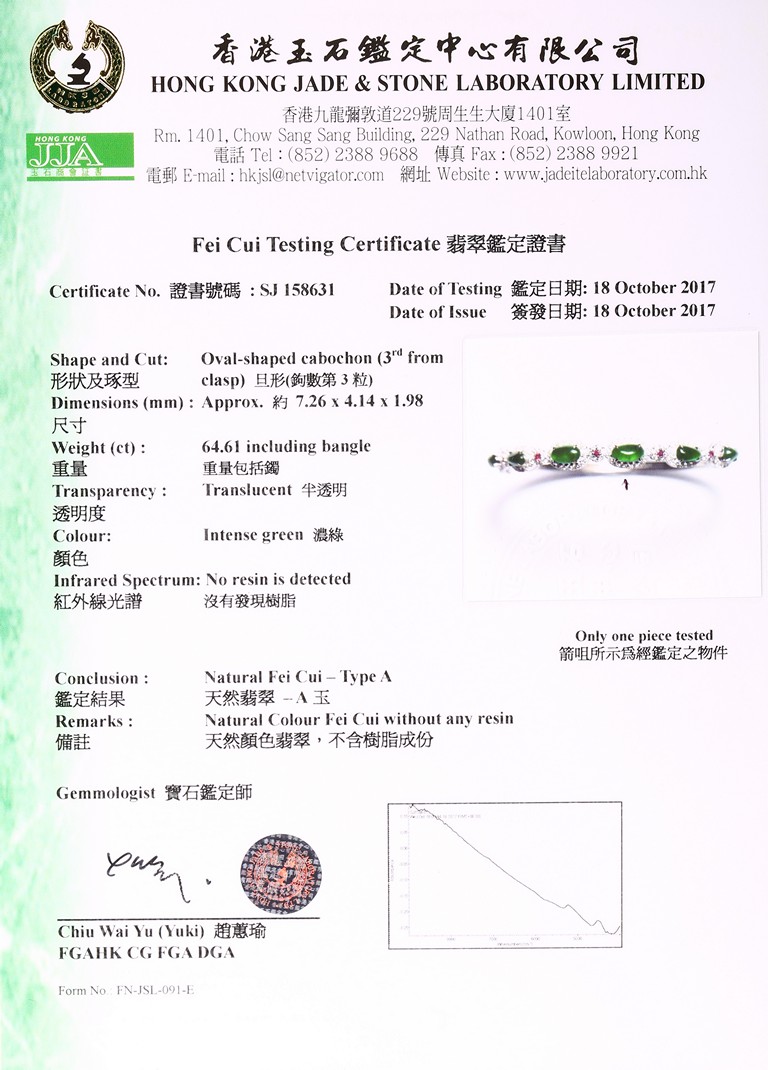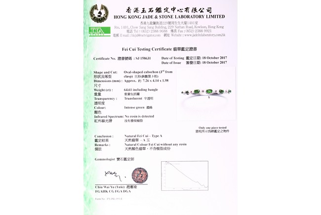 附香港玉石寶石中心鑒定證書證明A級翡翠 Accompanied by report from Hong Kong Jade & Stone Laboratory stating that it is natural jadeite.