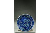 A BLUE GROUND YELLOW AND RED GLAZE DRAGON DISH