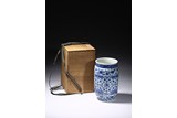 A BLUE AND WHITE 'FOLIATE MOTIF' CYLINDRICAL JAR