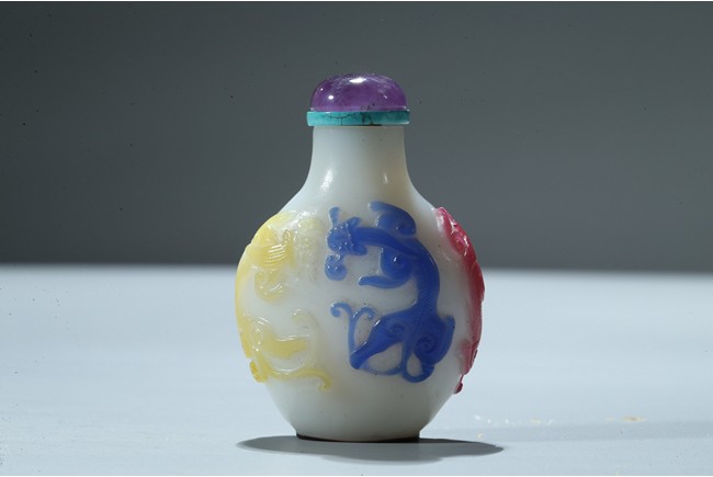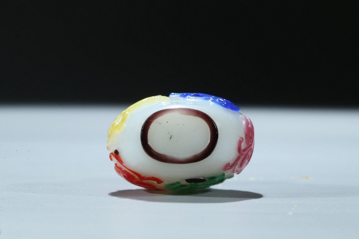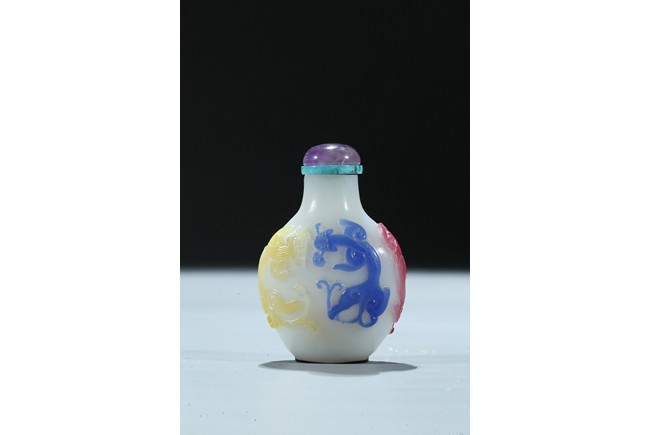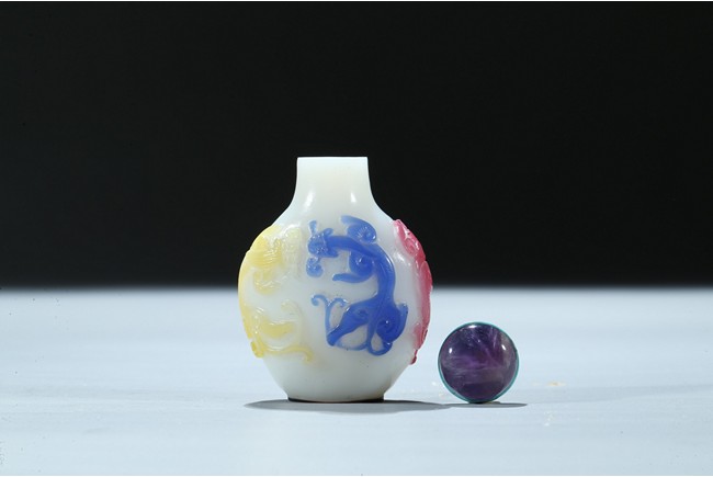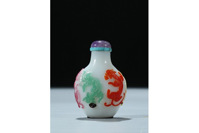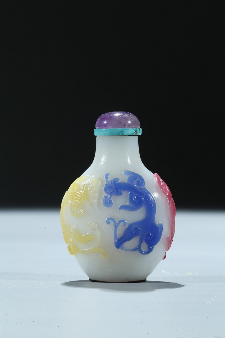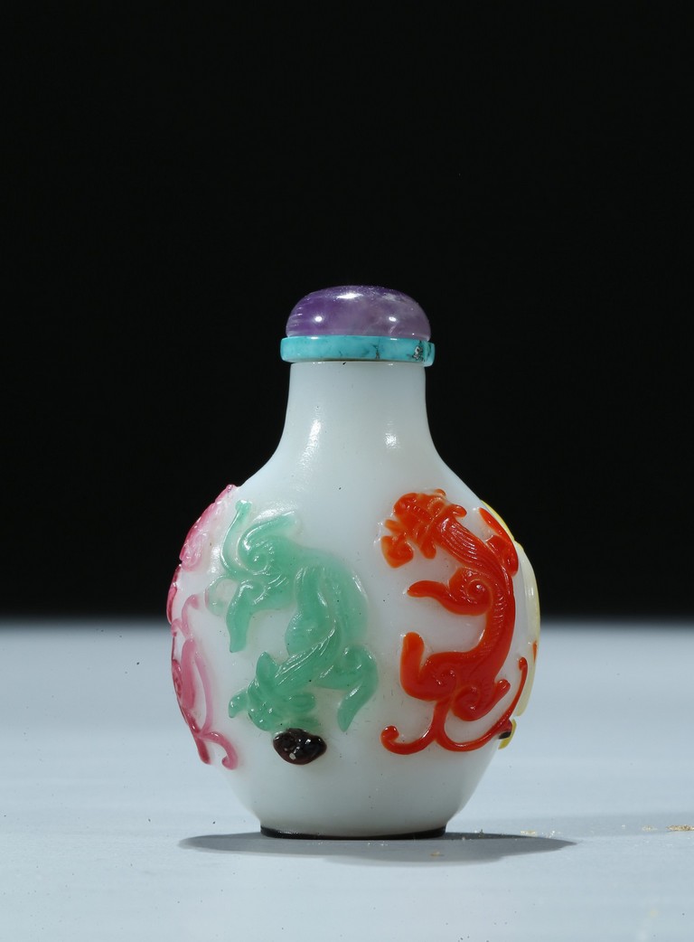 The snuff bottle is carved with a continuous design of coiled Chilong in translucent overlays, with yellow, blue, red, pink, and green tone, all against the opaque white ground. Qing Dynasty period.