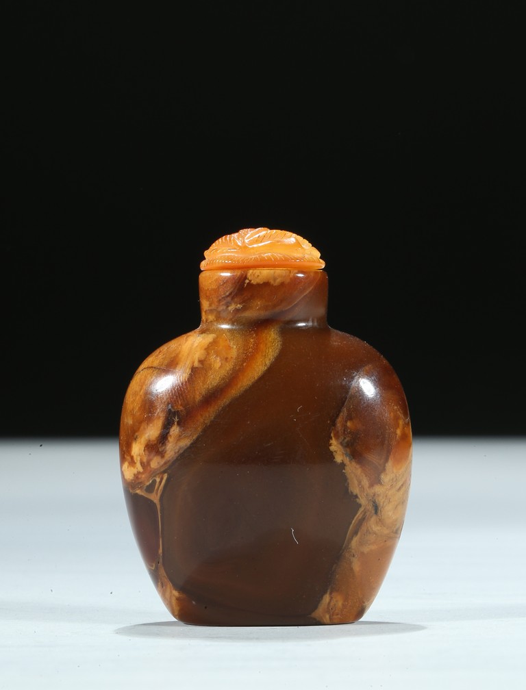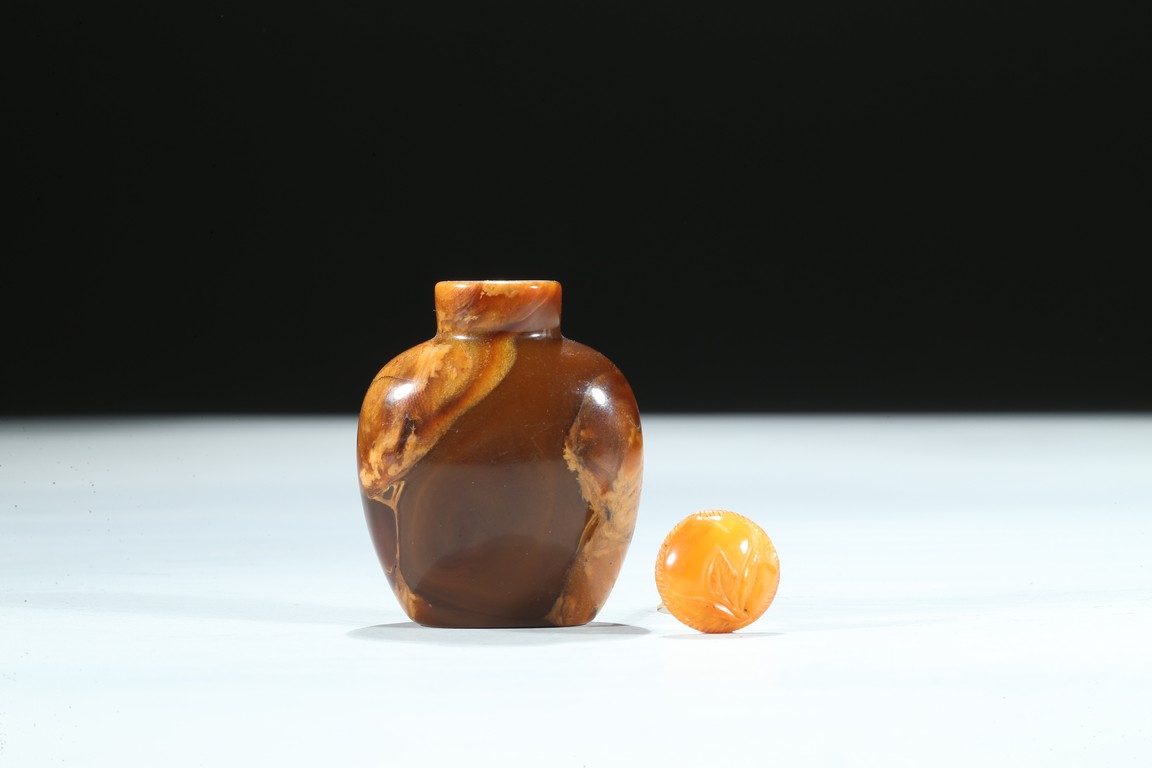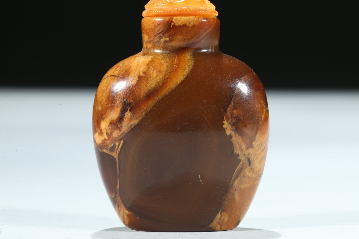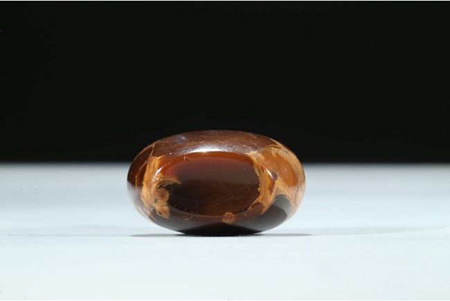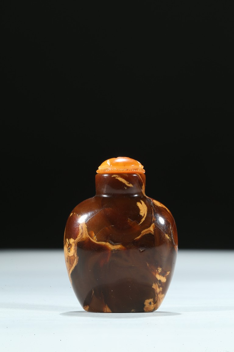 Of oval section, the amber is of mottled and opaque brown and ochre tone. Qing Dynasty period.