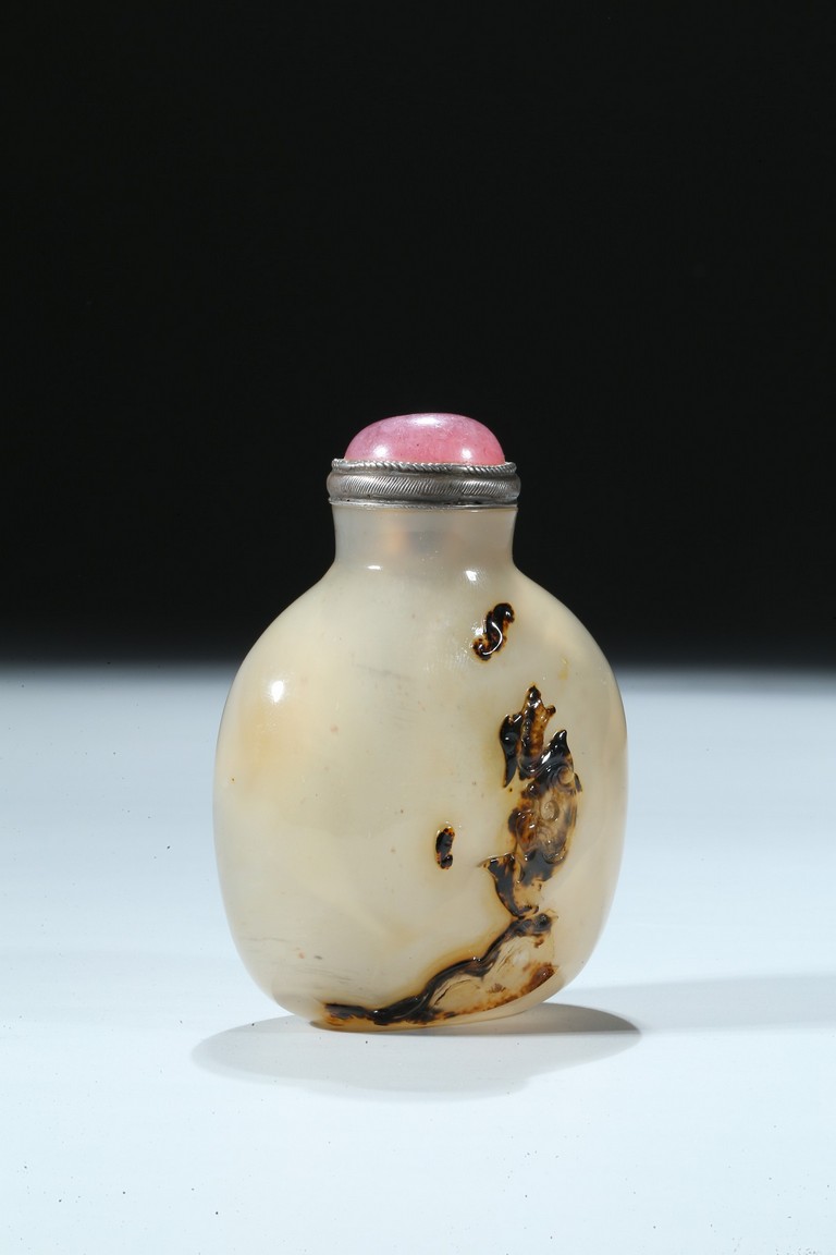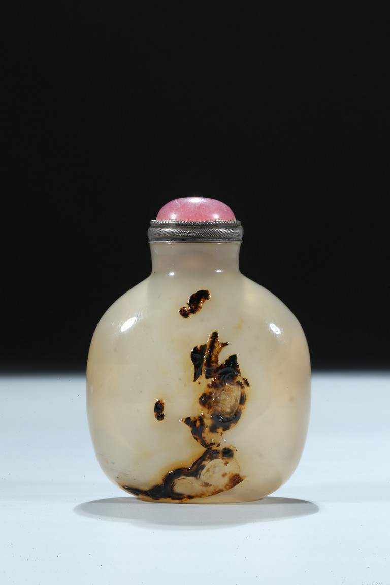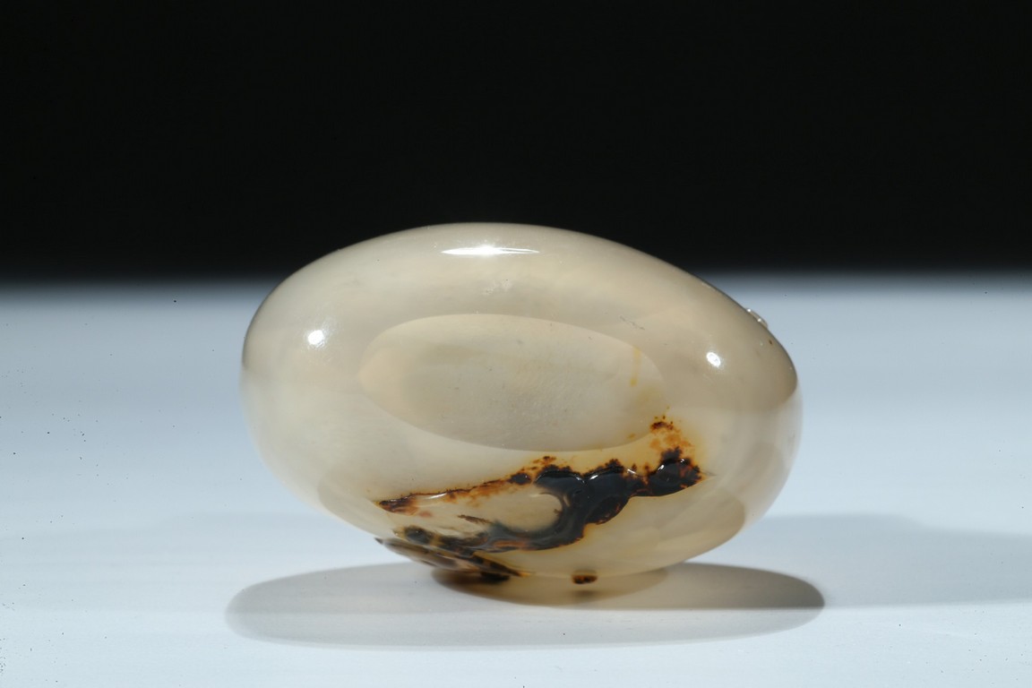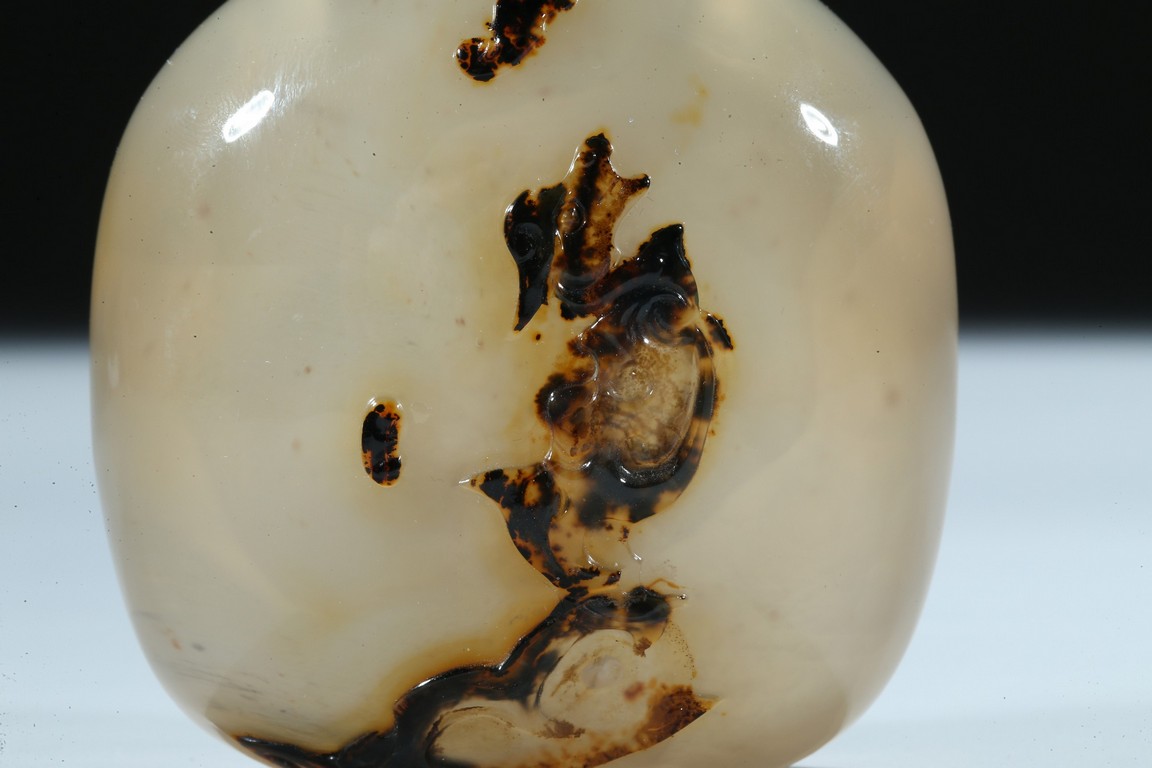 Of oblong form, the bottle is carved on one side utilizing the dark black areas with a dragon emerging from the ocean, the other side similarly depicting a jumping horse. Qing Dynasty period.