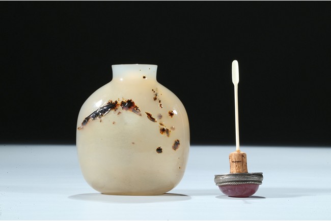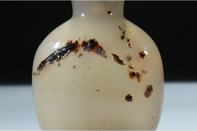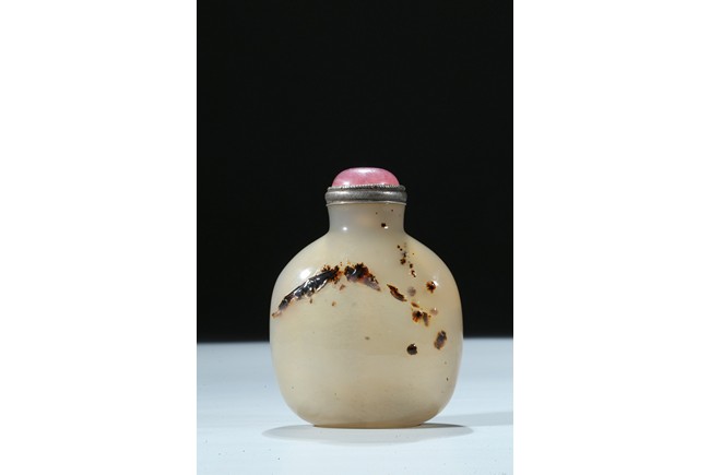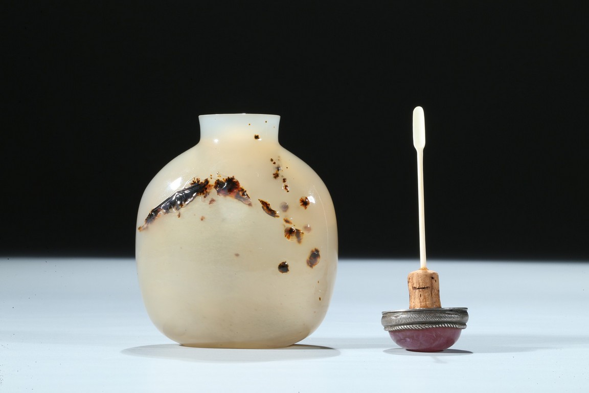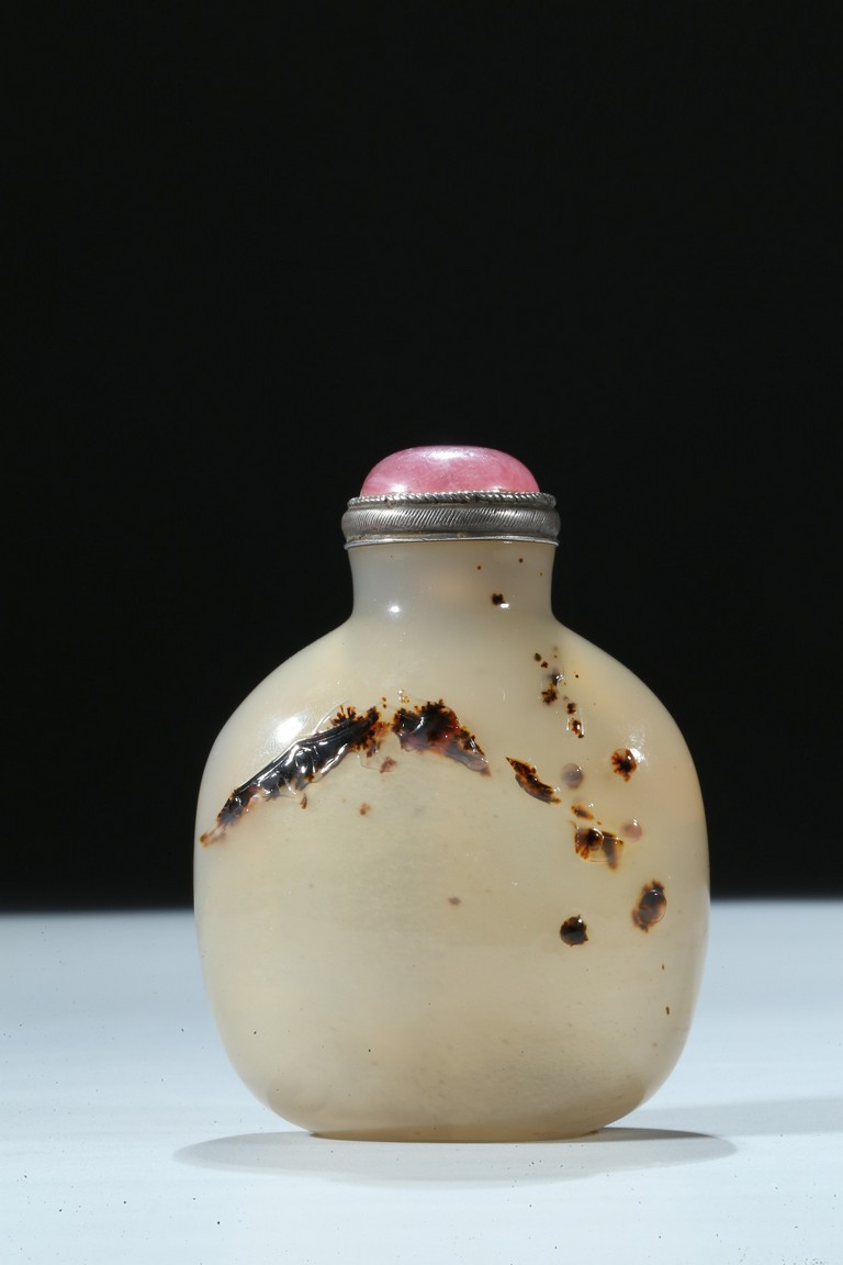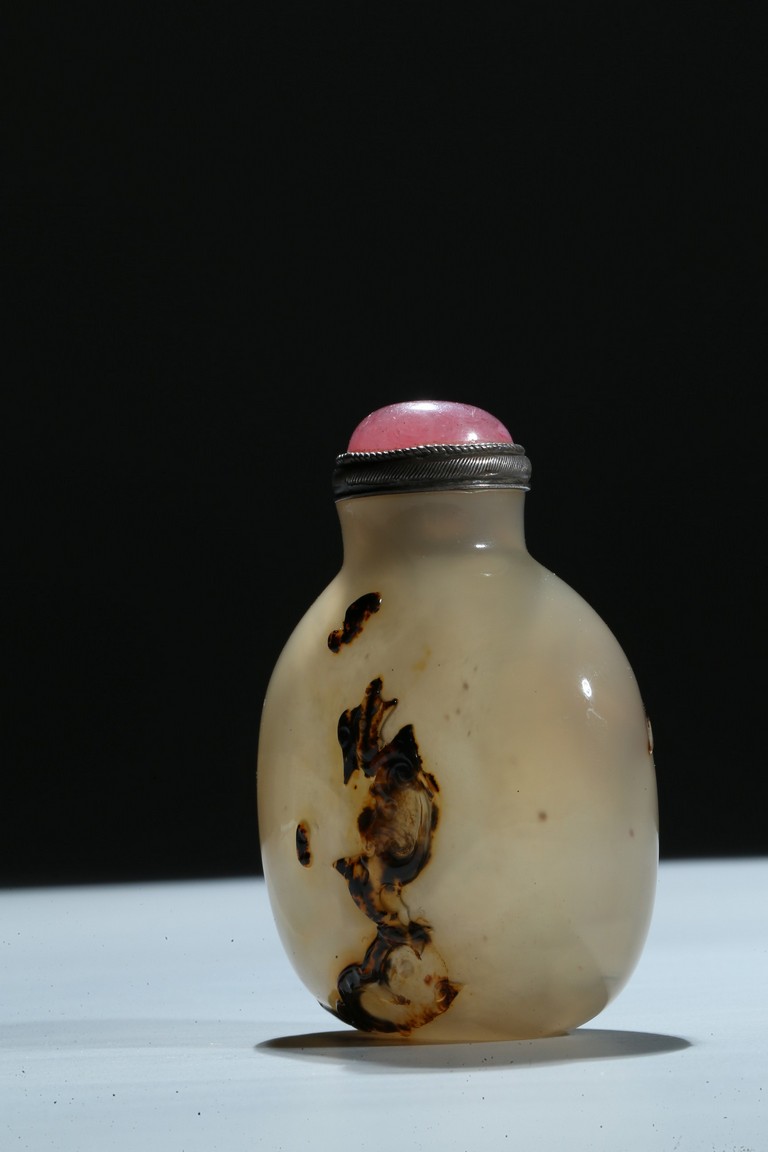 Of oblong form, the bottle is carved on one side utilizing the dark black areas with a dragon emerging from the ocean, the other side similarly depicting a jumping horse. Qing Dynasty period.