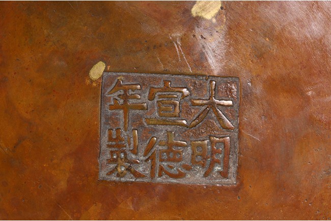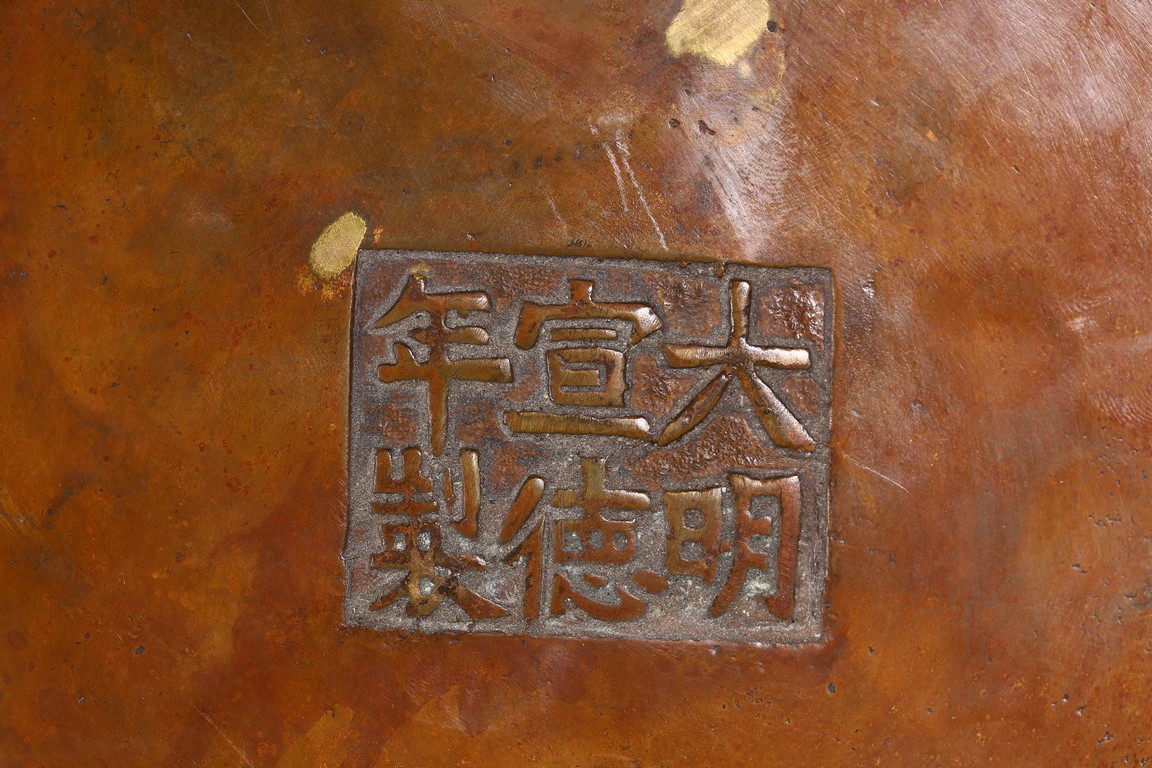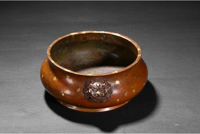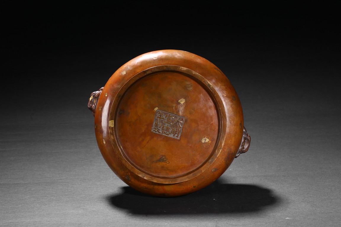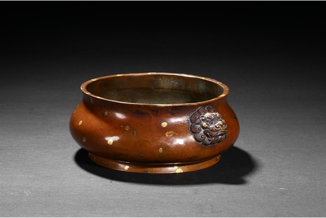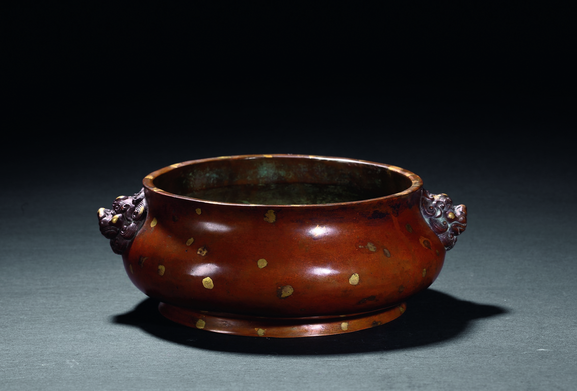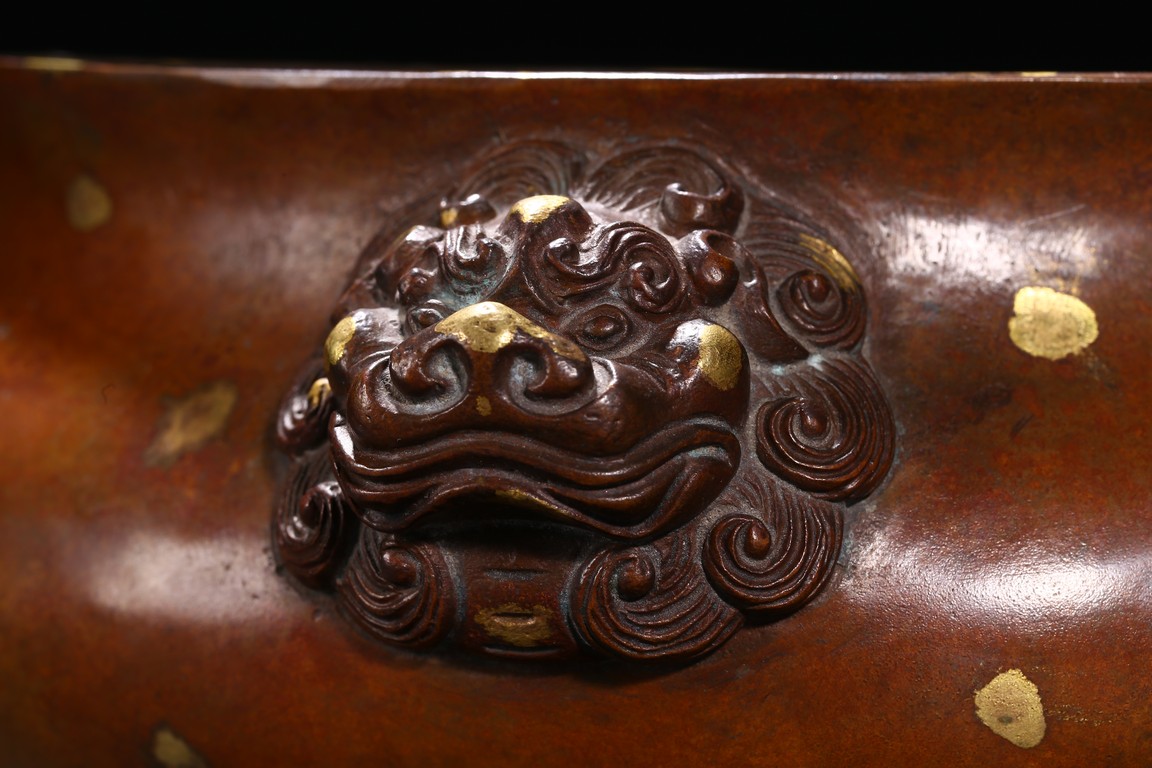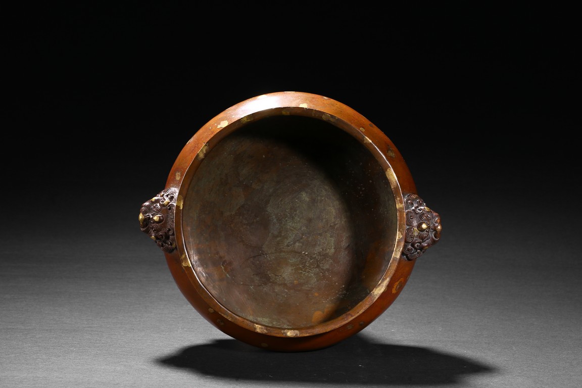 Finely cast with a compressed globular body rising to a flared rim from a short foot,flanked by two lion-head handles,the base with an apocryphal Xuande inscription,the patina of a caramel-brown color with scattered gold splashed spots. Qing Dynasty period.