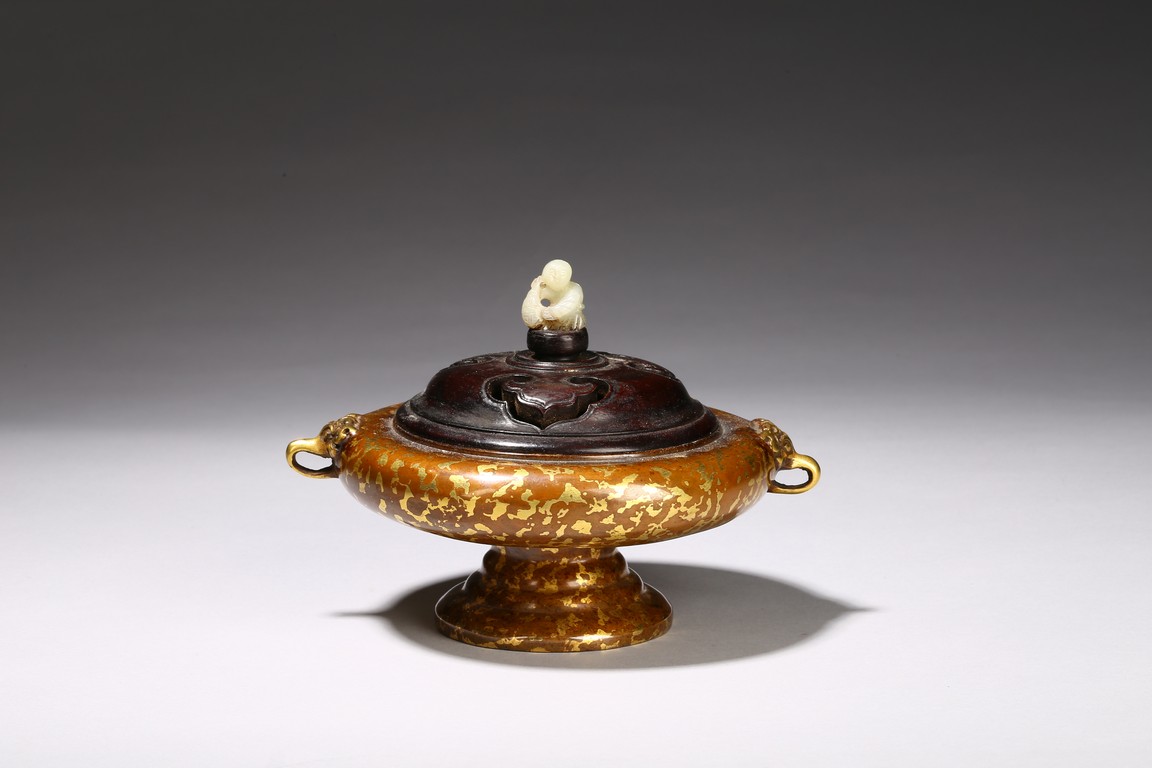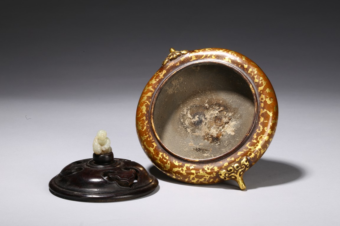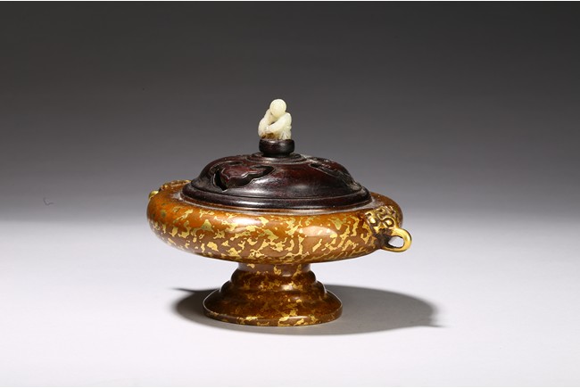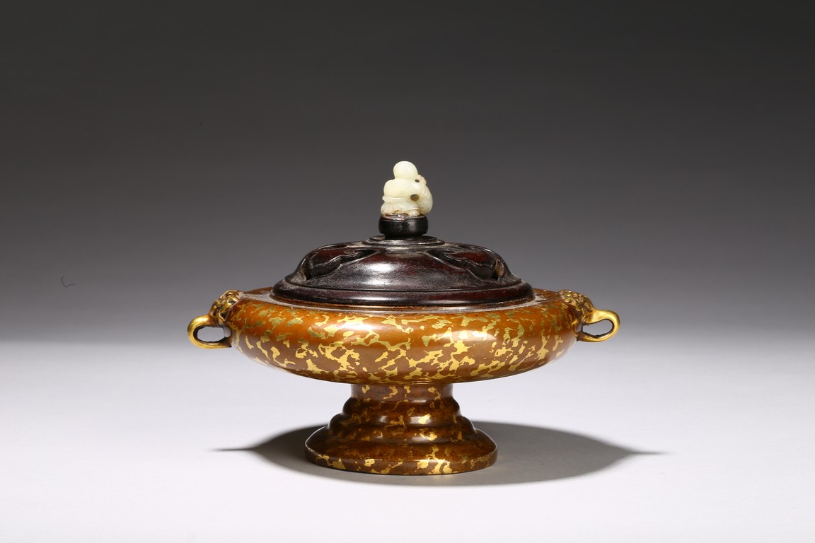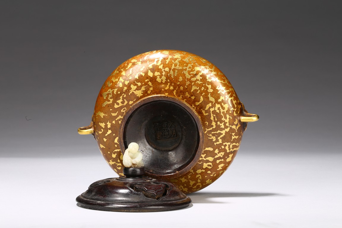 The compressed globular body rising from a high spreading foot,flanked by a pair of elephant handles,fitted with an openwork hardwood cover with top surmounted with a white jade figural finial. The bronze patinated to a rich coppery-brown color and decorated with irregular splashes of gold,the base with six character apocryphal xuande mark. Qing Dynasty period.