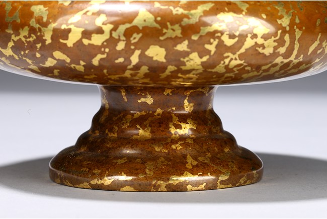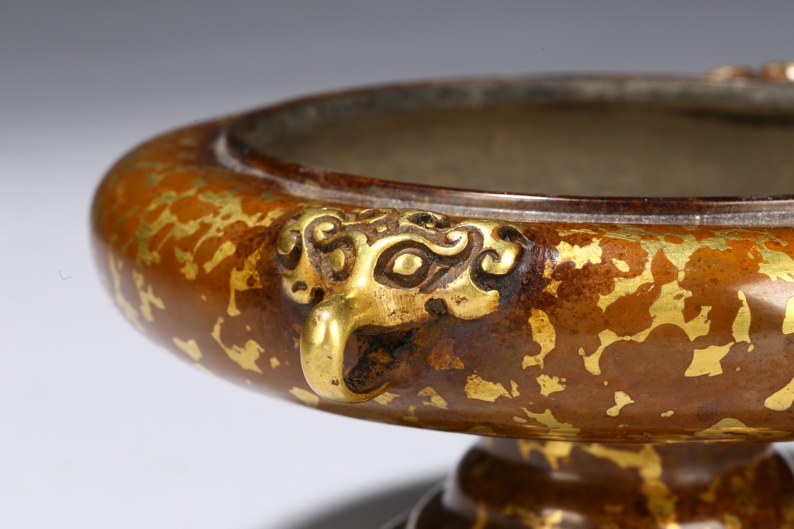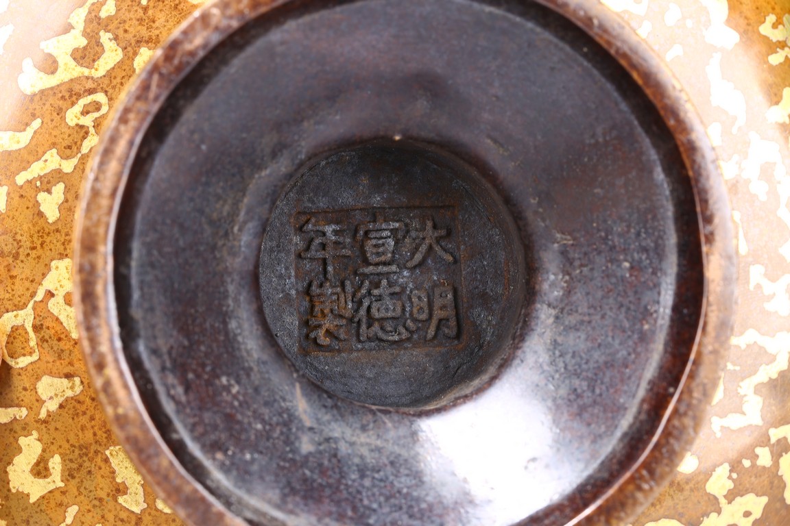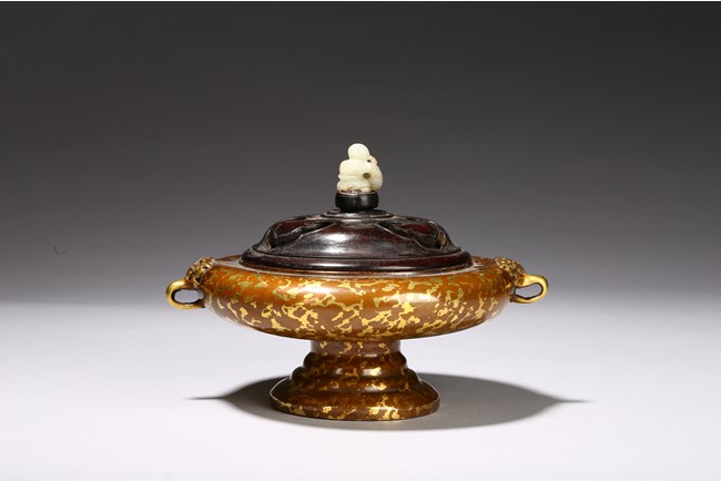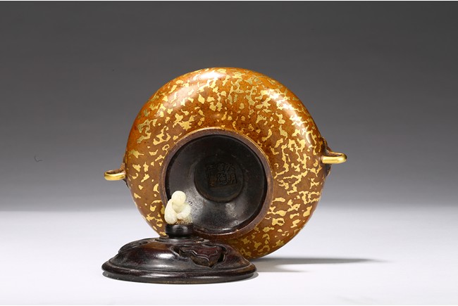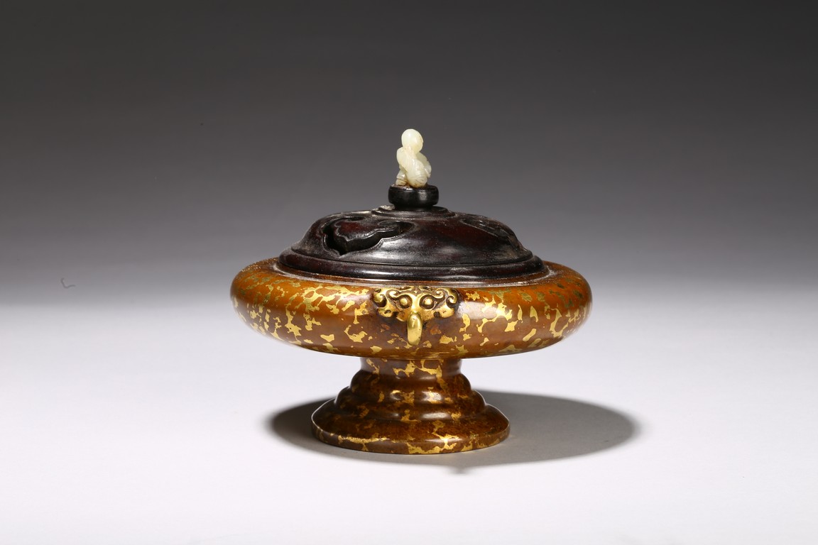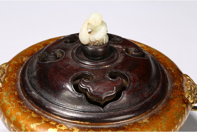 The compressed globular body rising from a high spreading foot,flanked by a pair of elephant handles,fitted with an openwork hardwood cover with top surmounted with a white jade figural finial. The bronze patinated to a rich coppery-brown color and decorated with irregular splashes of gold,the base with six character apocryphal xuande mark. Qing Dynasty period.